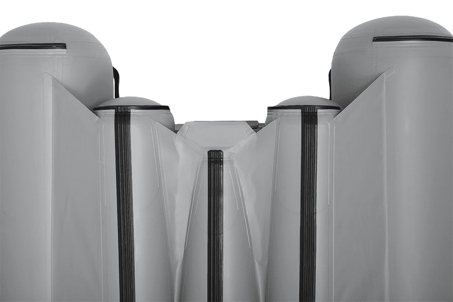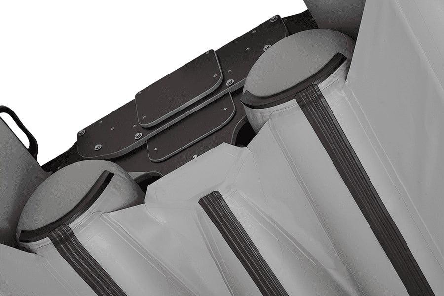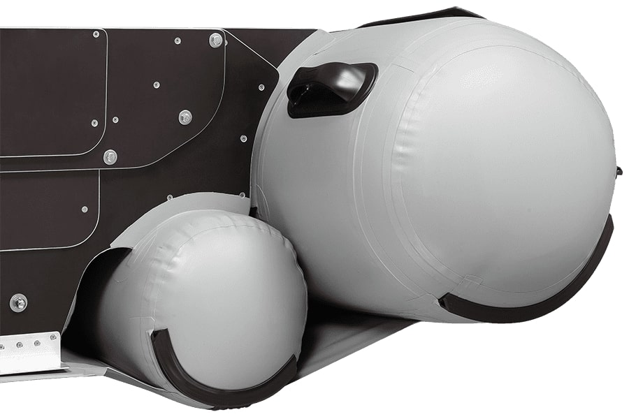 Установленный привальный брус выполняет функцию не только защиты корпуса, но и брызгоотбойника. Срезанная часть центрального баллона имеет плоскую поверхность, переходящую в антикавитационный козырек, благодаря чему заборная часть водомета находится «в тени» корпуса лодки и даже в случае наезда на препятствие не будет повреждена. Благодаря поднятой над уровнем воды самоосушаемой палубе вся случайно попавшая в кокпит вода сливается через 4 шпигата в межбаллонное пространство днища и далее — за борт.