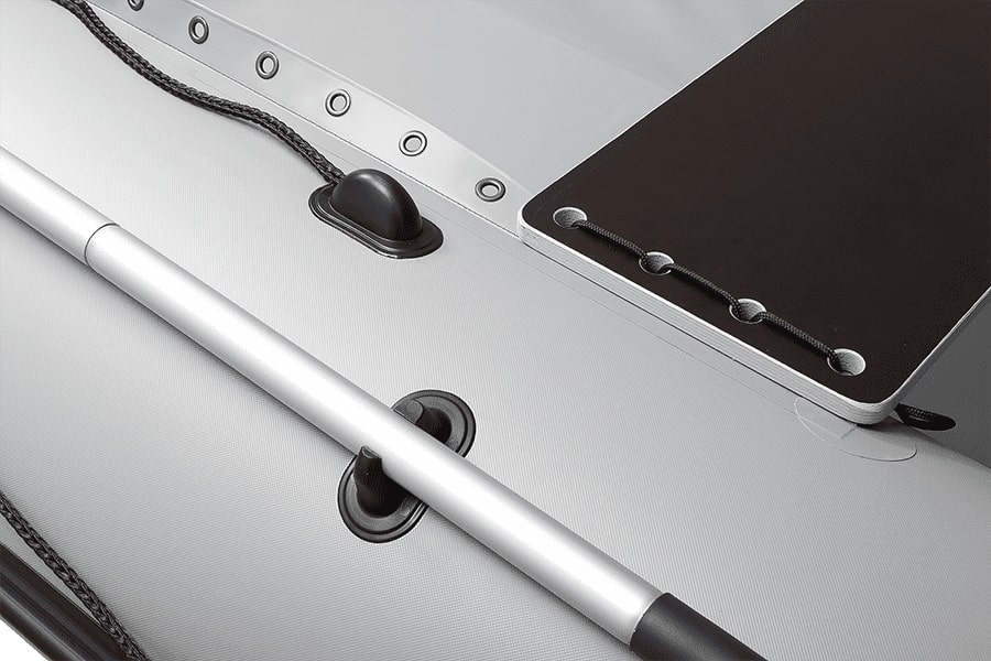 Лодка комплектуется системой крепления сидений (банок) ликпаз/ликтрос. Система крепления ликпаз/ликтрос позволяет перемещать банки по длине кокпита в зависимости от условий эксплуатации, сохраняя при этом надежность их фиксации. Лодка 390 FM Light Jet/L/S комплектуется легкими алюминиевыми веслами со съемной лопастью. Весла устанавливаются в эффективные поворотные уключины, значительно облегчающие процесс гребли.