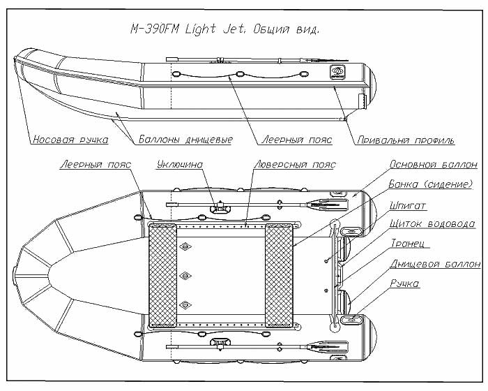 Дополнительная поперечная жесткость надувной лодки обеспечивается шпангоутом, вклеенным в корпус в районе миделя. Он разделяет кокпит на уровне палубы на 2 независимые зоны, ограничивая возможность незапланированного смещения груза и изменения продольной центровки при движении лодки. Также благодаря днищу высокого давления у лодки Фрегат 390 FM Light Jet/L/S самоосушаемая палуба. Конструкция днища высокого давления обеспечивает лодке высокие скоростные характеристики, маневренность, устойчивость на курсе, надежность в условиях экстремальной ситуации. Особенности конструкции днища под водометный движитель — тоннель и антикавитационный козырек. Инновационная конструкция надувного дна позволяет разместить водозаборник водомета «в базе» корпуса лодки. Тоннель водовода к заборной части водомета и жестко вклеенный под углом транец из морской фанеры позволяют устанавливать на лодки FM Light Jet водометный движитель без необходимости доработок.