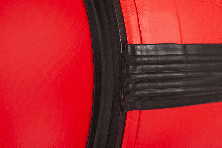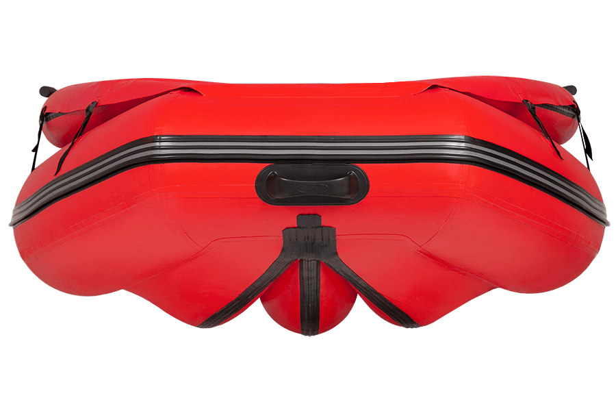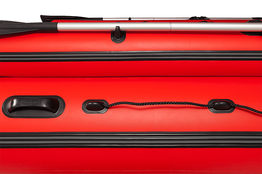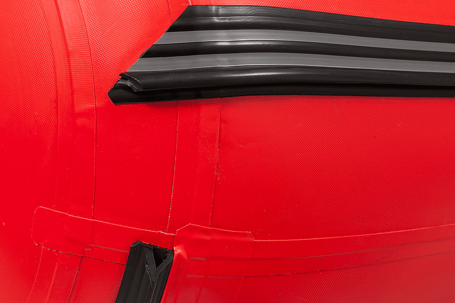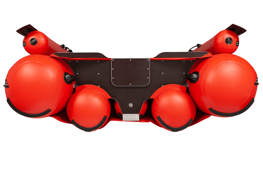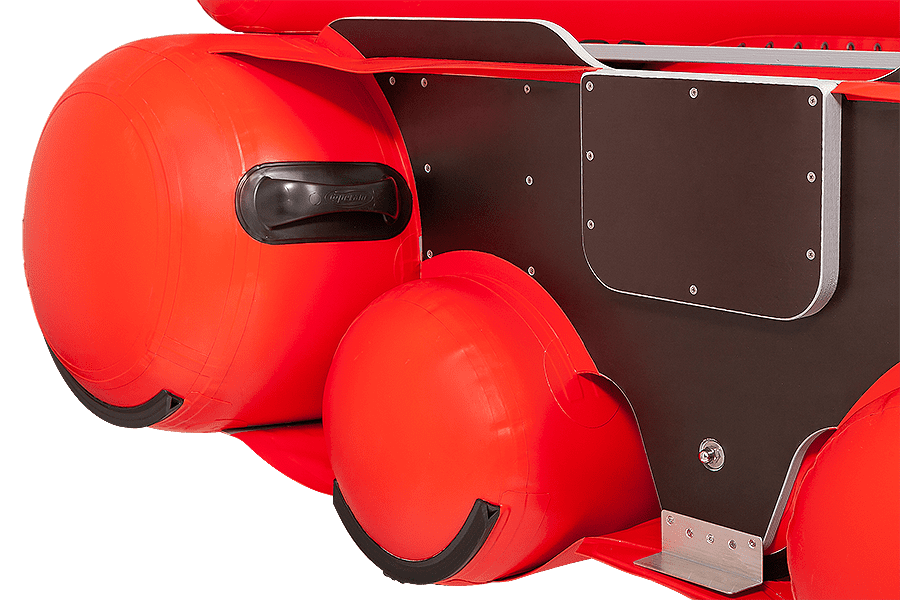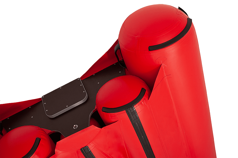 Установленный привальный брус выполняет функцию не только защиты корпуса, но и брызгоотбойника. Срезанная часть центрального баллона имеет плоскую поверхность, переходящую в антикавитационный козырек, благодаря чему заборная часть водомета находится «в тени» корпуса лодки и даже в случае наезда на препятствие не будет повреждена. Благодаря поднятой над уровнем воды самоосушаемой палубе вся случайно попавшая в кокпит вода сливается через 4 шпигата в межбаллонное пространство днища и далее — за борт.