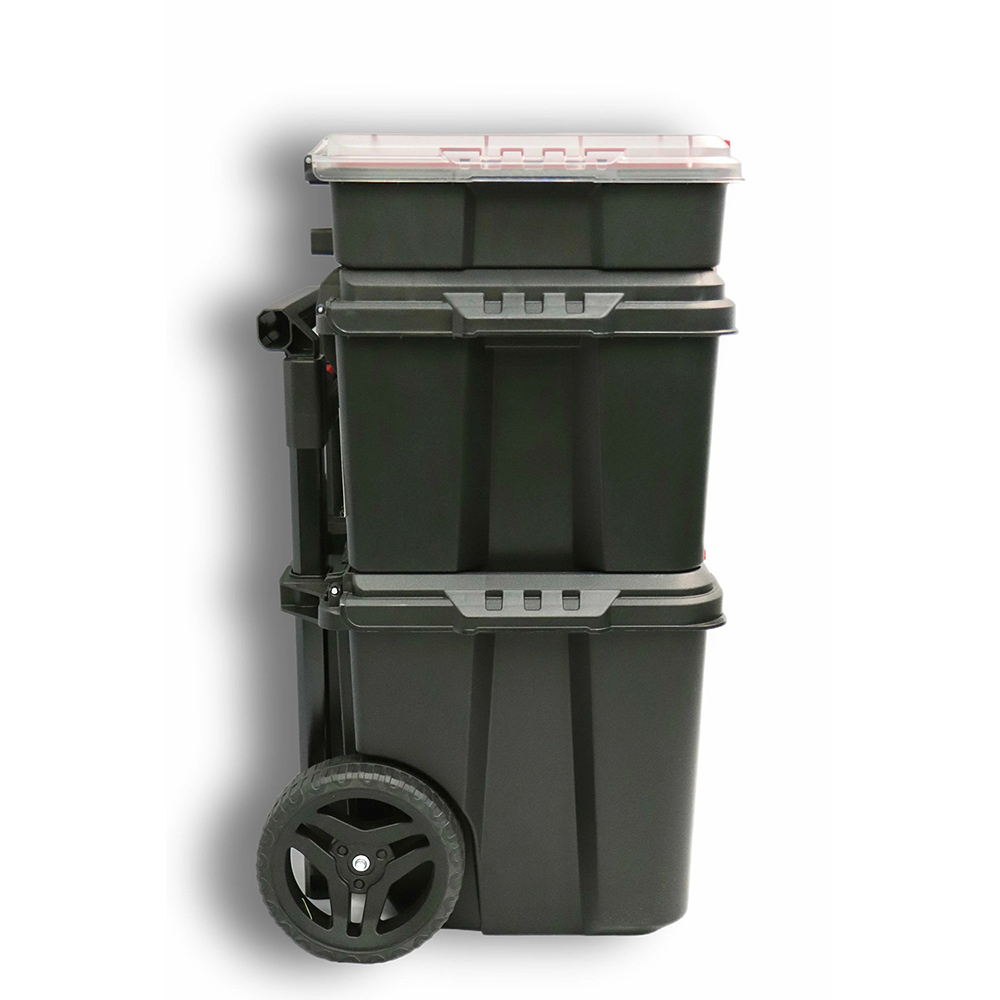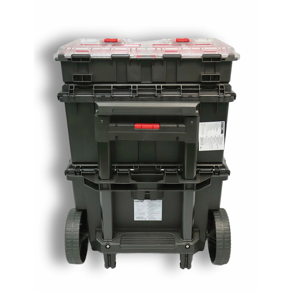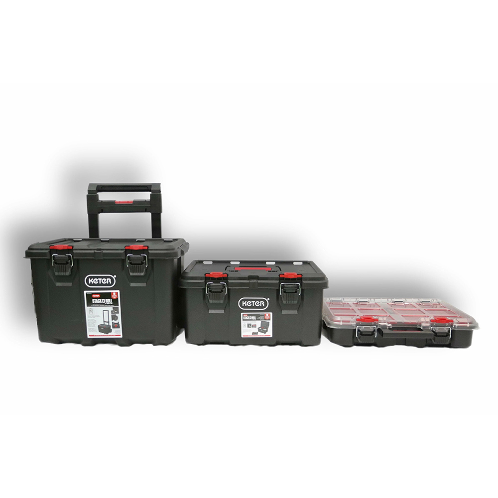 Модульная система Keter Stack's System состоит из трех модулей: Ящик Stack N Roll Органайзер, Ящик Stack N Roll Tool Box и Stack N Roll Mobile Cart. Это позволяет трансформировать систему в соответствии с потребностями пользователя, обеспечивая гибкость и удобство использования.