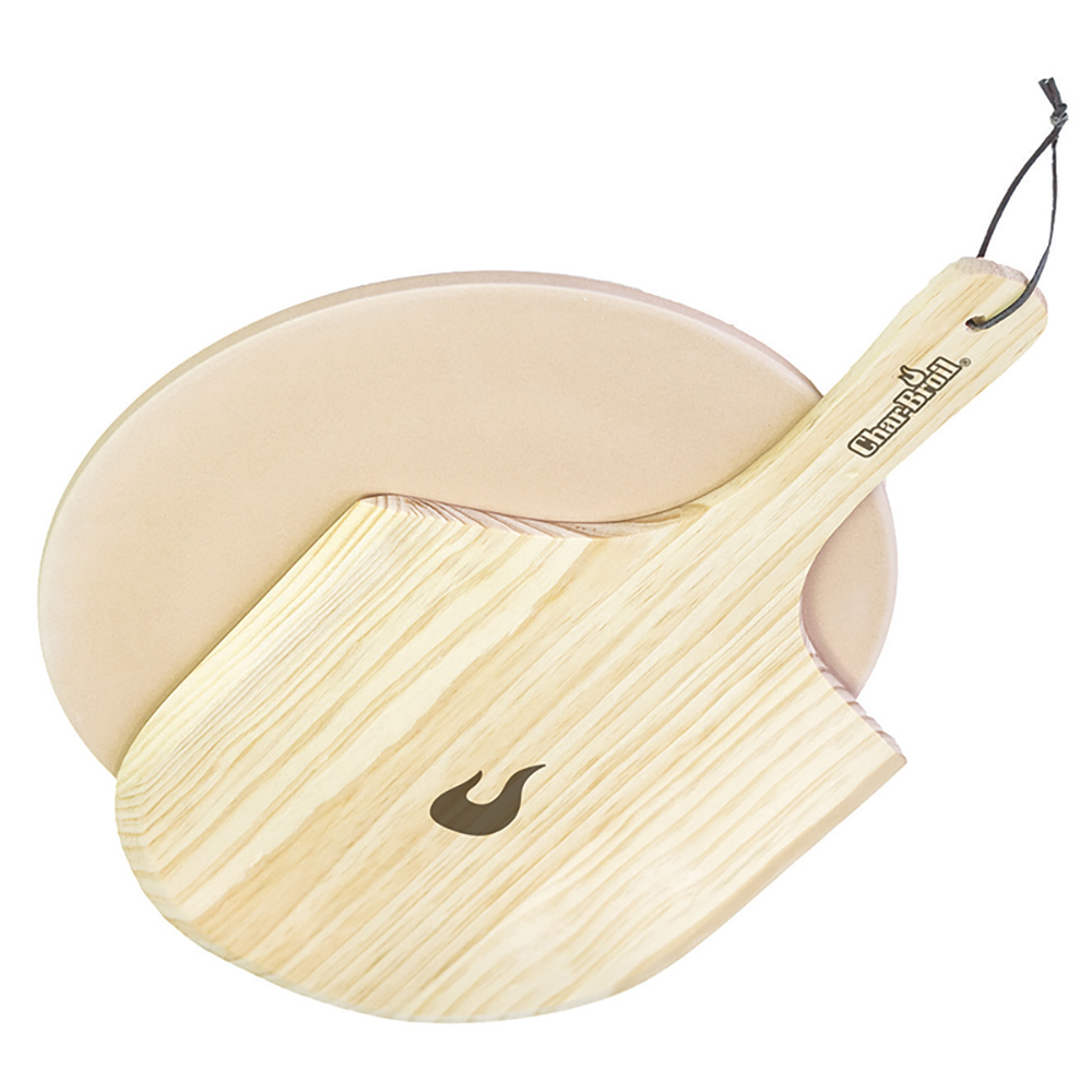Набор включает в себя широкую деревянную лопатку и керамический камень для пиццы, равномерно распределяющий тепло и не дающий блюду пригорать.