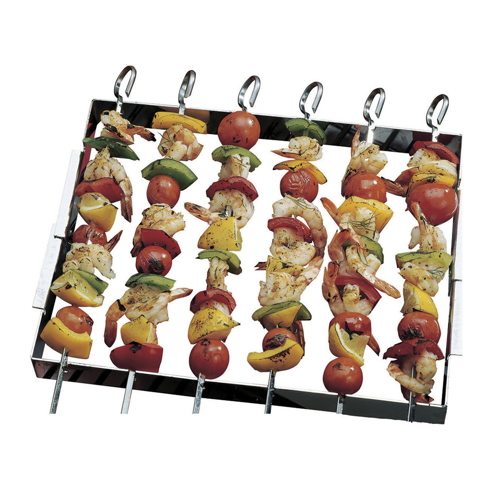 Идеально подходит для приготовления шашлыка, овощей и морепродуктов на шампурах, вмещает 6 шампуров и имеет складную раму для удобства хранения, габариты: 36 см x 19 см x 5 см.