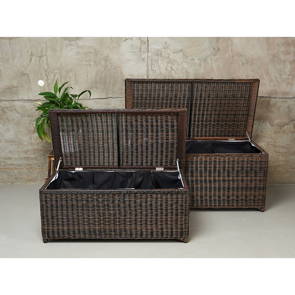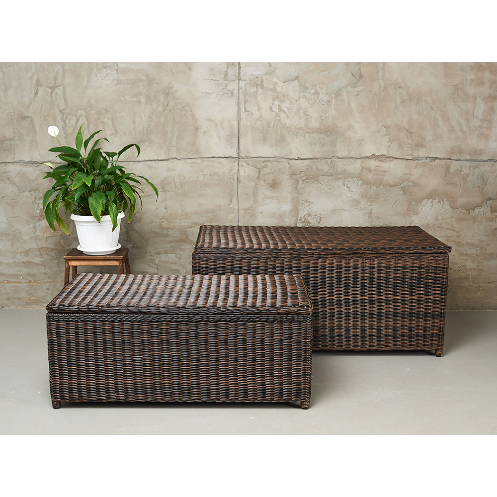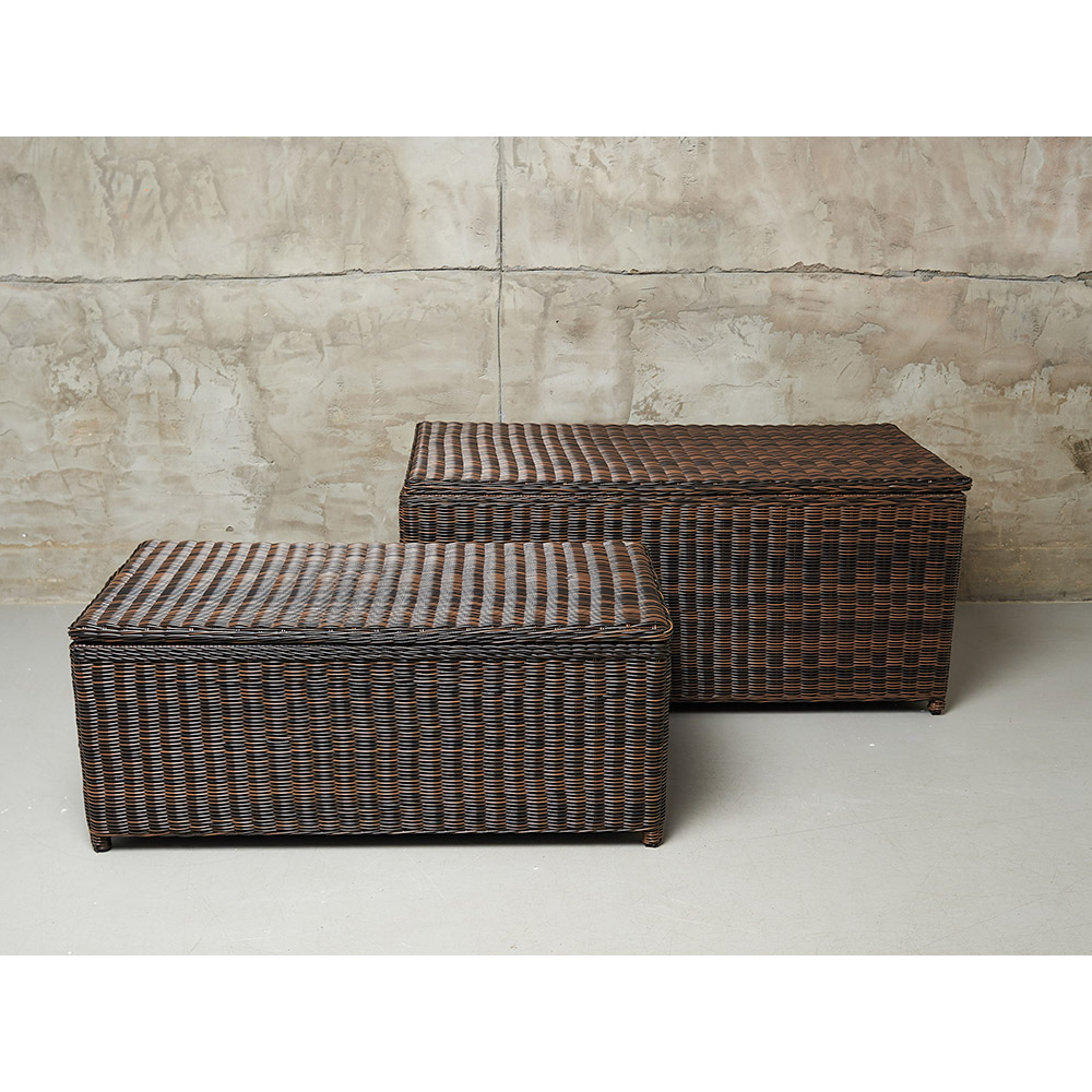 KARL (140 и 120) набор темно-коричневый. Сундуки выполнены из высококачественного круглого искусственного ротанга на алюминиевом каркасе. Ручное плетение. Сундуки очень вместительные, внутри одно отделение. Крышки у сундуков с механизмом газлифт. В сундуках удобно хранить, например, подушки от уличной мебели, постельные принадлежности и даже вещи. Предназначены для террас и веранд загородных домов, могут использоваться как в помещении, так и на улице, в саду. Искусственный ротанг не боится влаги, прямых солнечных лучей, мороза. Не требует особого ухода. Легко моется.