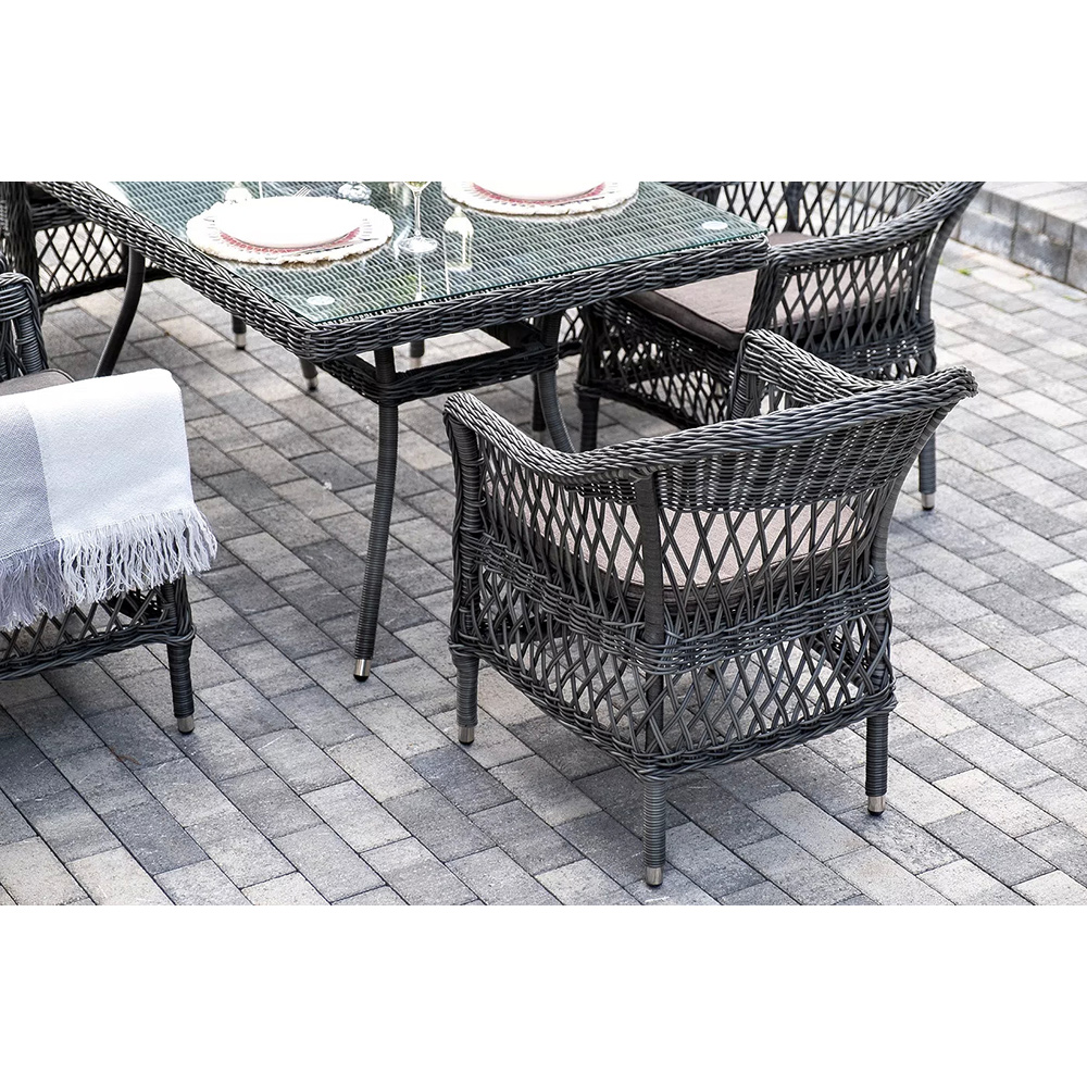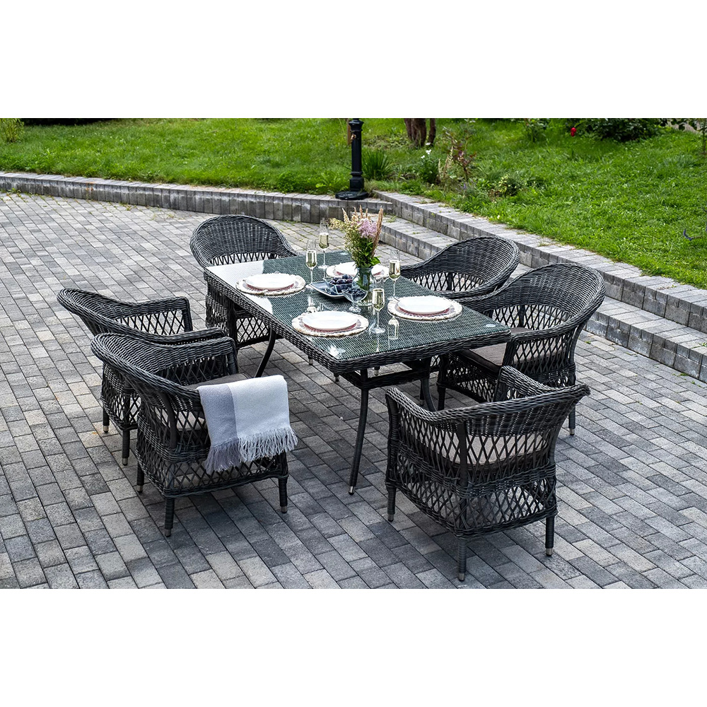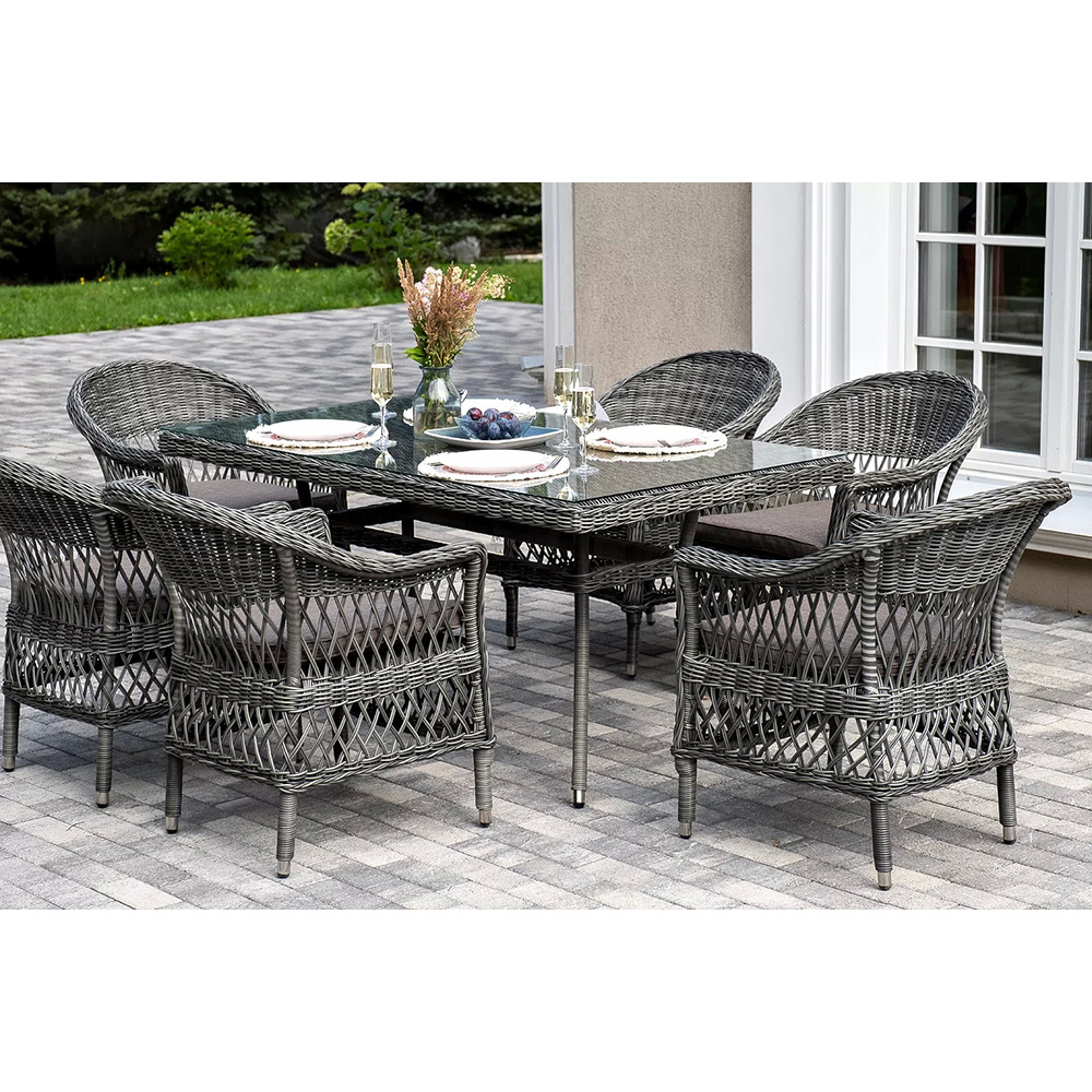 Обеденная группа «Амароне» относится к числу садовой мебели для обустройства открытых террас и веранд.В комплект входят:- обеденный стол «Латте» – 1600×900×750 мм.- шесть стульев «Сицилия», размер каждого – 590×640×820 мм.Алюминий используется при создании прочного каркаса мебели. Оформлен ручным плетением из круглого искусственного ротанга графитового цвета.На креслах расположились мягкие подушки серо-коричневого оттенка. Их чехлы изготовлены из полиэстера, плотность которого 230гр/м2. Ткань проходит обработку влагоотталкивающими составами.В качестве рабочей поверхности плетеного обеденного стола выступает стеклянная столешница, которая крепится при помощи вакуумных силиконовых держателей и поставляется в собранном виде.
