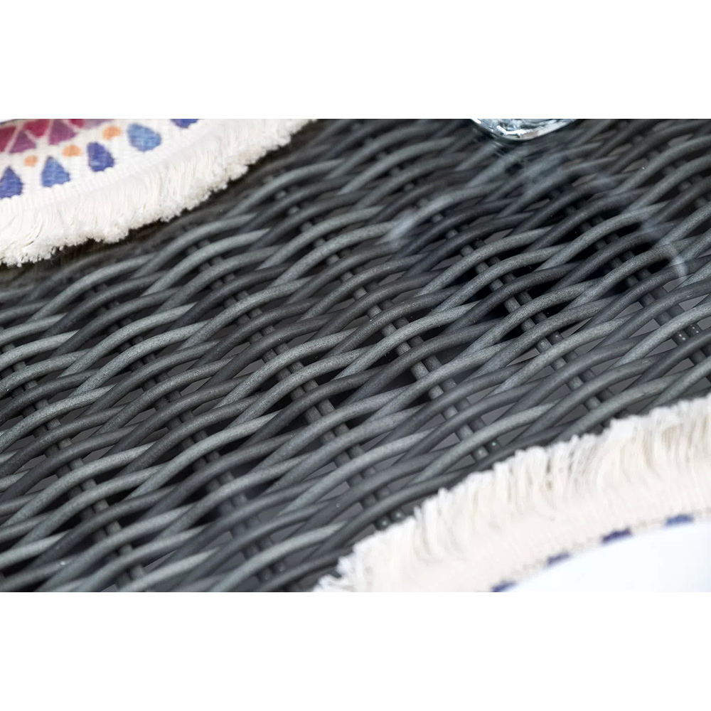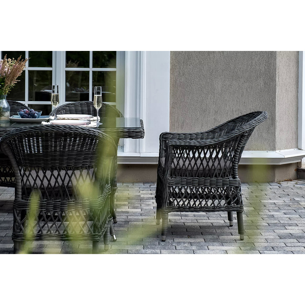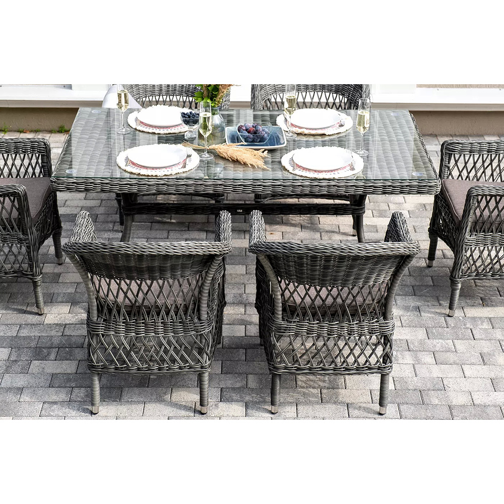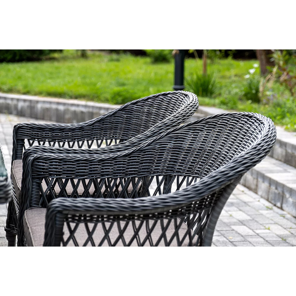 Обеденная группа «Амароне» относится к числу садовой мебели для обустройства открытых террас и веранд.В комплект входят:- обеденный стол «Латте» – 1600×900×750 мм.- шесть стульев «Сицилия», размер каждого – 590×640×820 мм.Алюминий используется при создании прочного каркаса мебели. Оформлен ручным плетением из круглого искусственного ротанга графитового цвета.На креслах расположились мягкие подушки серо-коричневого оттенка. Их чехлы изготовлены из полиэстера, плотность которого 230гр/м2. Ткань проходит обработку влагоотталкивающими составами.В качестве рабочей поверхности плетеного обеденного стола выступает стеклянная столешница, которая крепится при помощи вакуумных силиконовых держателей и поставляется в собранном виде.