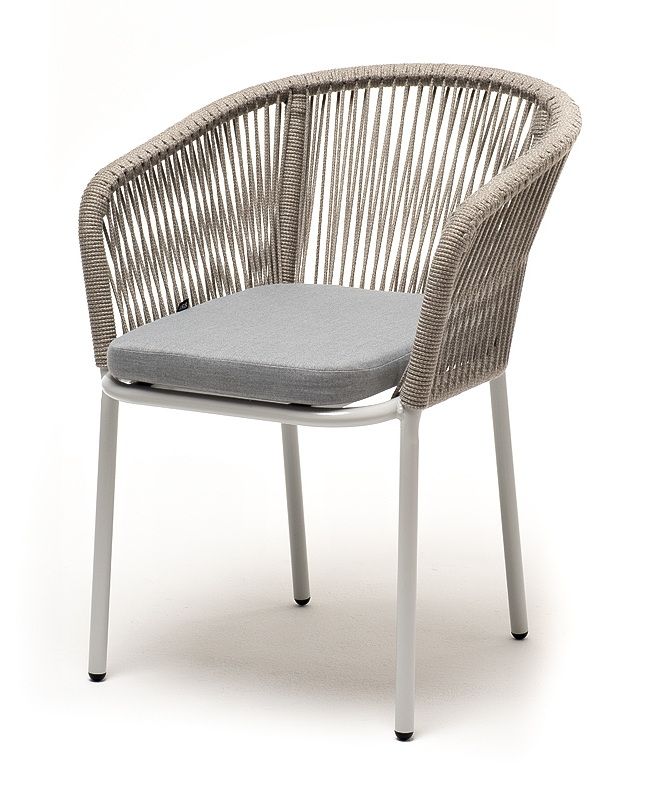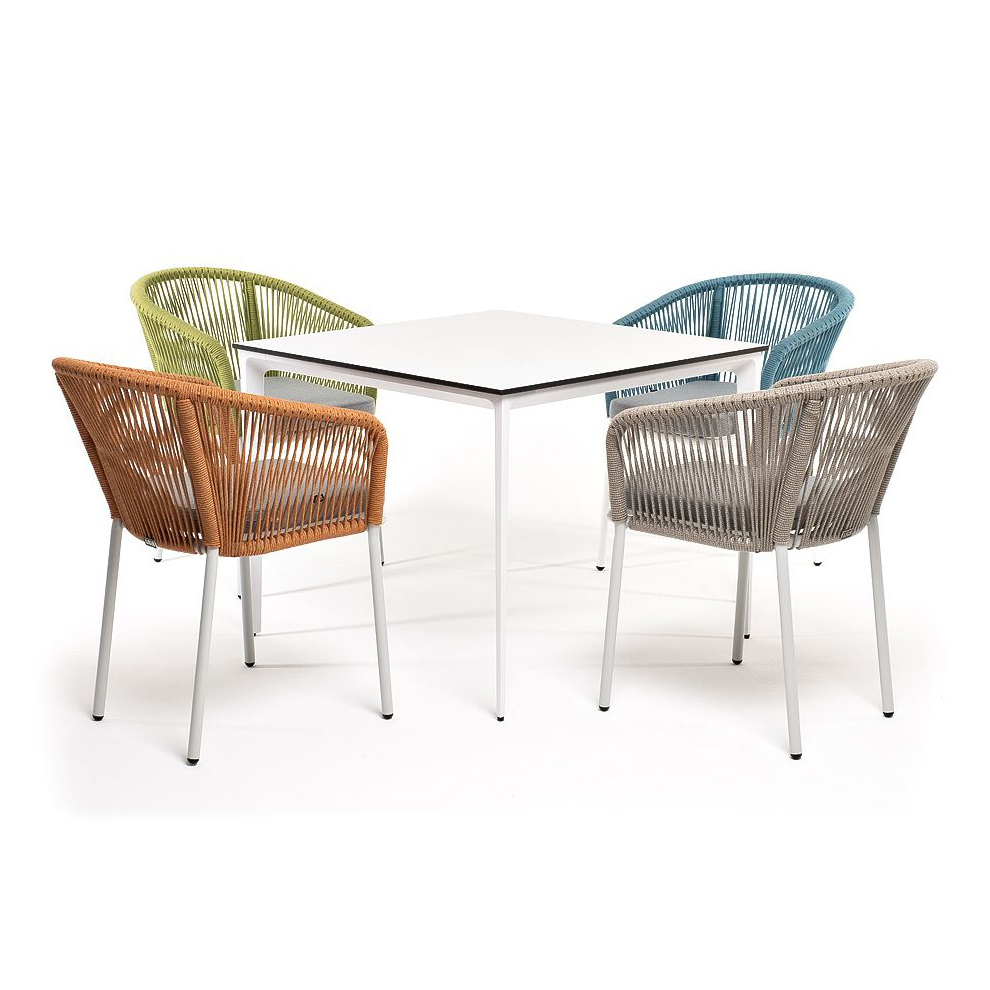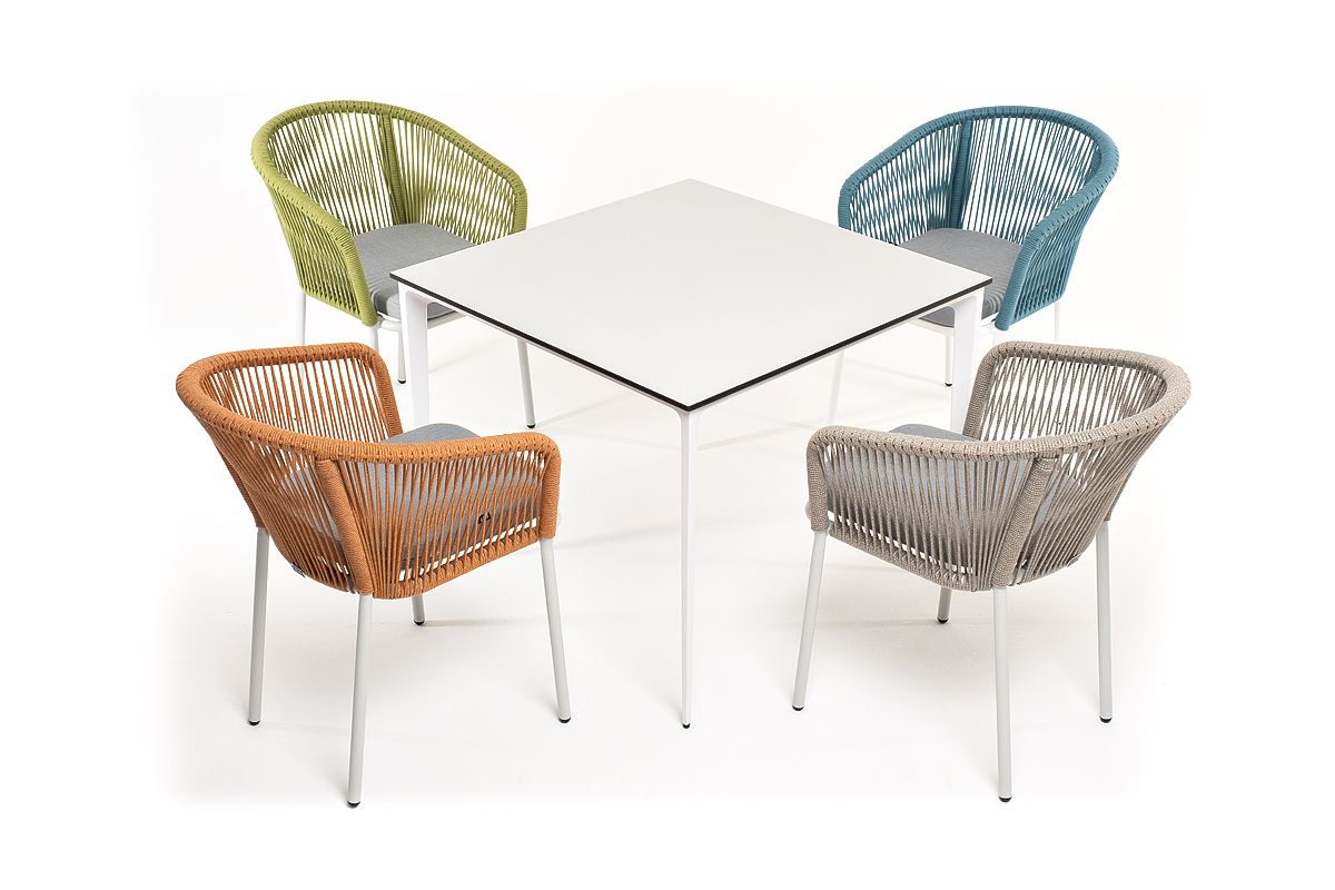 Комплект "Аркобалено" для обустройства обеденной зоны, рассчитан на 4 персоны.В комплект входят:- стол из HPL "Малага" 900х900х750 мм- стул "Марсель", роуп салатовый меланж - 570х620х775 мм- стул "Марсель", роуп бирюзовый - 570х620х775 мм- стул "Марсель", роуп оранжевый меланж - 570х620х775 мм- стул "Марсель", роуп серый меланж - 570х620х775 ммСтолешница стола "Малага" выполнена из современного высококачественного монолитного компакт-пластик HPL, толщиной 12 мм в молочном цветом. Материал устойчив к высоким температурам, попаданию влаги и может использоваться при любых погодных условиях. Подстолье изготовлено из крашеного алюминия белого цвета.Каркас стульев выполнен из алюминия. Оплетка выполнена вручную современным материалом - роупом. Цвет оплетки - бирюзовый, салатовый меланж, оранжевый меланж и серый меланж. В комплект входят подушки со съёмными водоотталкивающими чехлами светло-серого цвета.