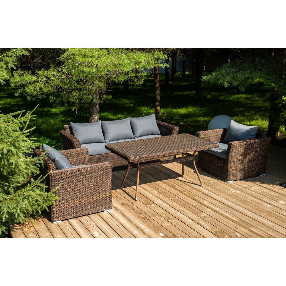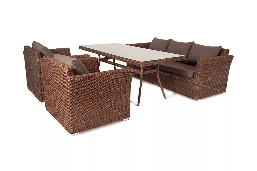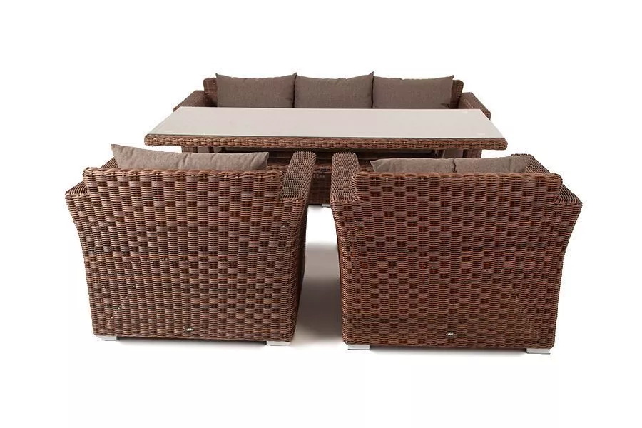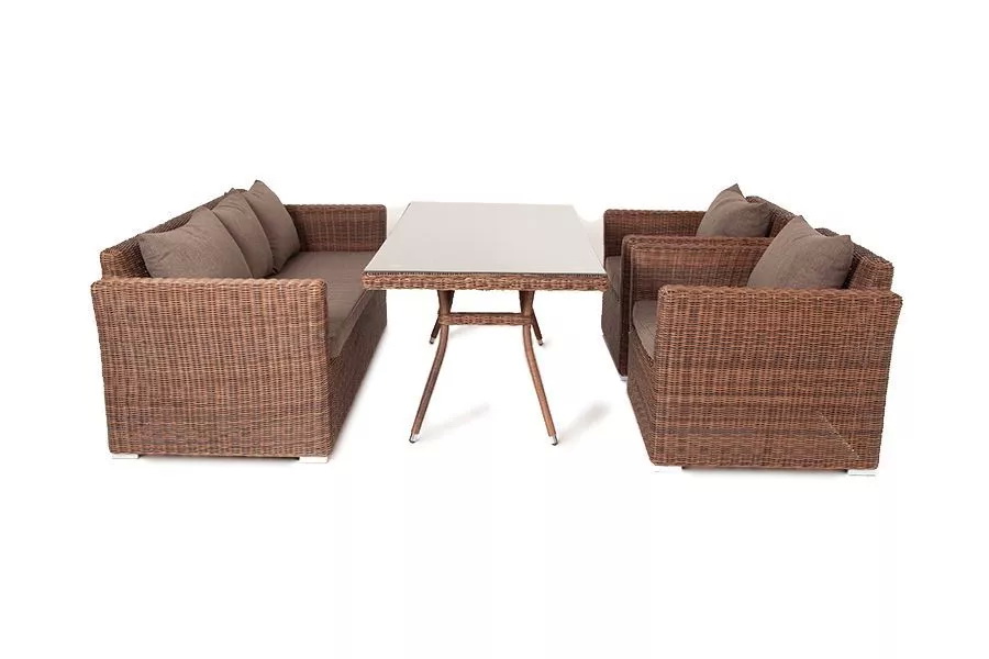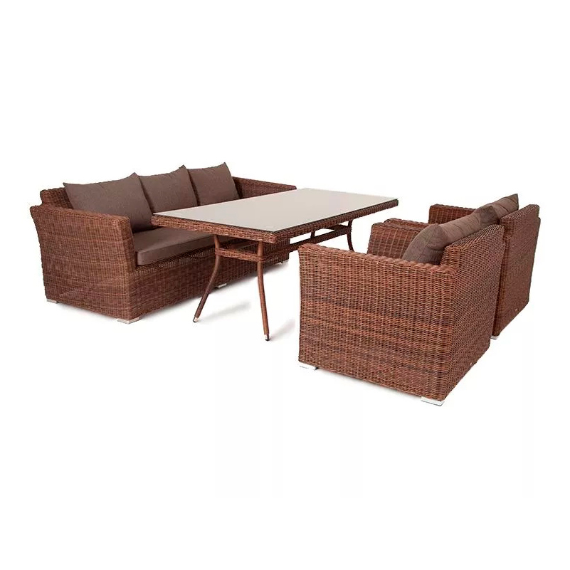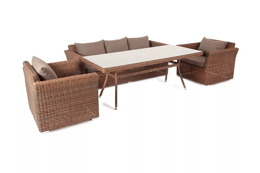 В комплект обеденной группы входит один обеденный стол, один трехместный диван, два кресла и подушки.