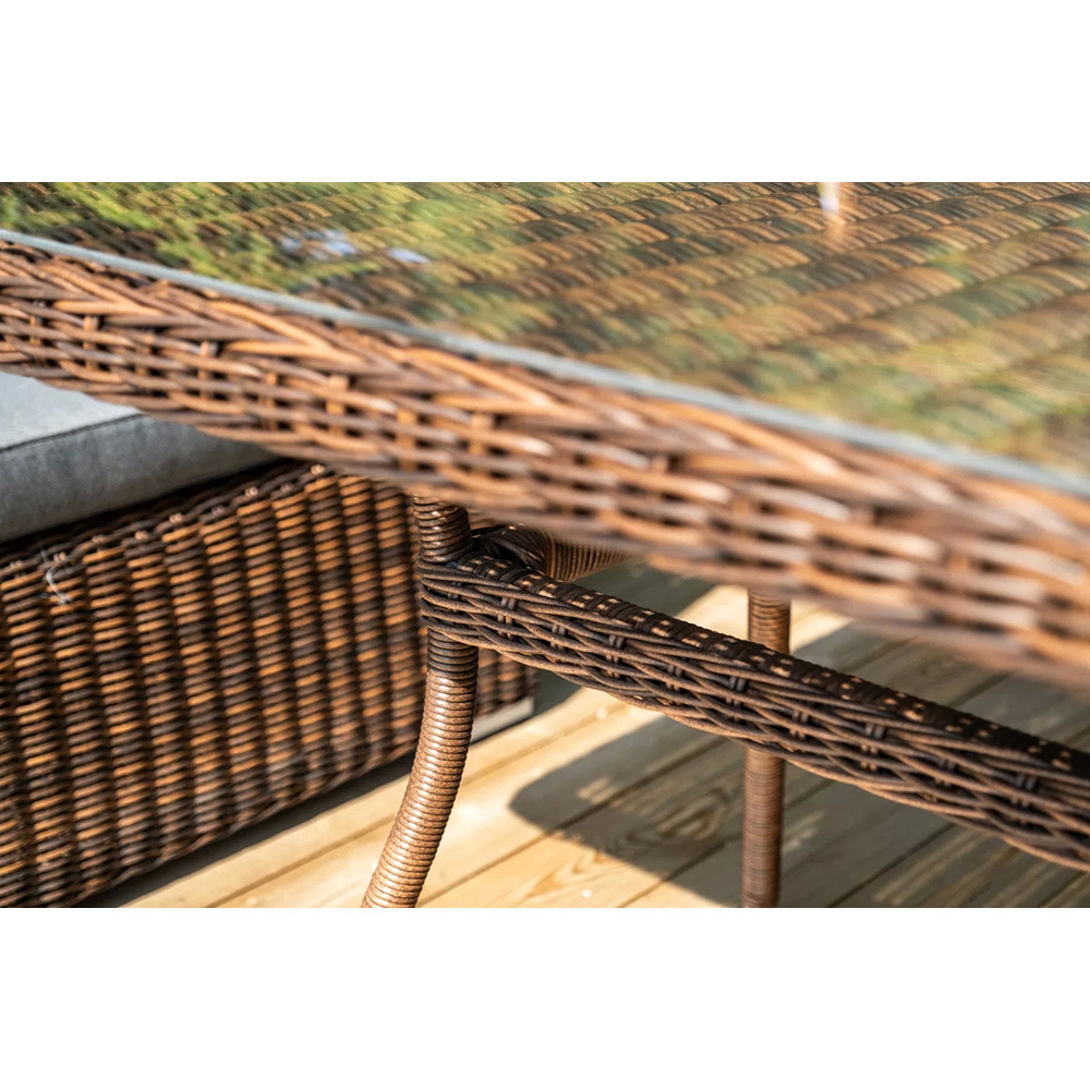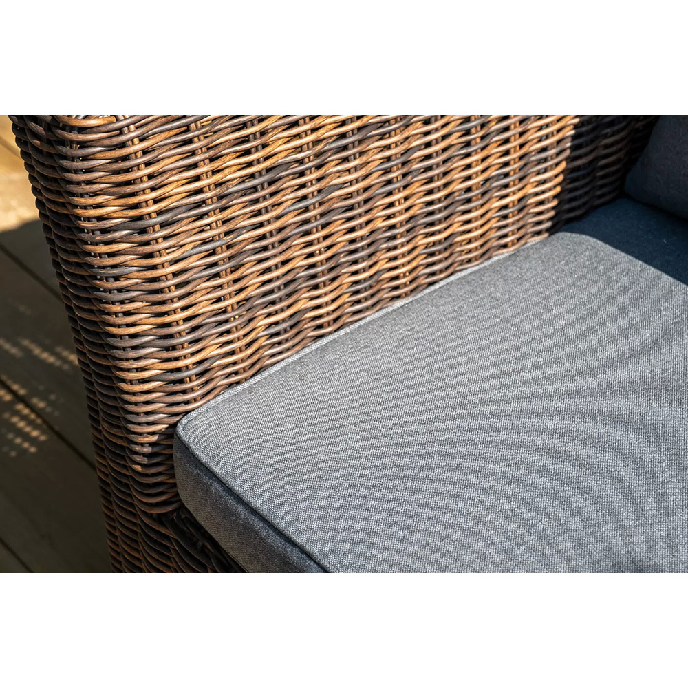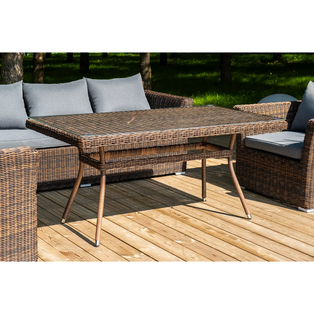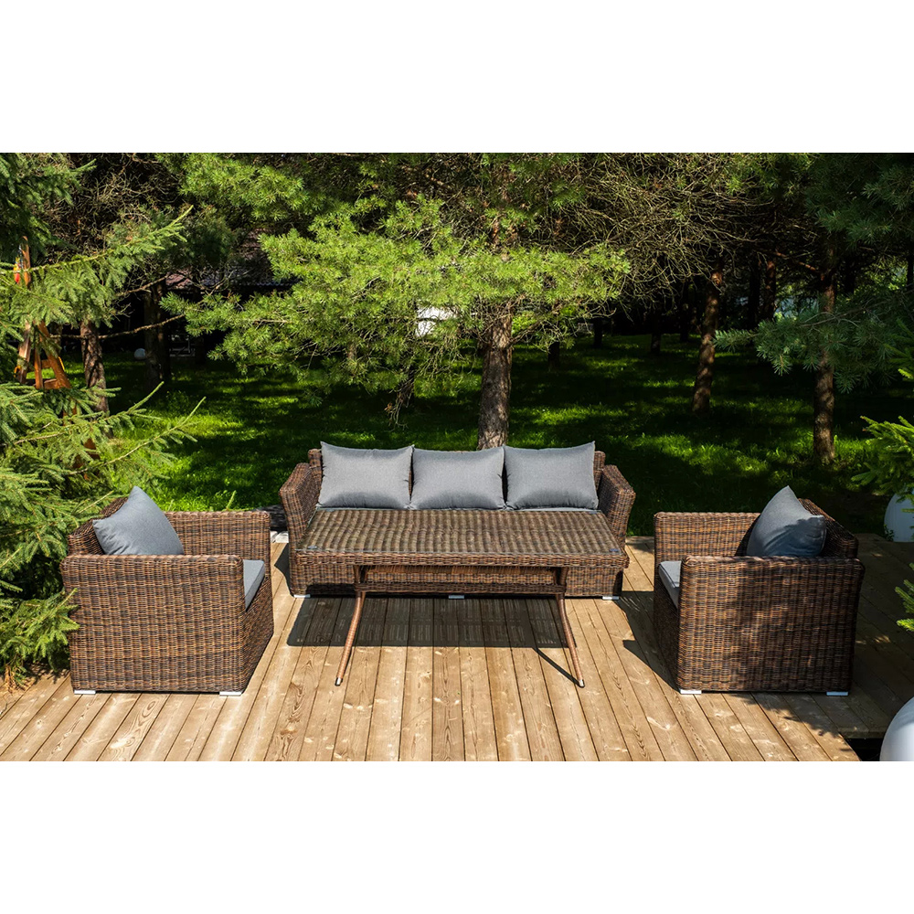 В комплект обеденной группы входит один обеденный стол, один трехместный диван, два кресла и подушки.