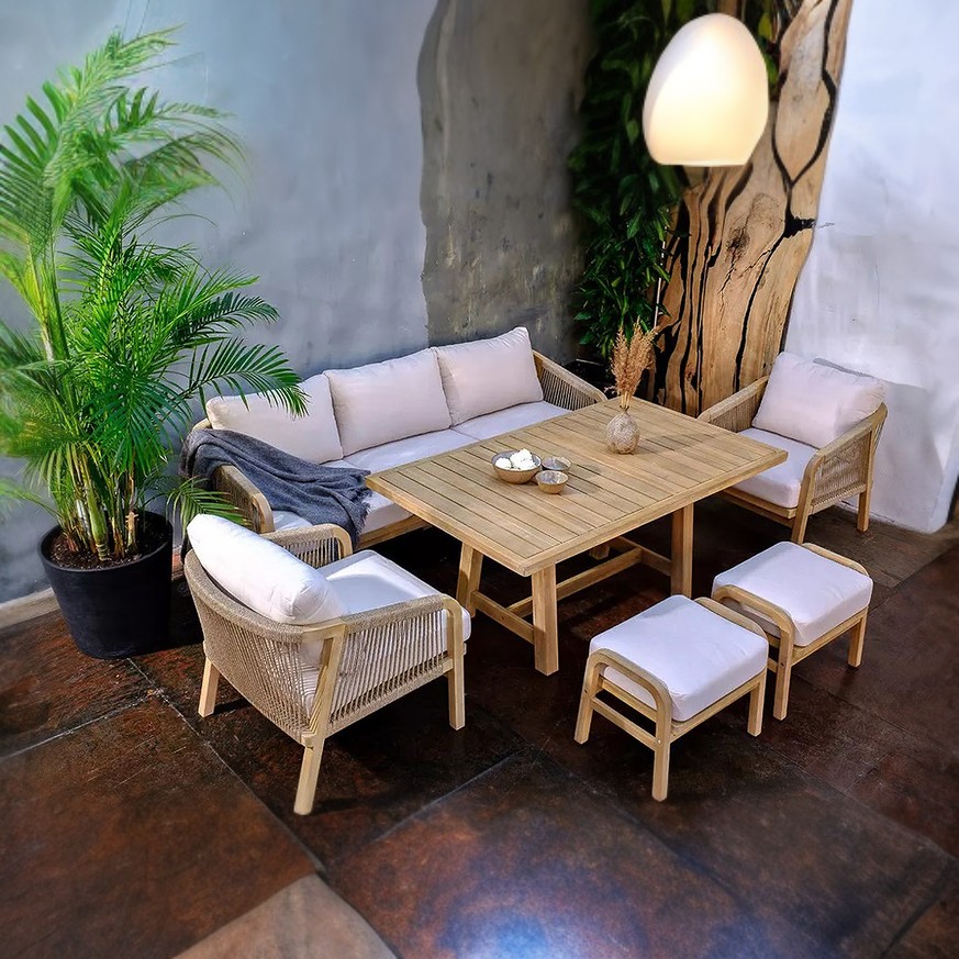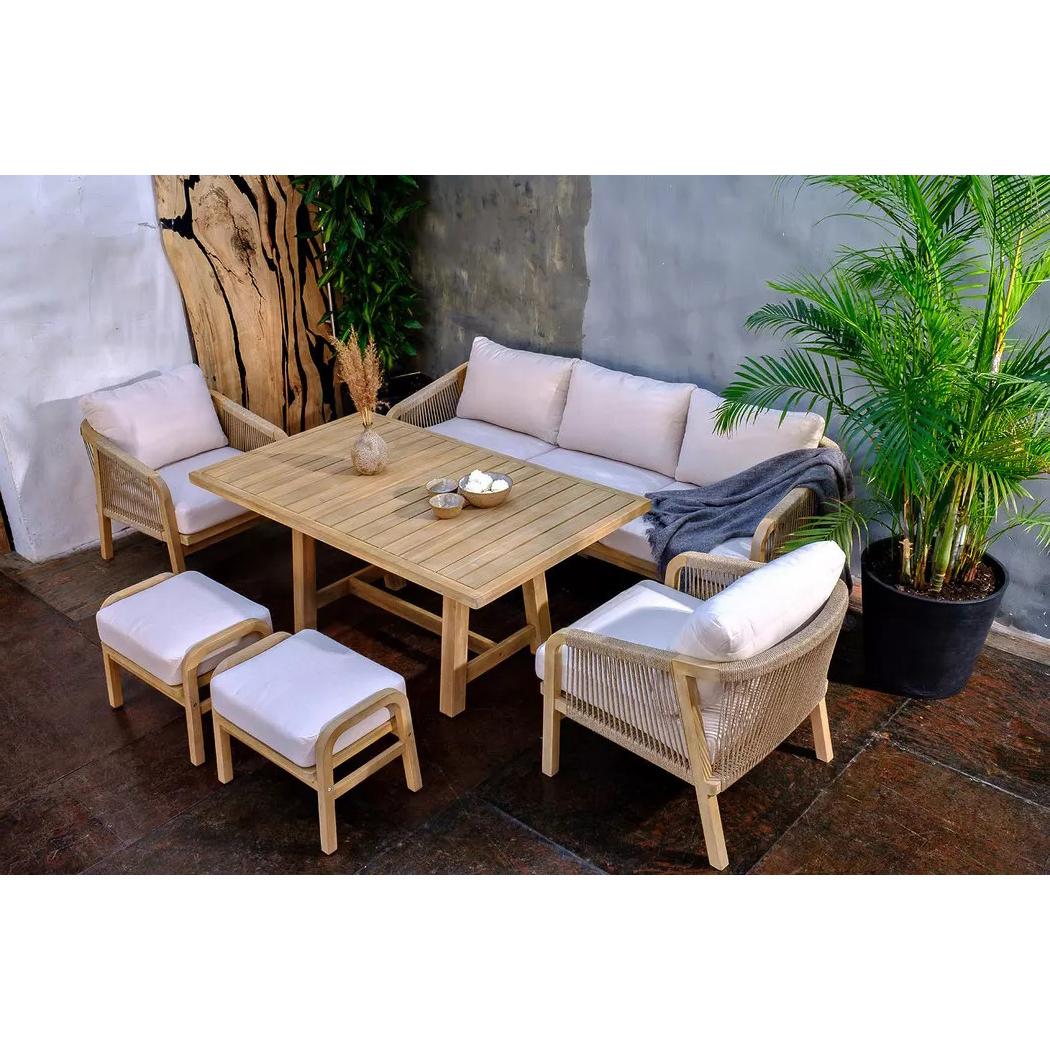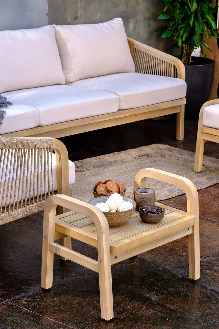 RIMINI – современная коллекция садовой мебели из акации, выполненная в комбинации натурального веревочного плетения rope, массива акации и бежевых подушек.