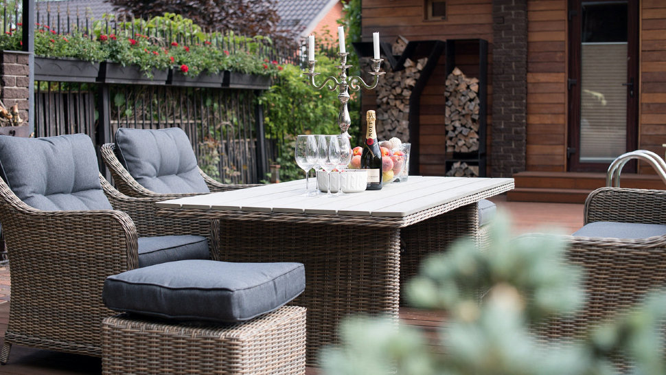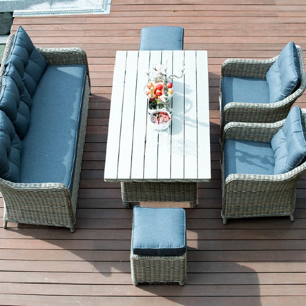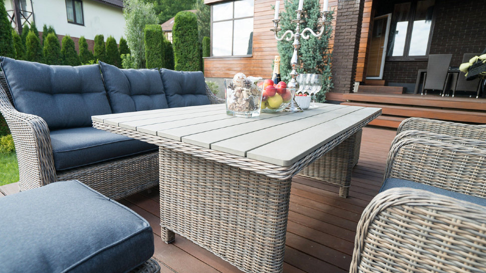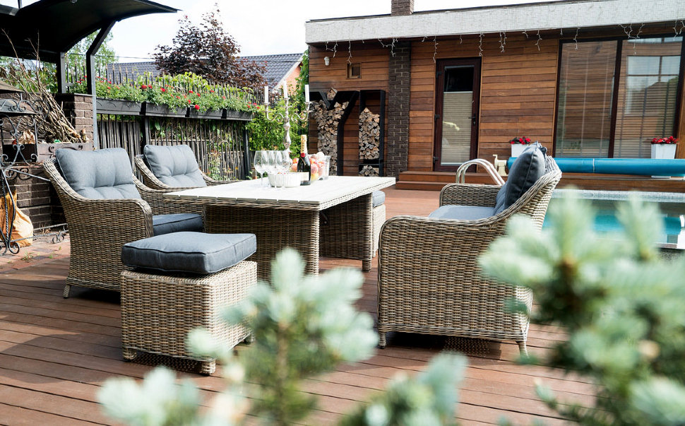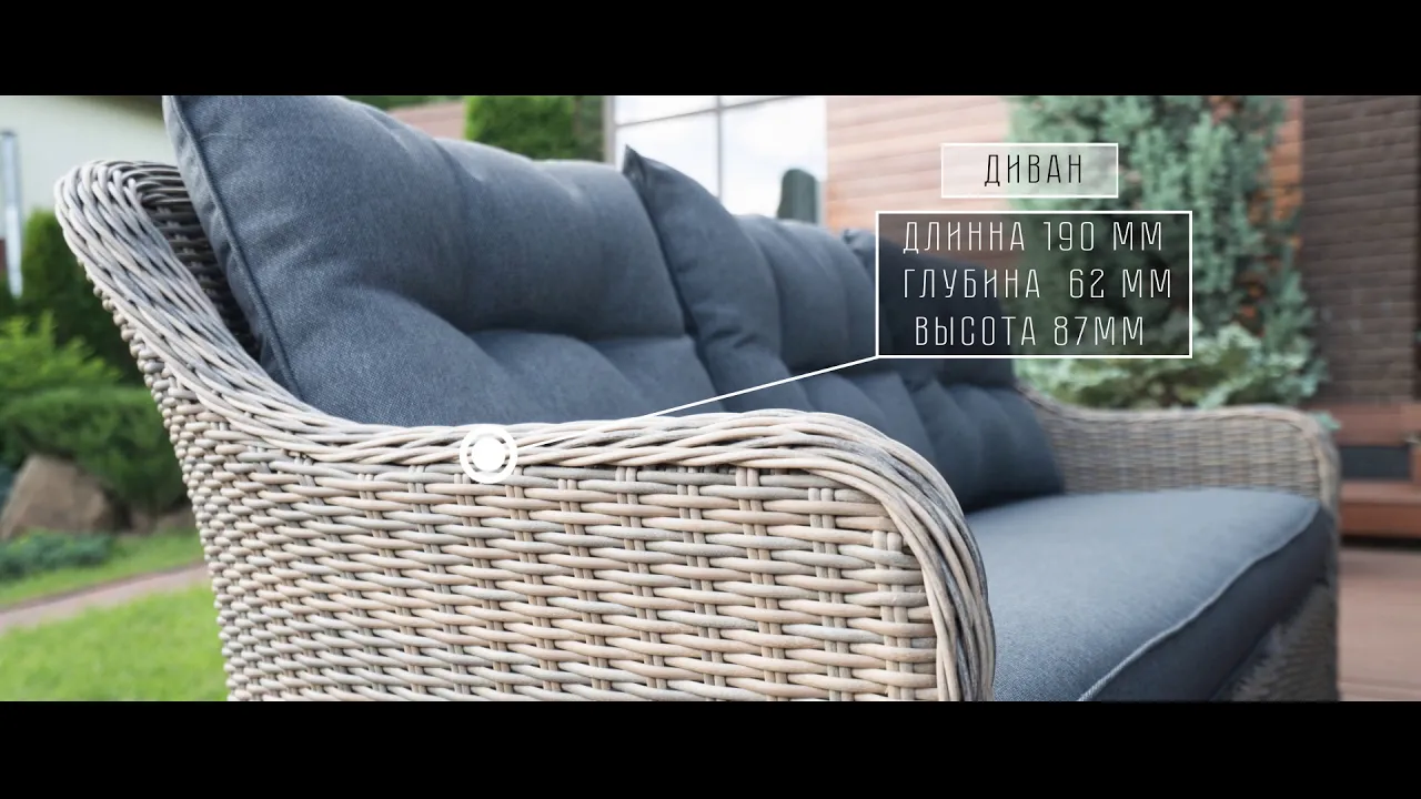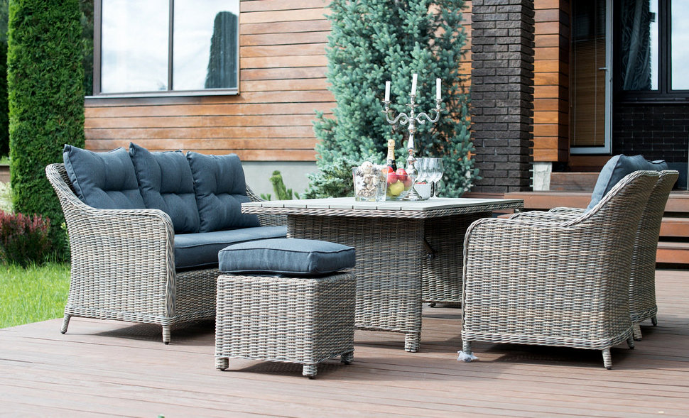 КомплектацияОбеденный стол, два кресла, один диван (трехместный), два пуфика, подушки