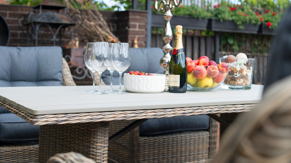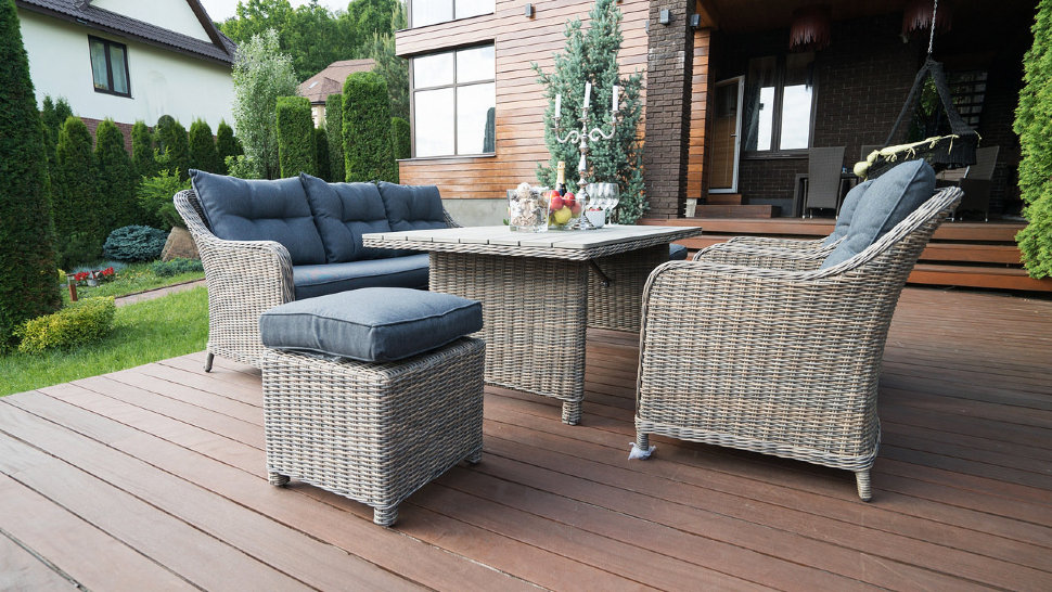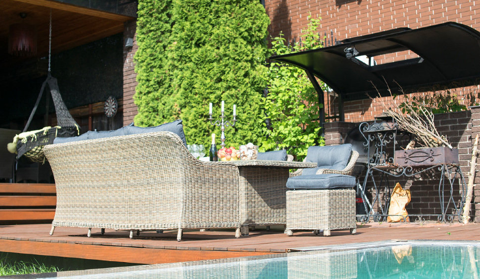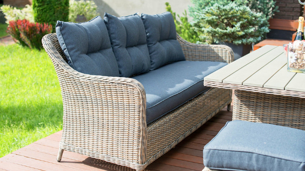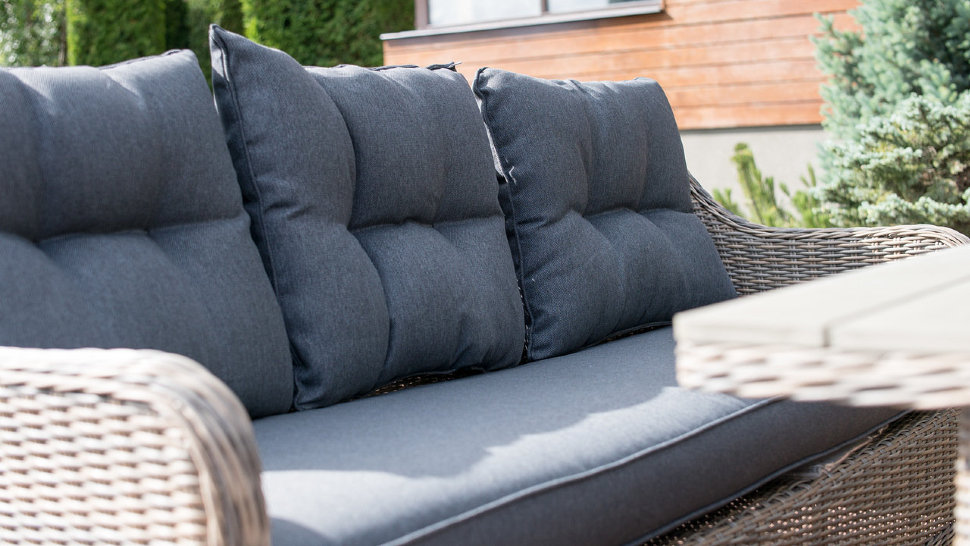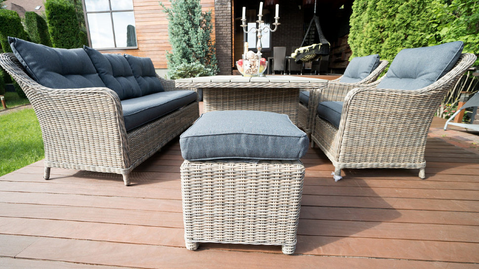 Удобный комплект садовой мебели Sardinia способен вместить даже самую большую компанию. В комплект входит трехместный диван, 2 кресла и 2 пуфа. Мебель изготовлена из износостойкого искусственного ротанга и оснащена каркасом из алюминия, что придает конструкции особую прочность и легкость. Диван, кресла и пуфы укомплектованы удобными подушками.