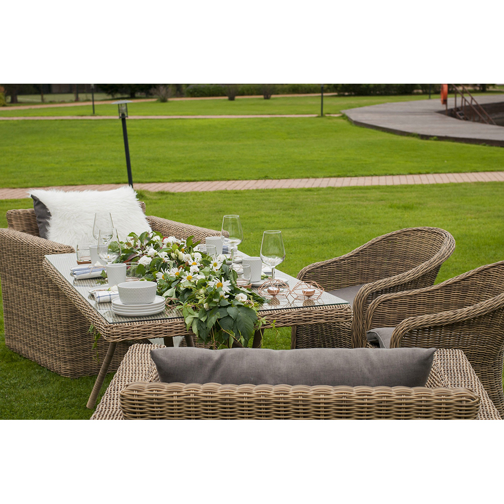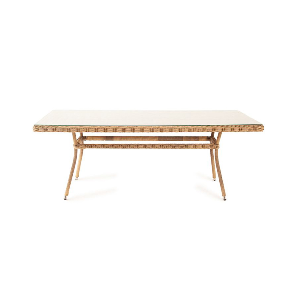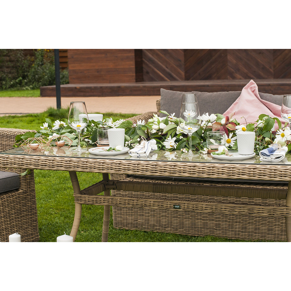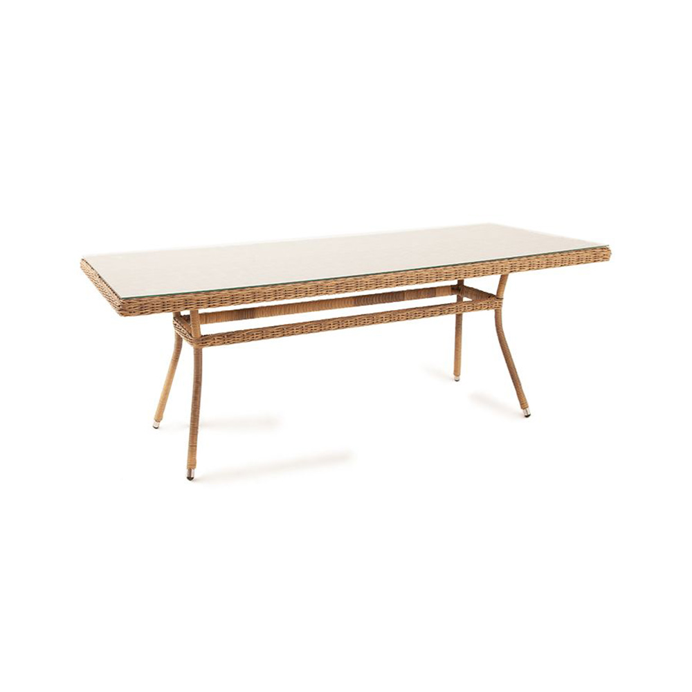 Уличный обеденный стол «Латте» для большой компании.Каркас изделия изготовлен из алюминия, благодаря чему большой стол удобно перемещать. В качестве оплетки использован искусственный ротанг круглого ручного плетения в натуральном соломенном оттенке.Материал устойчив к перепадам погоды, прямым солнечным лучам, атмосферным осадкам, легко моется. Столешница изготовлена из прочного стекла, толщиной 5 мм.