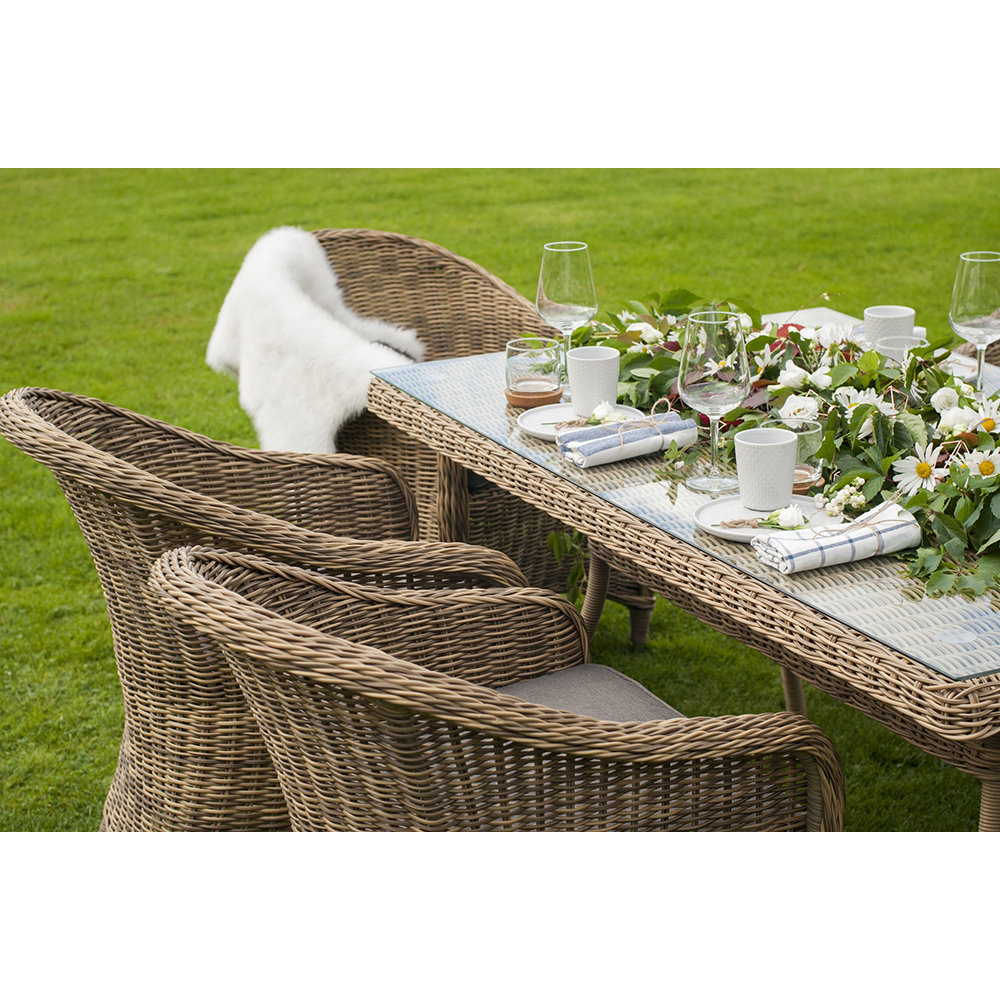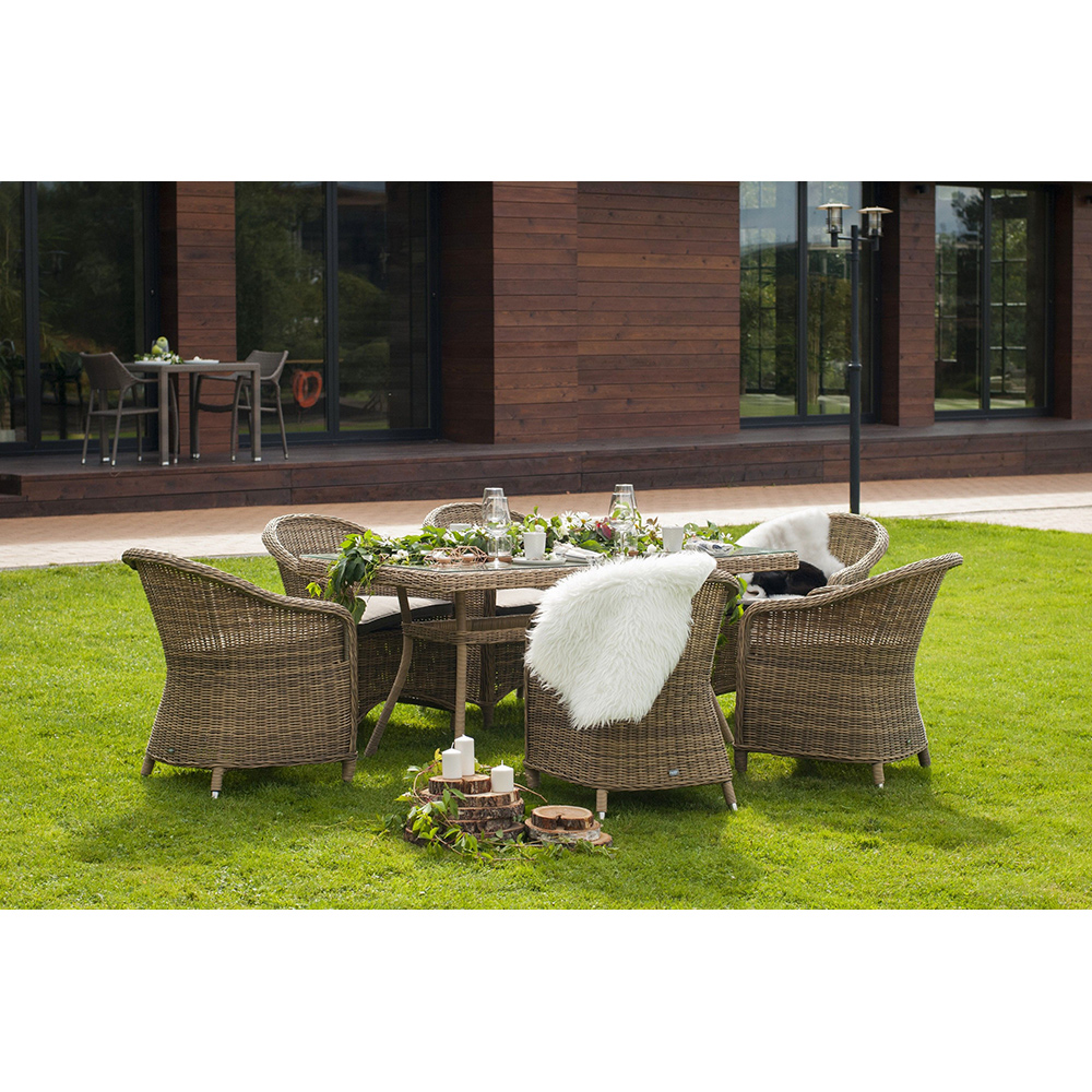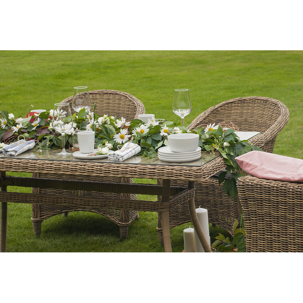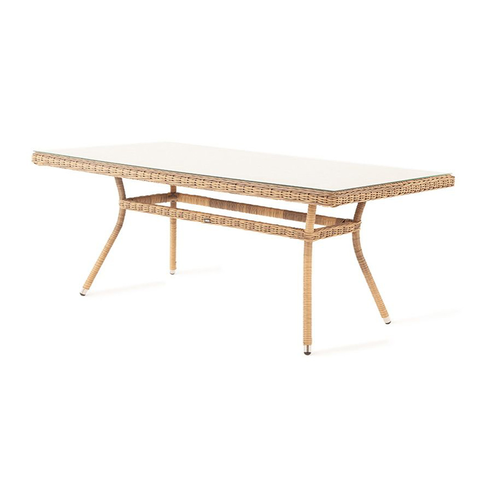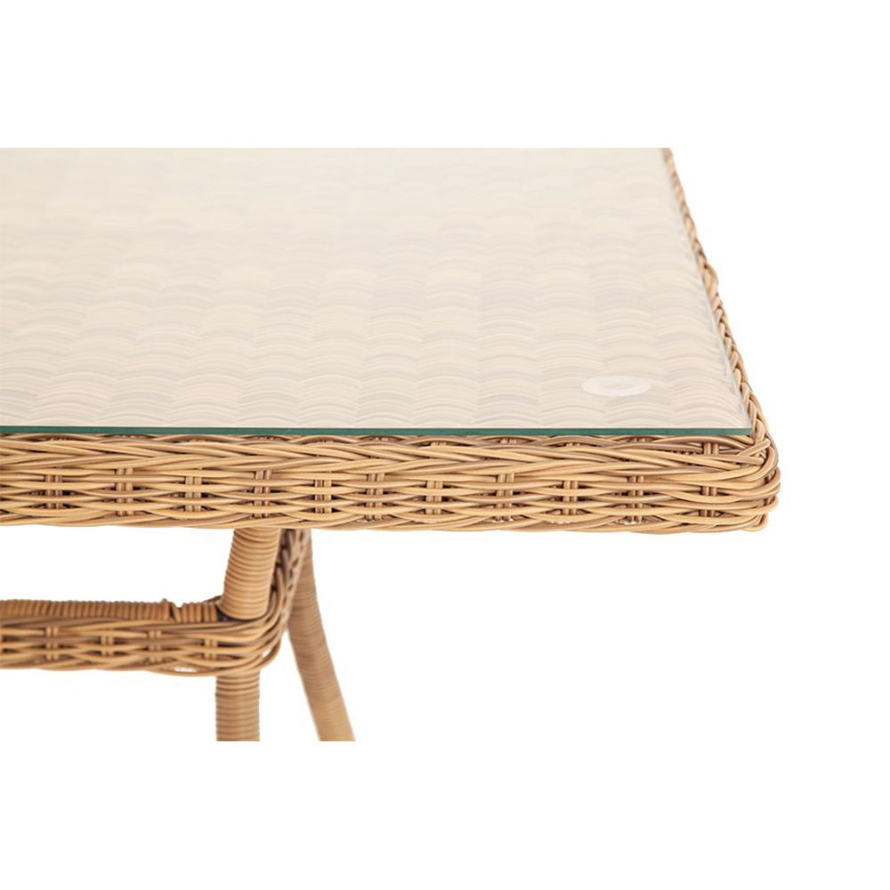 Уличный обеденный стол «Латте» для большой компании.Каркас изделия изготовлен из алюминия, благодаря чему большой стол удобно перемещать. В качестве оплетки использован искусственный ротанг круглого ручного плетения в натуральном соломенном оттенке.Материал устойчив к перепадам погоды, прямым солнечным лучам, атмосферным осадкам, легко моется. Столешница изготовлена из прочного стекла, толщиной 5 мм.
