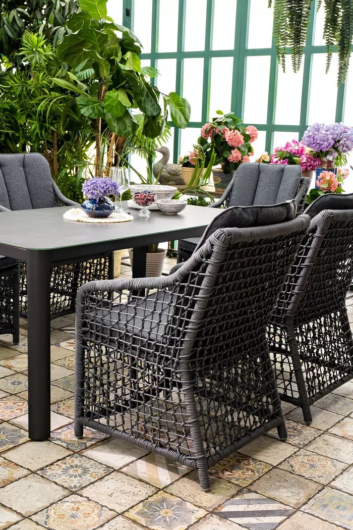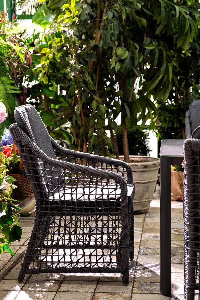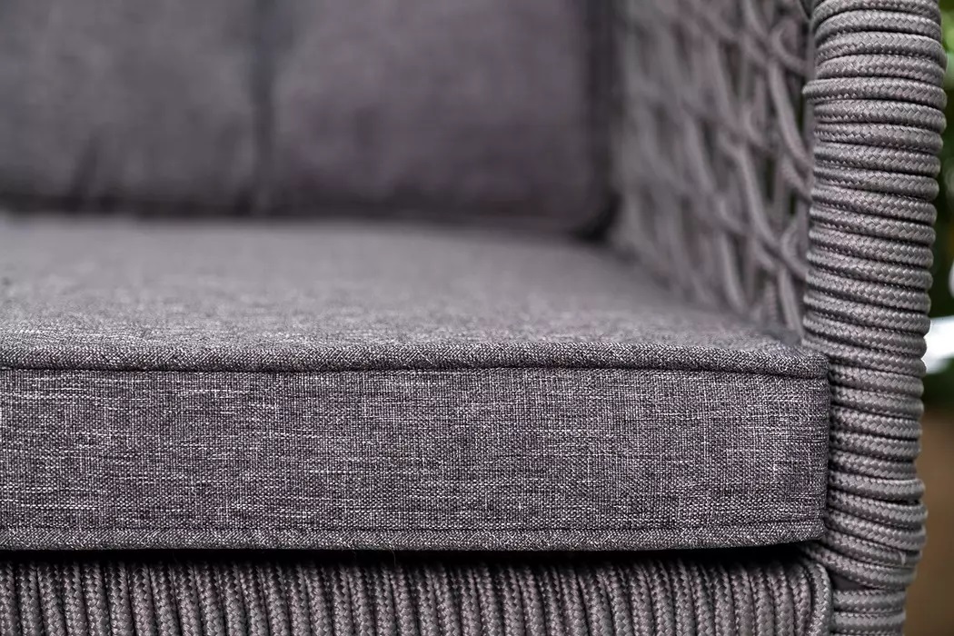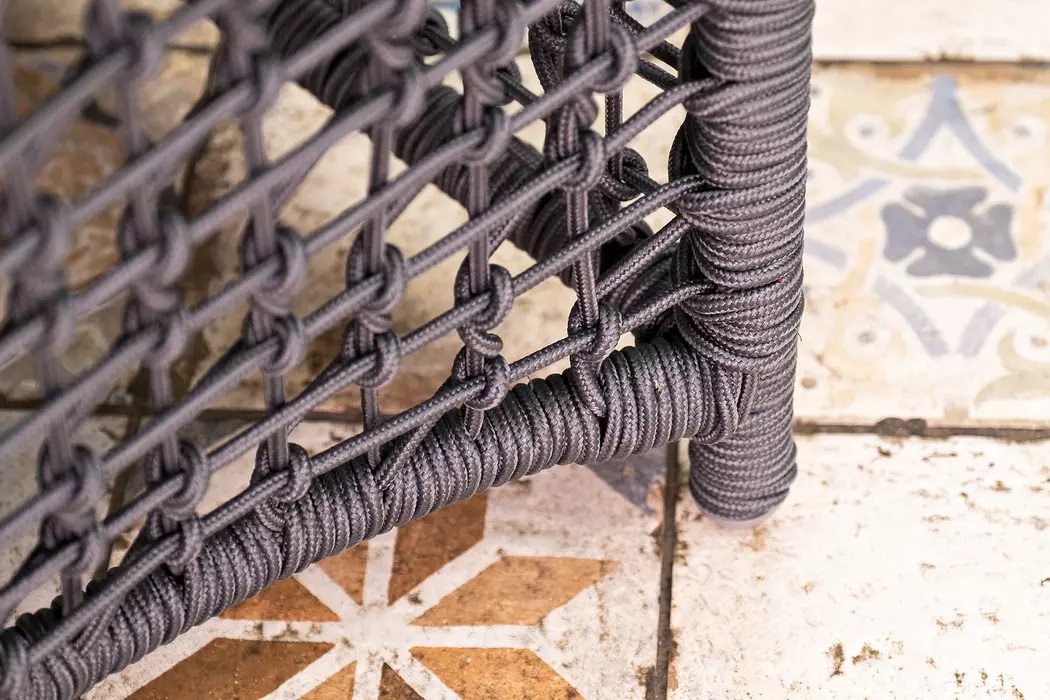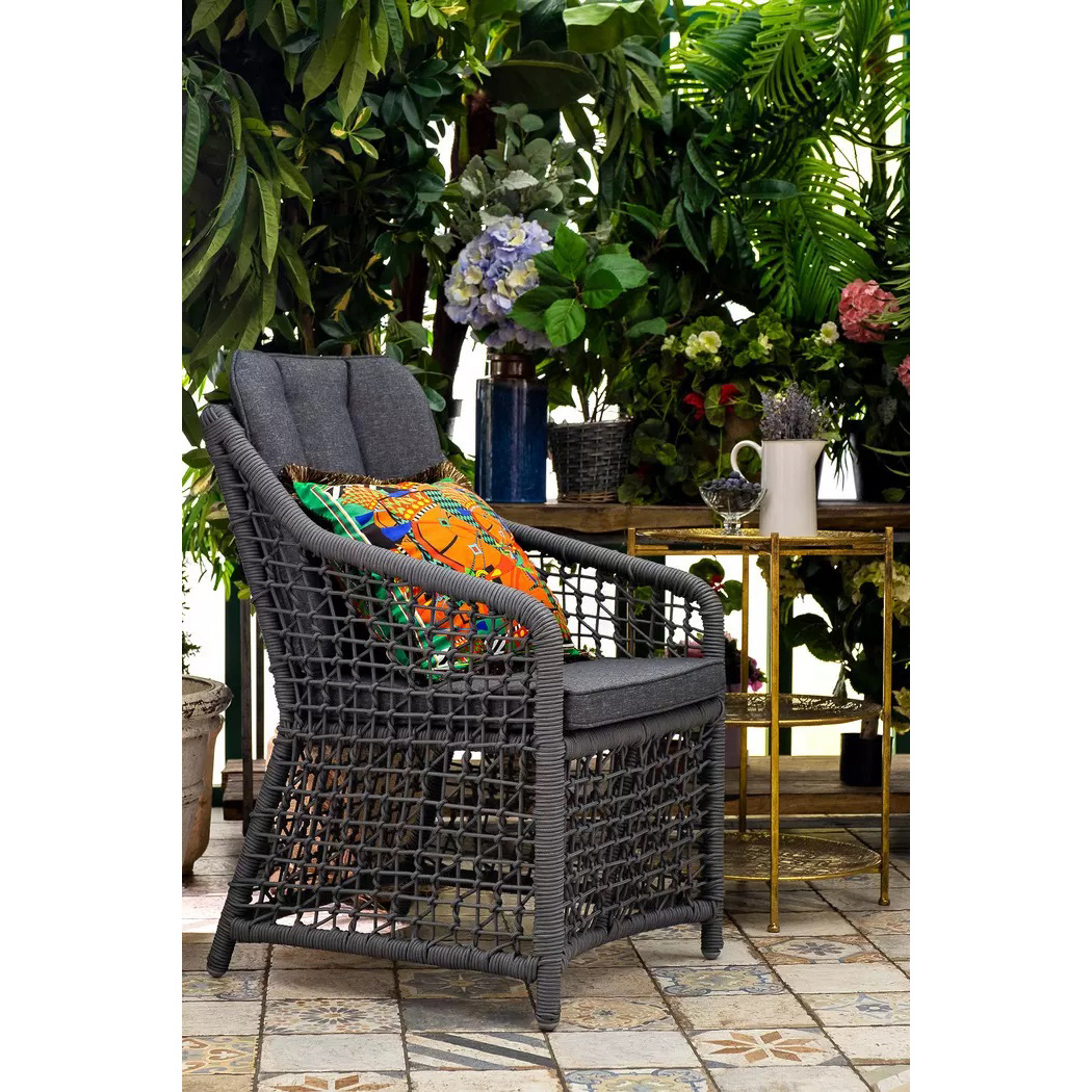 Удобное комфортное кресло с подушкой под сидение и спину, выполненное в ажурном веревочном плетении.