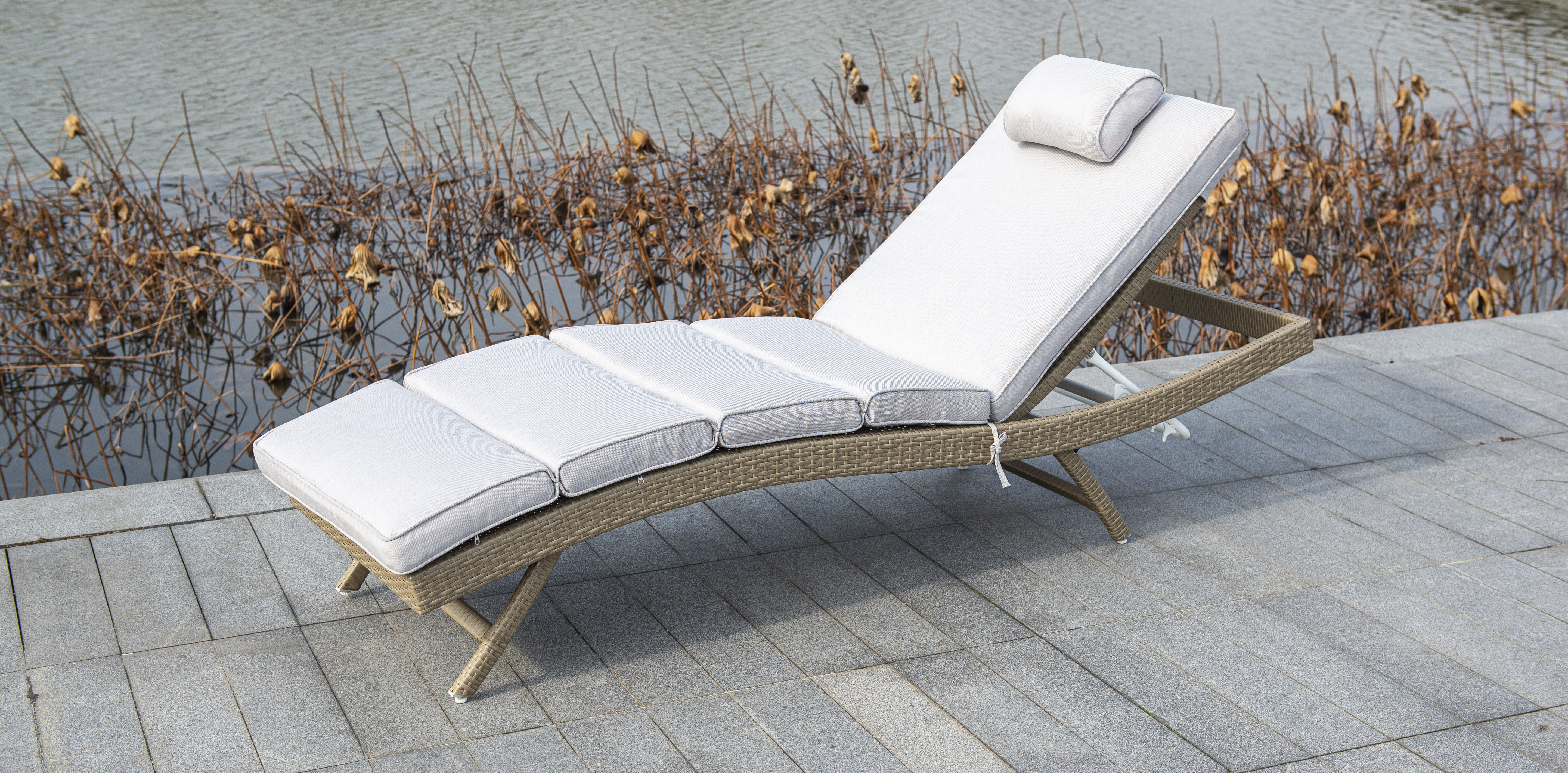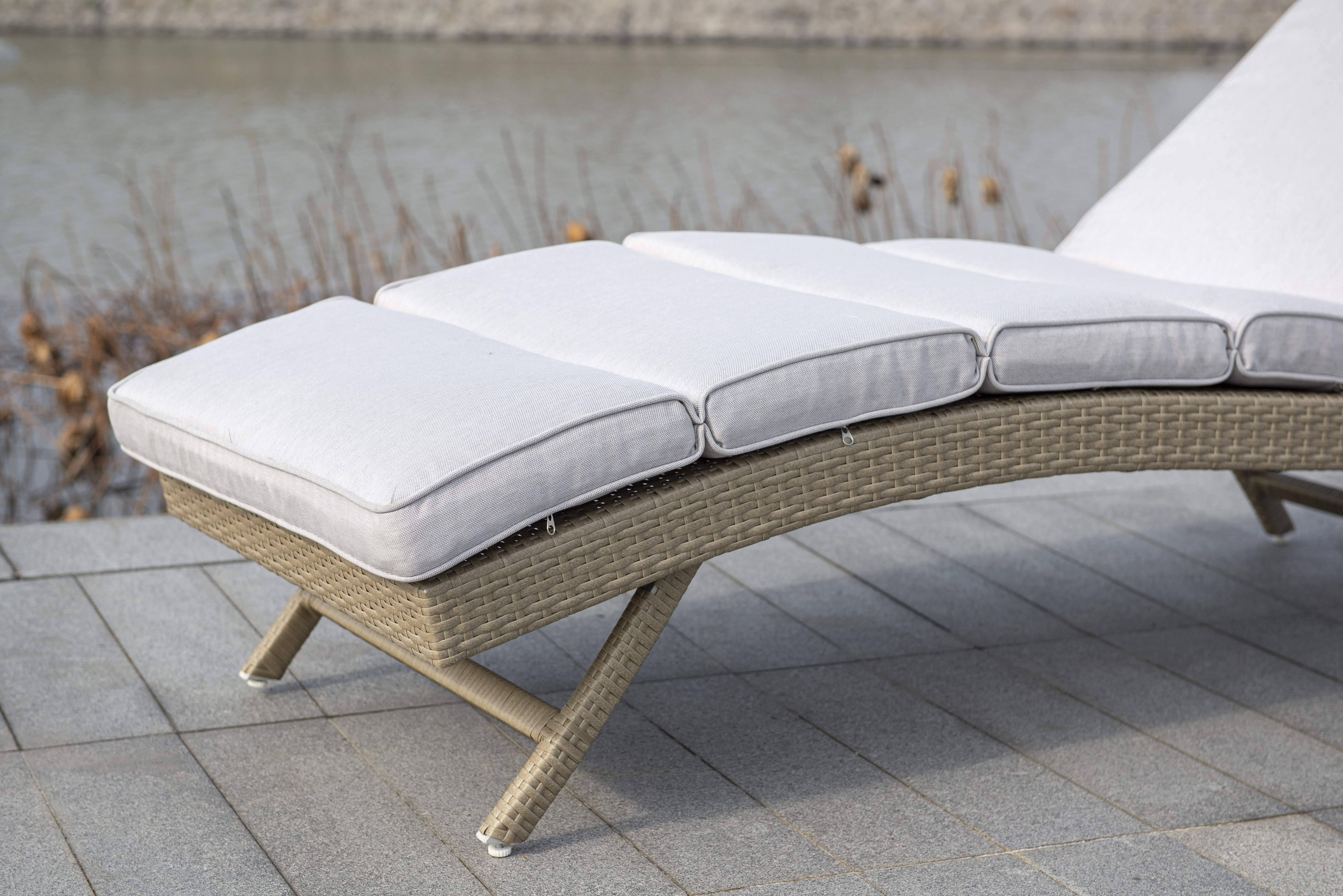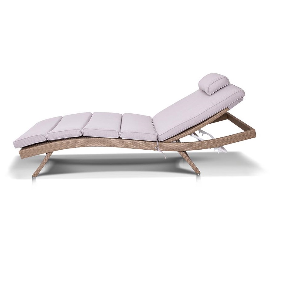 Плетение для лежака выполнено вручную. Повышенной прочности придает ему каркас, сделанный из алюминия. Искусственный ротанг не требует специального ухода.