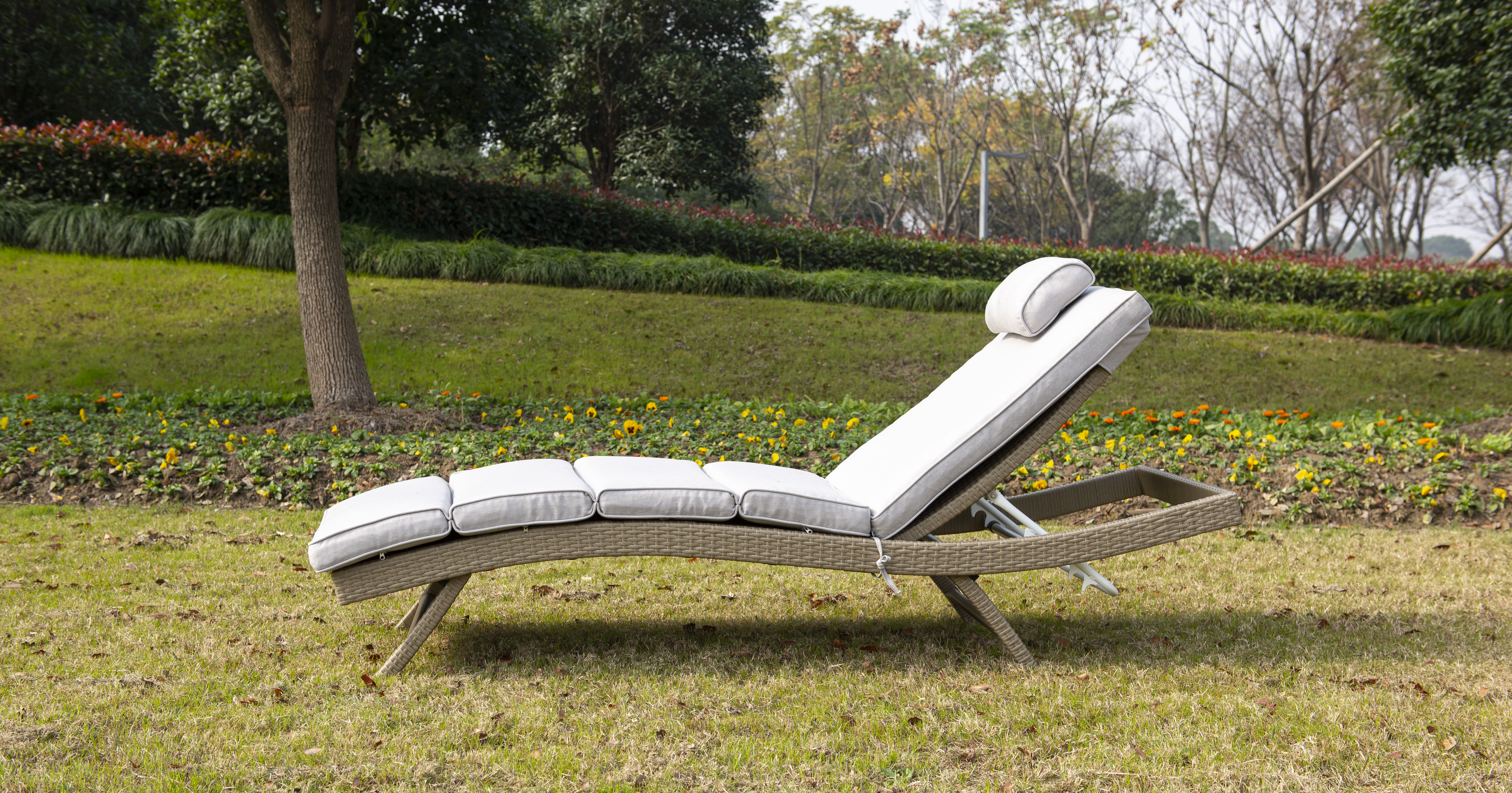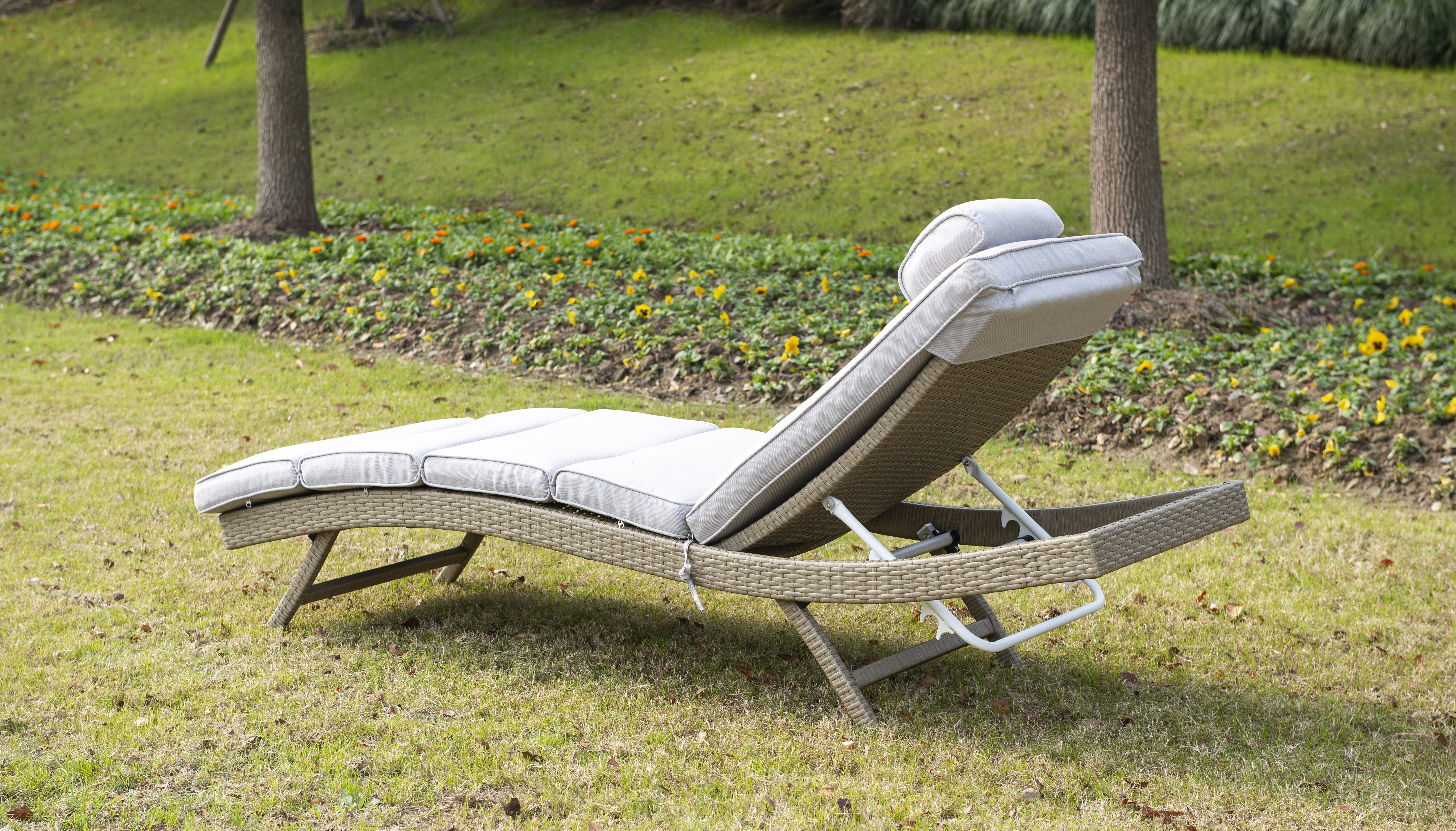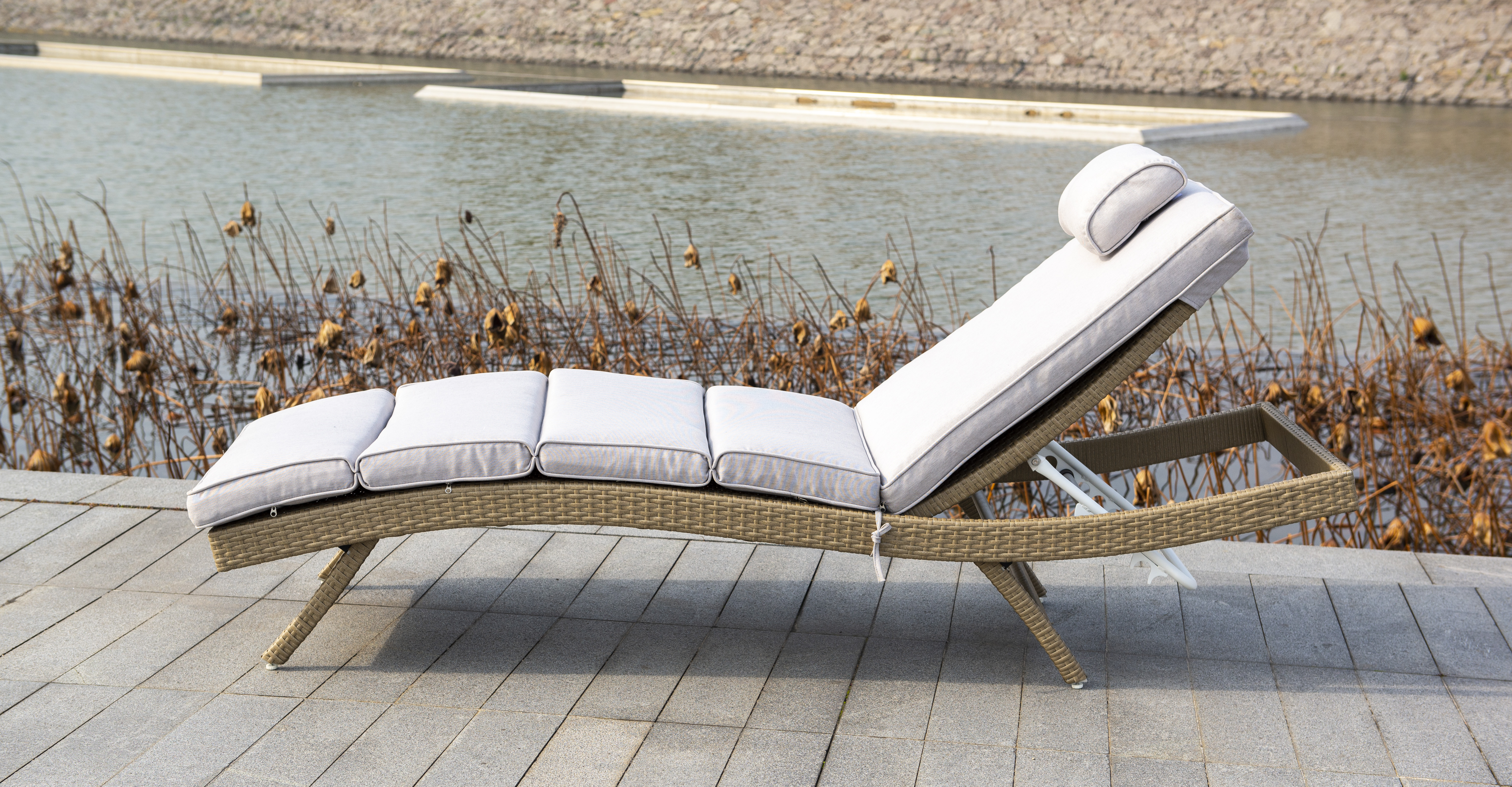 Плетение для лежака выполнено вручную. Повышенной прочности придает ему каркас, сделанный из алюминия. Искусственный ротанг не требует специального ухода.