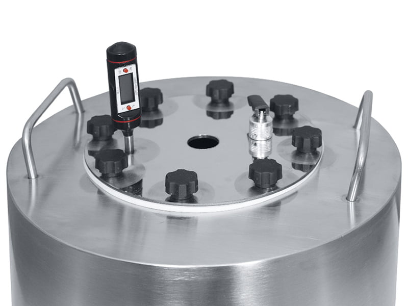 На крышке бака расположены: — Штуцер для электронного градусника со щупом. Высокая точность измерений температуры внутри бака и минимальная погрешность в отличии от аналоговых биметаллических термометров, которые показывают температуру крышки или стенок бака (градусник в комплект не входит). Бак может использоваться без градусник — штуцер заглушен винтом, который легко откручивается крестообразной отверткой; — Предохранительный клапан. Предотвращает нагнетание избыточного давления в баке, обеспечивая безопасность процесса перегонки.