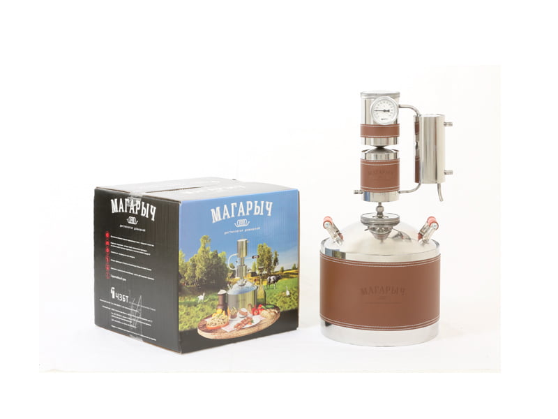 Самогонный аппарат Магарыч Машковского имеет сдвоенный сухопарник, термометр, проточный охладитель, объем перегонного куба составляет 12 литров.