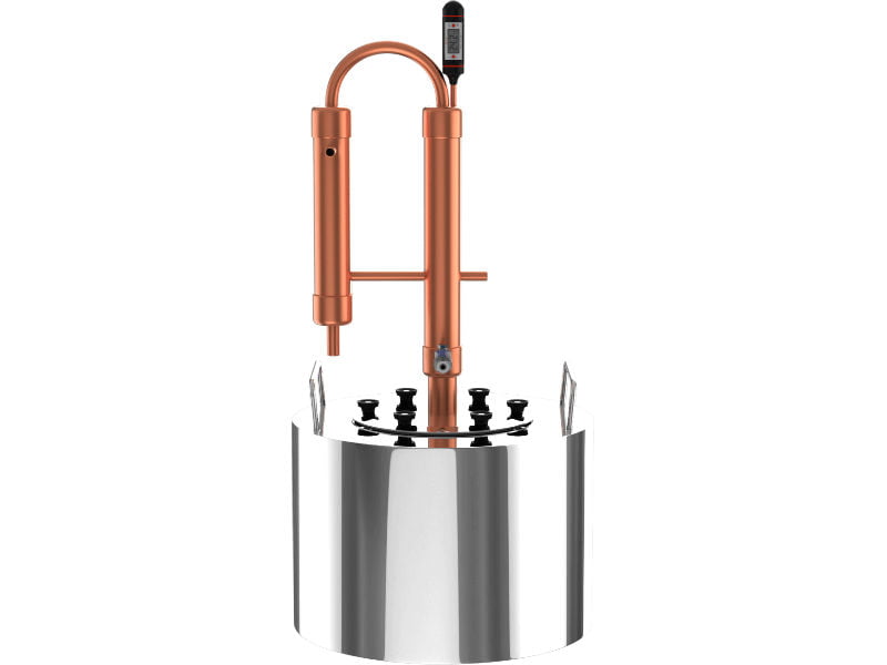 Бак: Выполнен из высококачественной пищевой нержавеющей стали. Работает на любом виде плит. Прокладка из пищевого силикона обеспечивает герметичность и отсутствие запахов в процессе перегонки