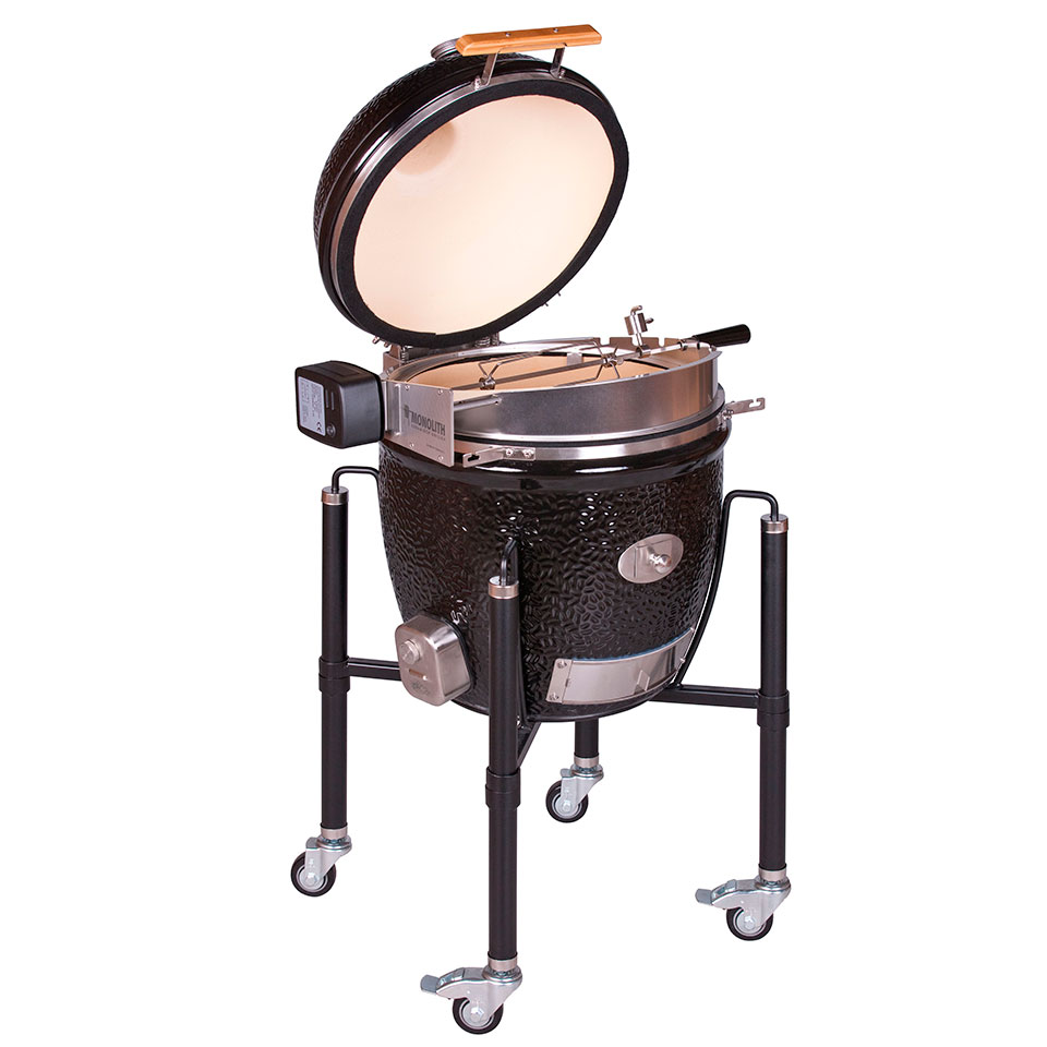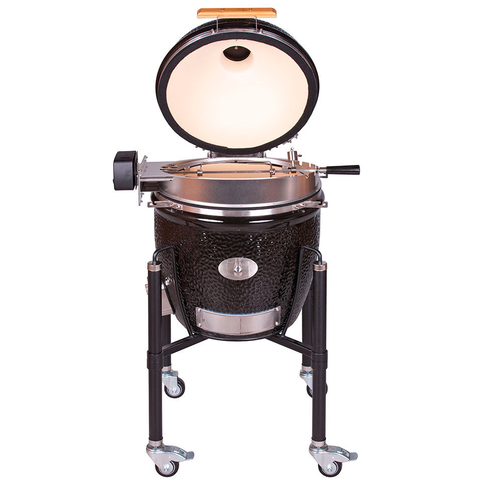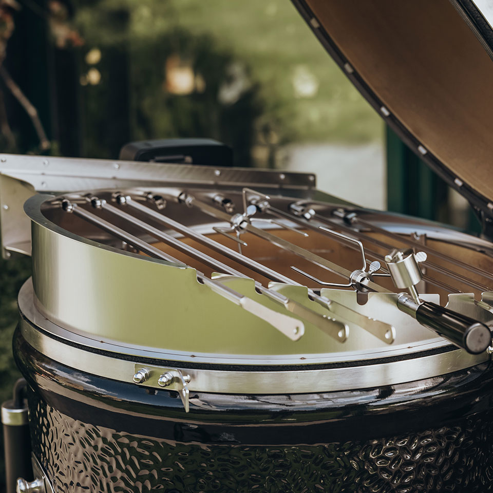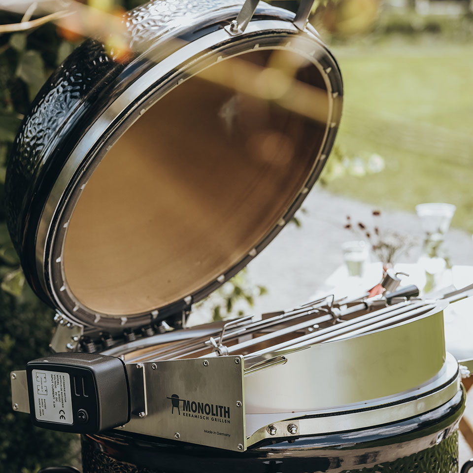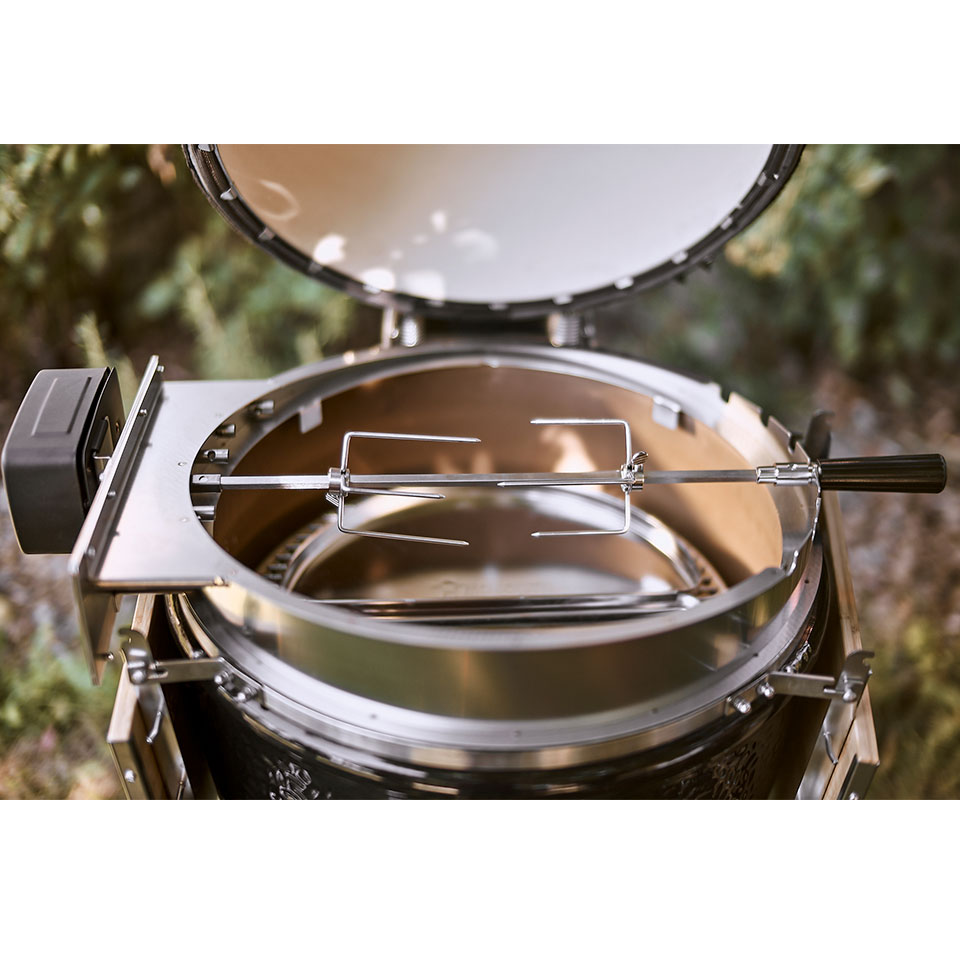 Вертел из нержавеющей стали позволяет обжаривать целых цыплят. Благодаря специальной форме клина его можно использовать даже при закрытой крышке. Надежная вращающаяся коса из нержавеющей стали включает две вилки для мяса с длинными зубцами для надежного удержания мяса. Мотор, работающий от батареи внутри прочного металлического корпуса, может также использоваться с аккумуляторами (не входят в комплект), если требуется.