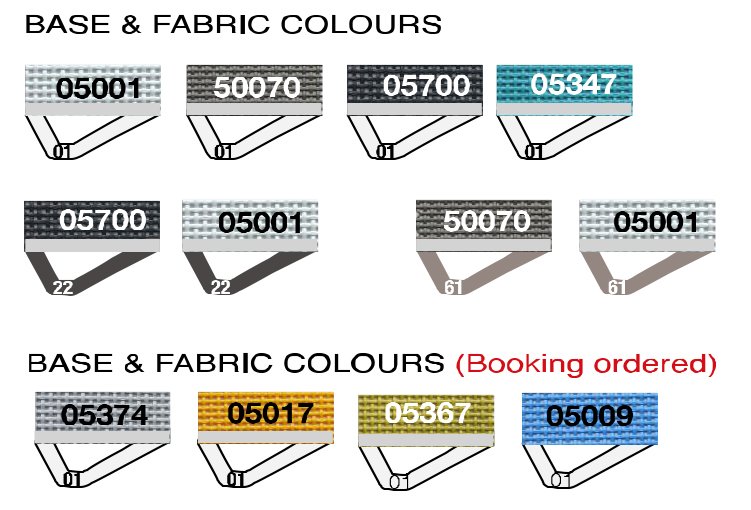 Возможные варианты цвета каркаса и ткани: белый/белый (01/05001), 01/50070 (белый/тортора), белый/антрацит (01/05700), белый/бирюзовый (01/05347), белый/серый (01/05374), белый/желтый (01/05017), белый/зеленый (01/05367), белый/синий (01/05009); антрацит/антрацит (22/05001), антрацит/белый (22/05001);;тортора/тортора (61/50070), тортора/белый (61/05001).