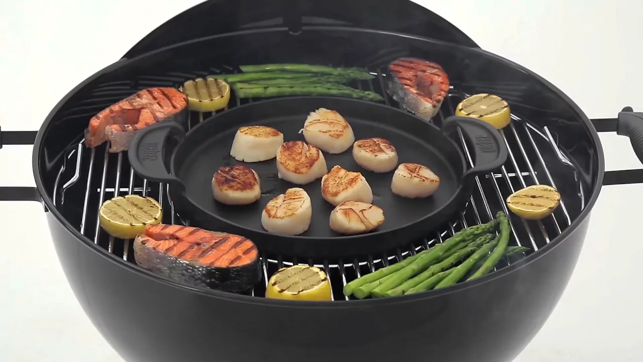 Чугунная сковорода, покрытая фарфоровой эмалью, сохранит сок и вкус продукта при жарке: мясо внутри будет необычайно нежным. Для таких блюд, как креветки, овощи, жареный картофель, появляются абсолютно новые возможности готовки на Вашем любимом гриле. Для грилей диаметром 57 см.