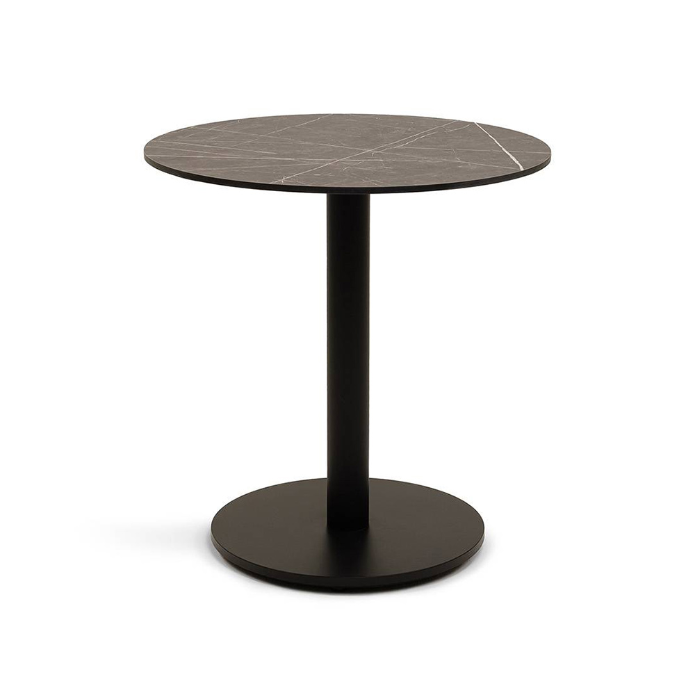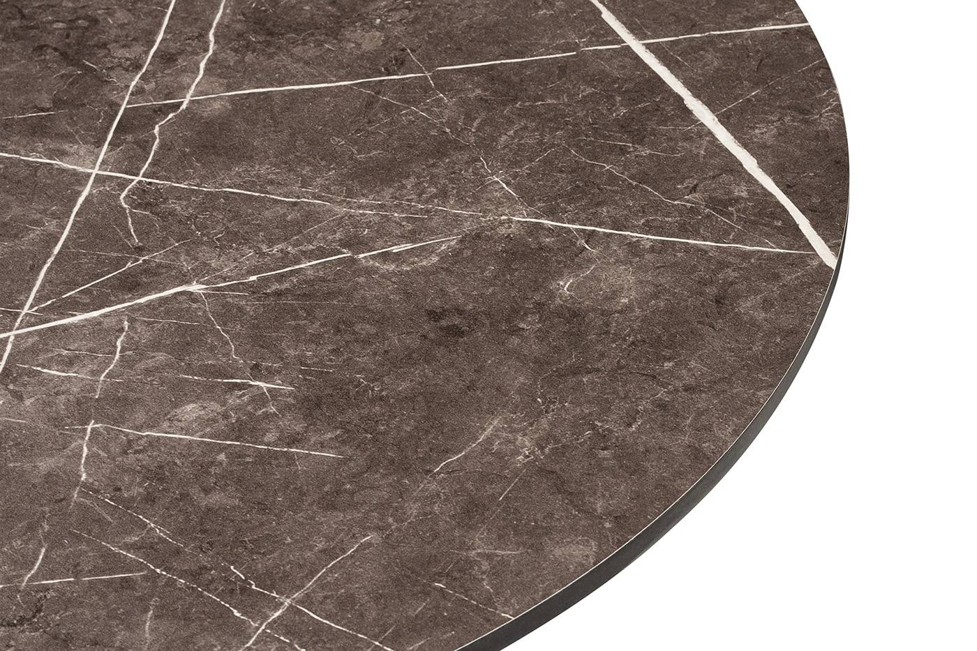 Интерьерный круглый стол «Каффе» со столешницей из HPL в цвете «серый мрамор». Это высококачественный ударопрочный компакт-пластик, обладающий низкой пористостью, что предотвращает впитывание жидкостей, поэтому столы из HPL идеально подходит для обеденных зон. Толщина столешницы – 12 мм.