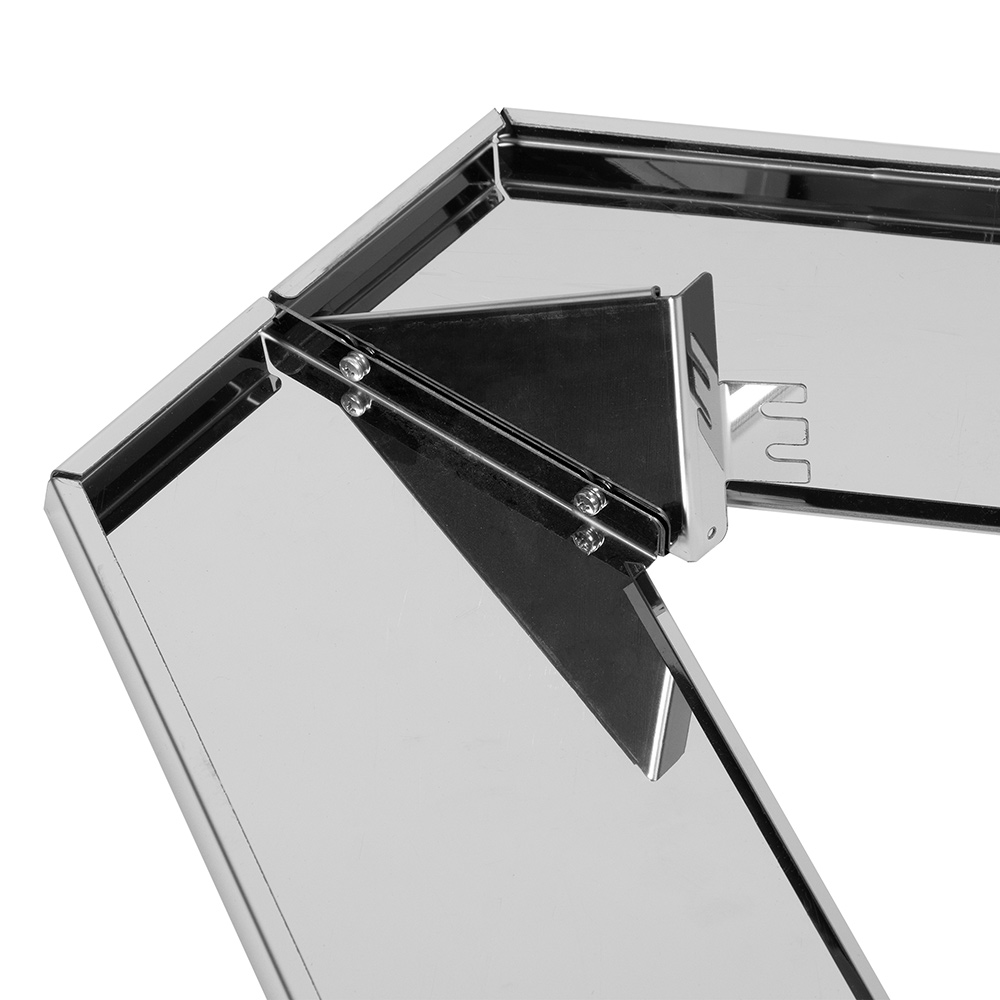 Столик выполнен из нержавеющей стали с зеркальной полировкой, которая придаёт поверхности эффектный внешний вид. Прочный материал защищён от коррозии, что гарантирует долговечность изделия. На гладкой зеркальной поверхности особенно гармонично смотрятся посуда, пепельницы и декоративные элементы.