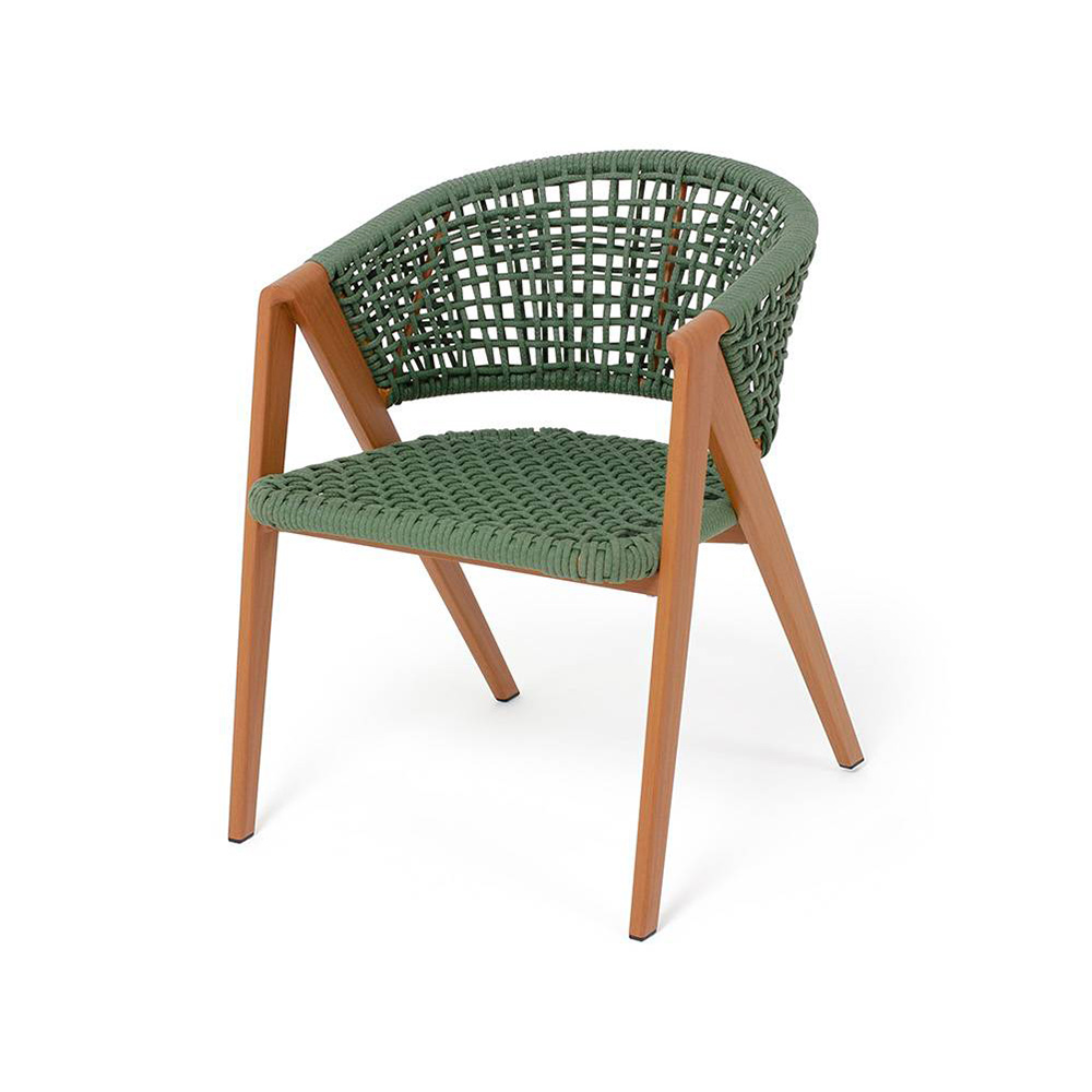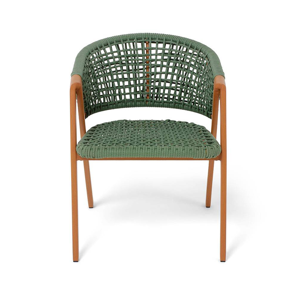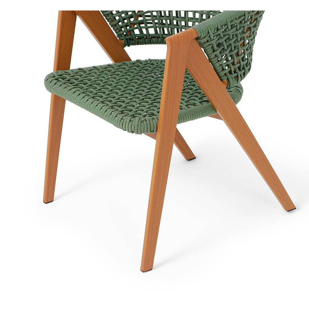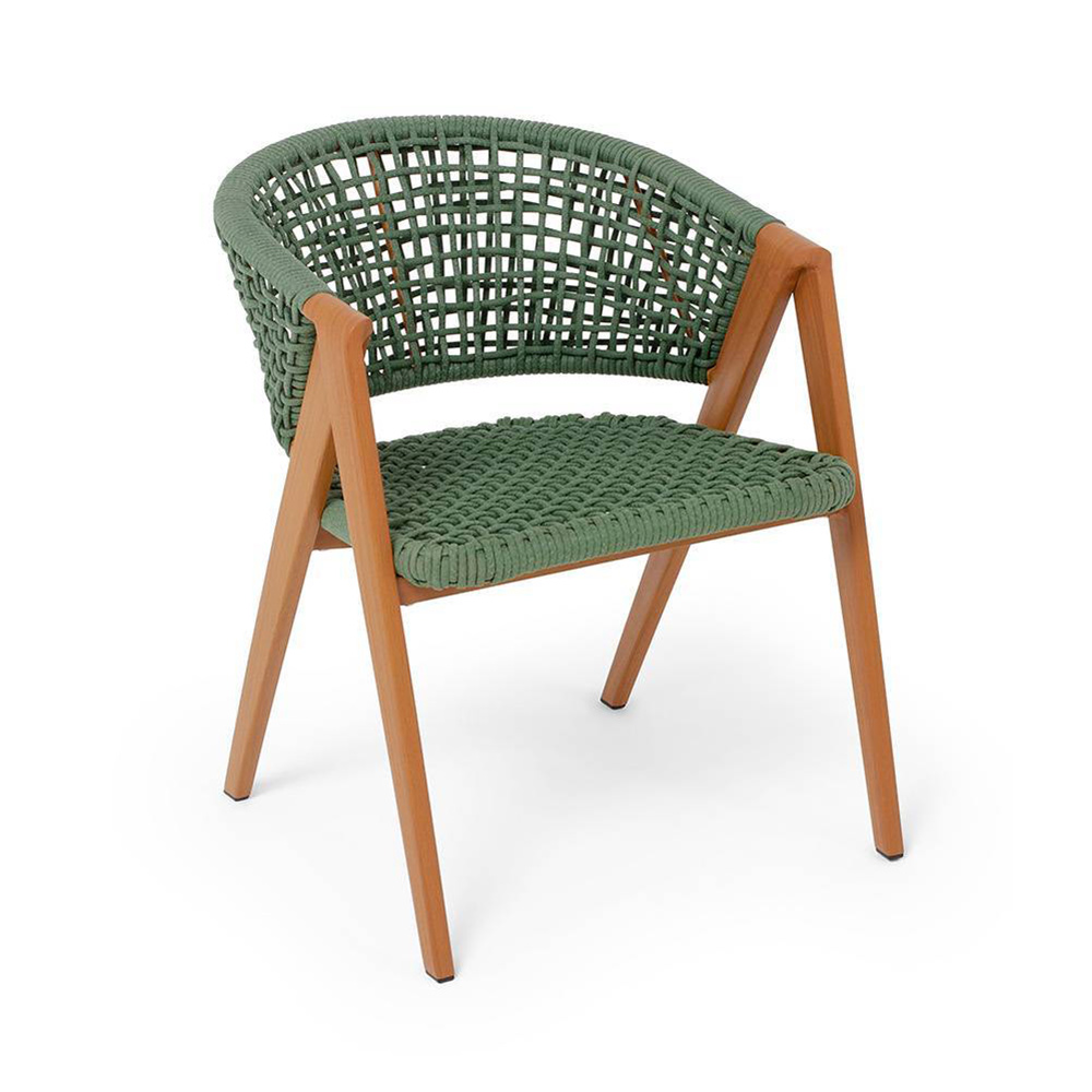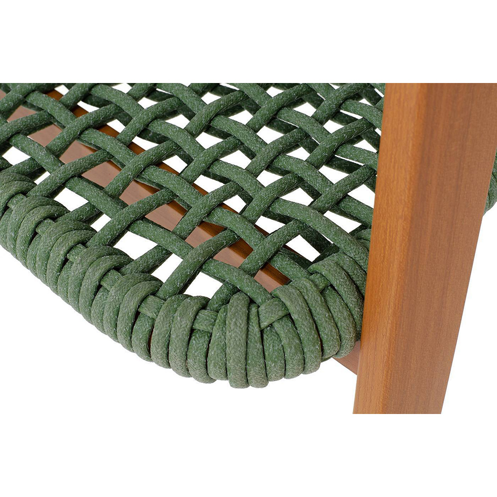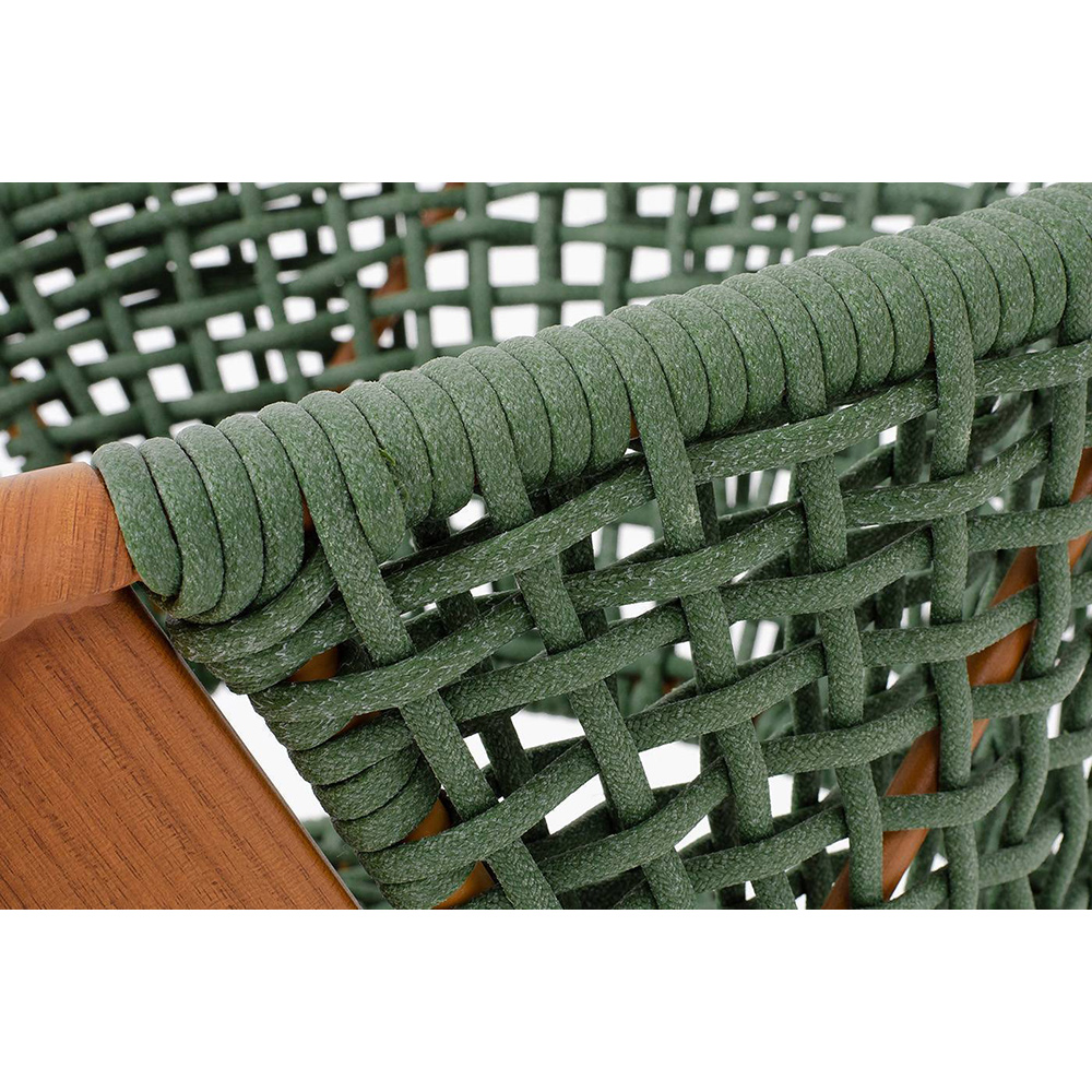 Изготовлен из алюминиевого каркаса, оплетенного вручную эластичными синтетическими лентами из высокопрочных полиэфирных волокон. Роуп является гипоаллергенным, прочным, износостойким и устойчивым к ультрафиолету. Приятный на ощупь и напоминает шерстяное плетение. Цвет каркаса – «под дерево», оплетки - зеленый. На ножках стула идут черные пластиковые наконечники (заглушки).