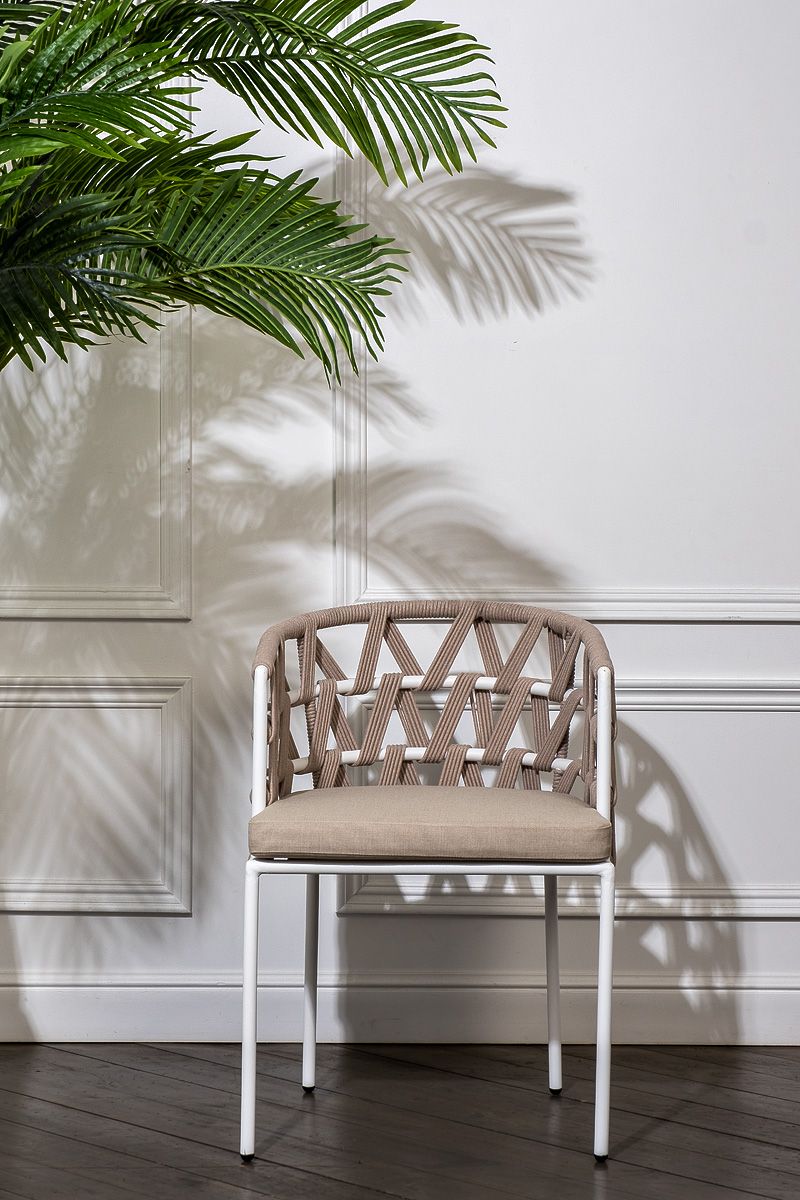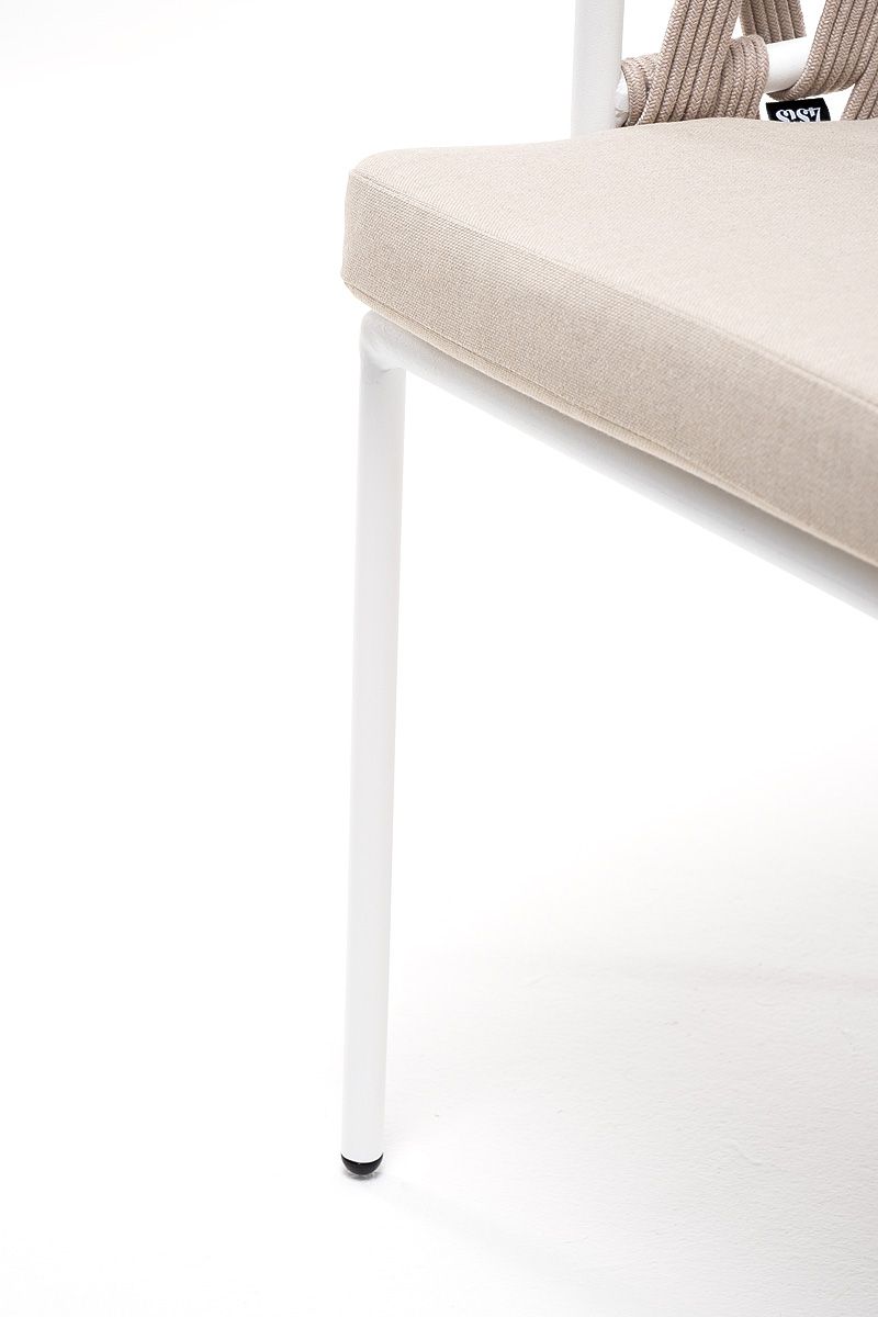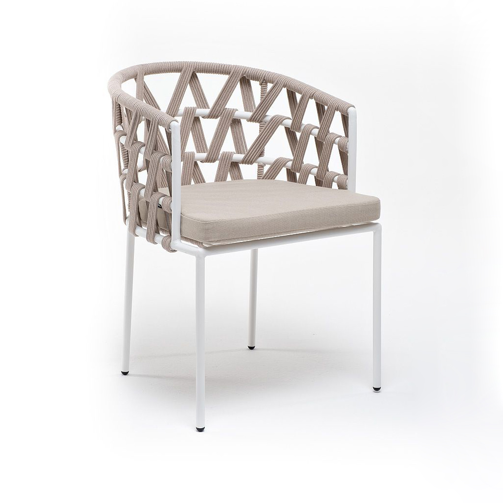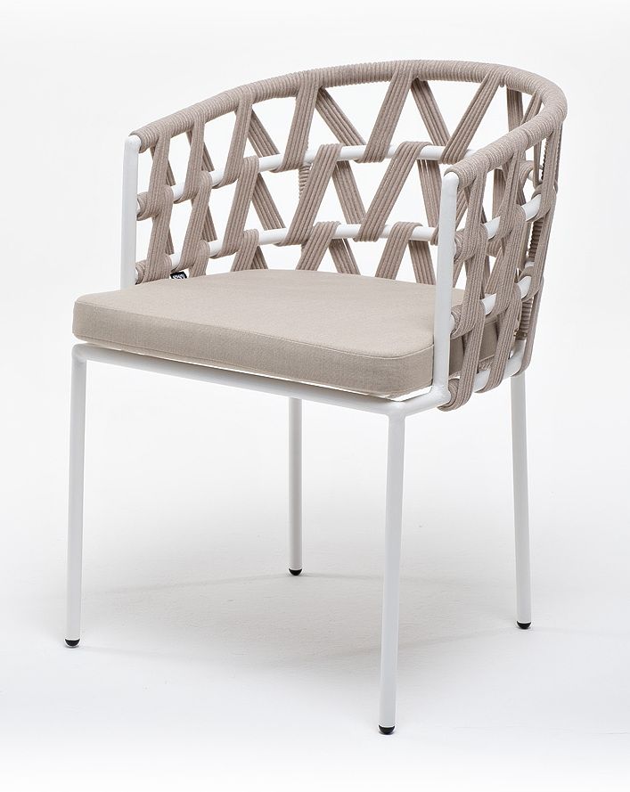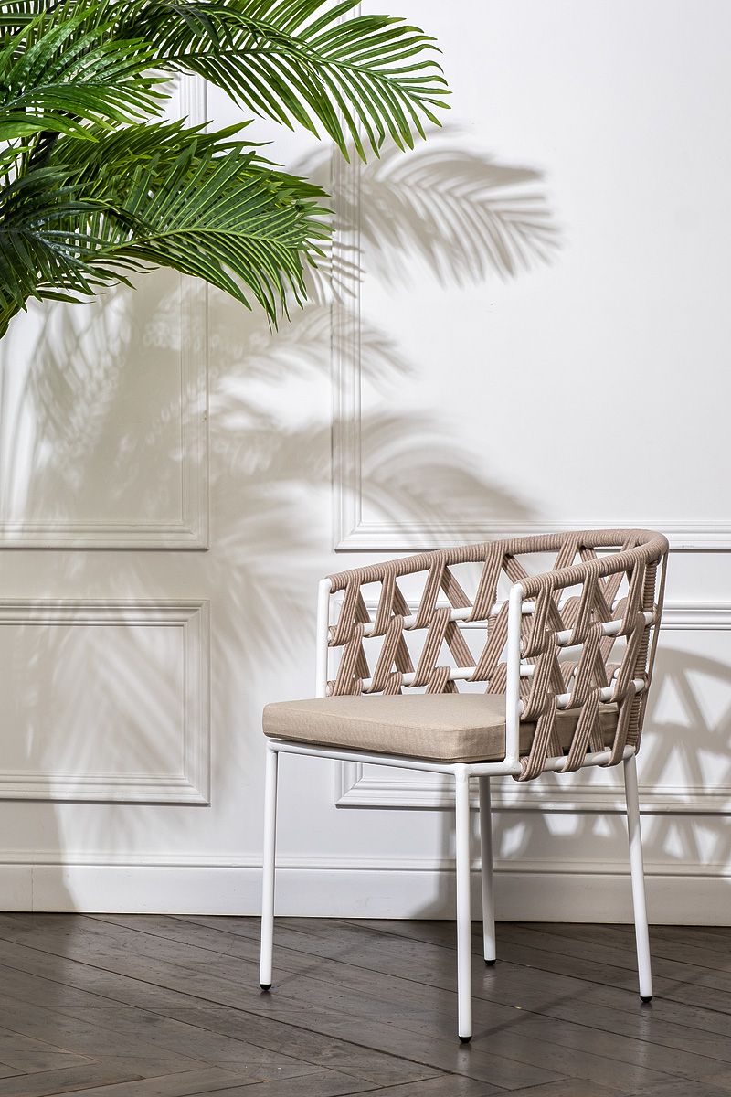 Стул «Диего» изготовлен из стального каркаса, окрашенного порошковой износостойкой краской белого цвета.Каркас вручную оплетен бежевым роупом - эластичными синтетическими лентами из высокопрочных полиэфирных волокон.В комплект входит подушка со съёмным чехлом из 100% влагоотталкивающего полиэстера бежевого цвета.Размер плетеного стула: 530×560×760 мм.