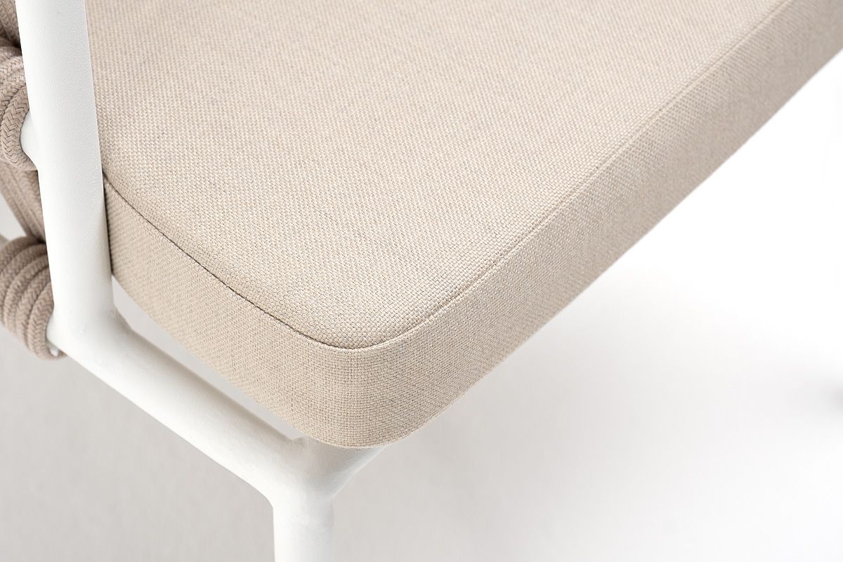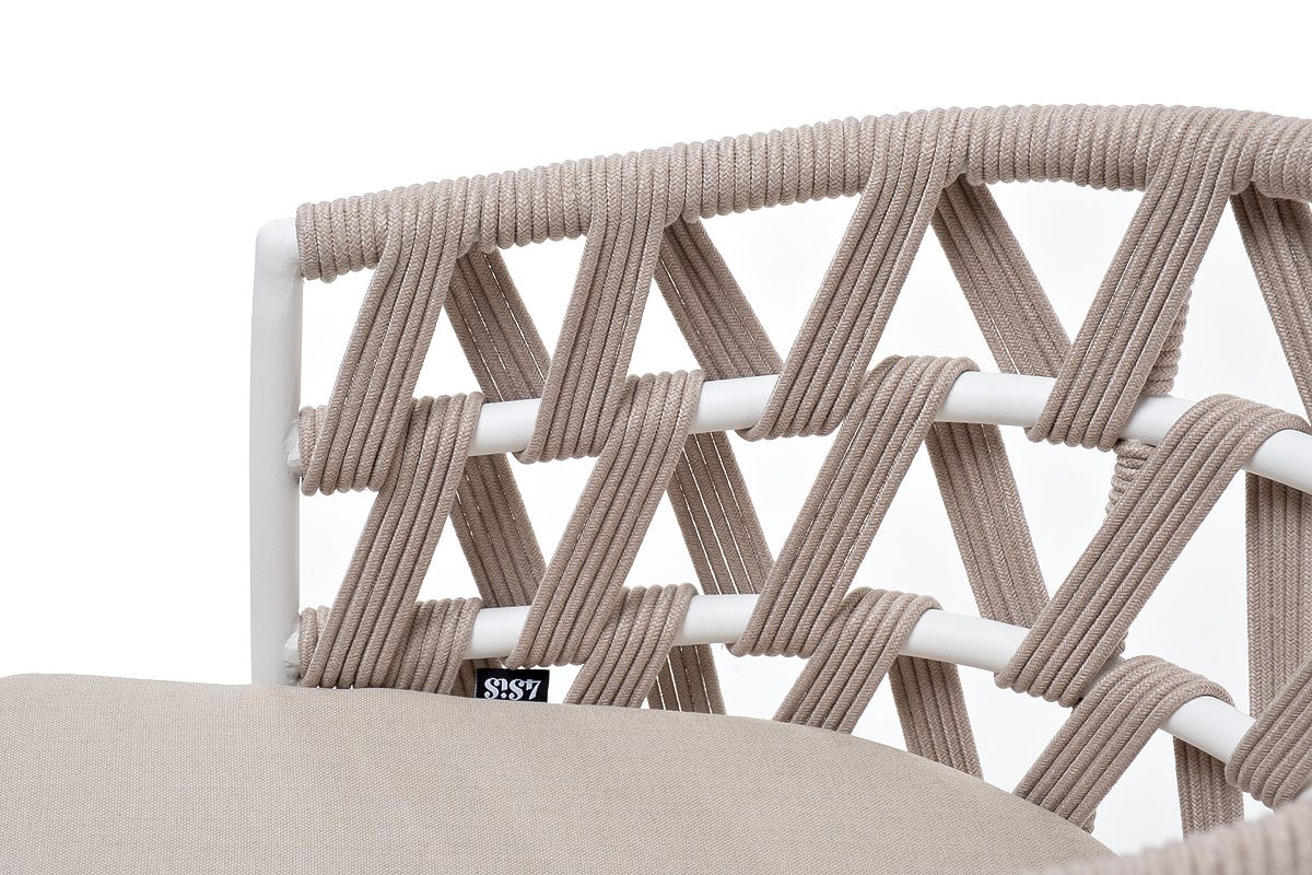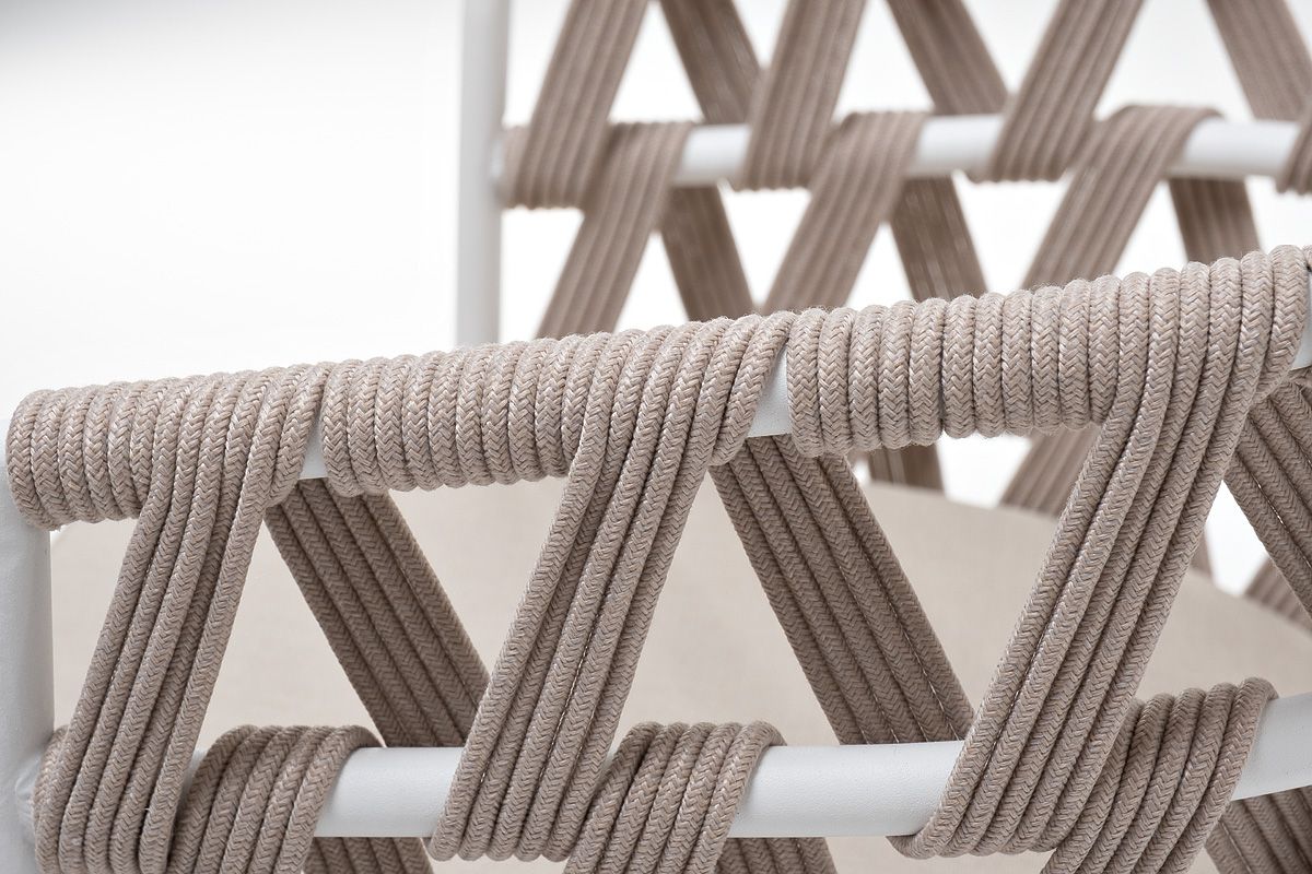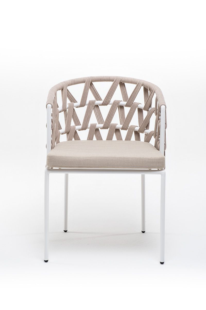 Стул «Диего» изготовлен из стального каркаса, окрашенного порошковой износостойкой краской белого цвета.Каркас вручную оплетен бежевым роупом - эластичными синтетическими лентами из высокопрочных полиэфирных волокон.В комплект входит подушка со съёмным чехлом из 100% влагоотталкивающего полиэстера бежевого цвета.Размер плетеного стула: 530×560×760 мм.