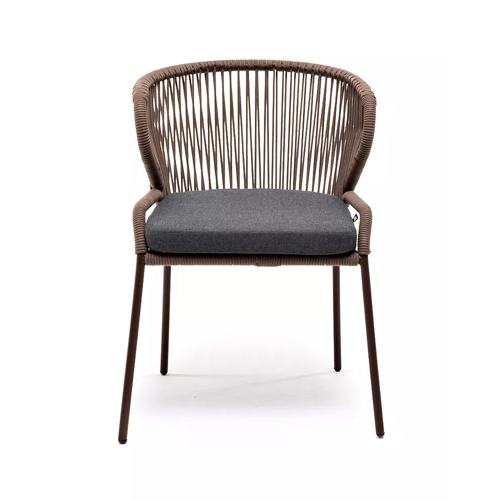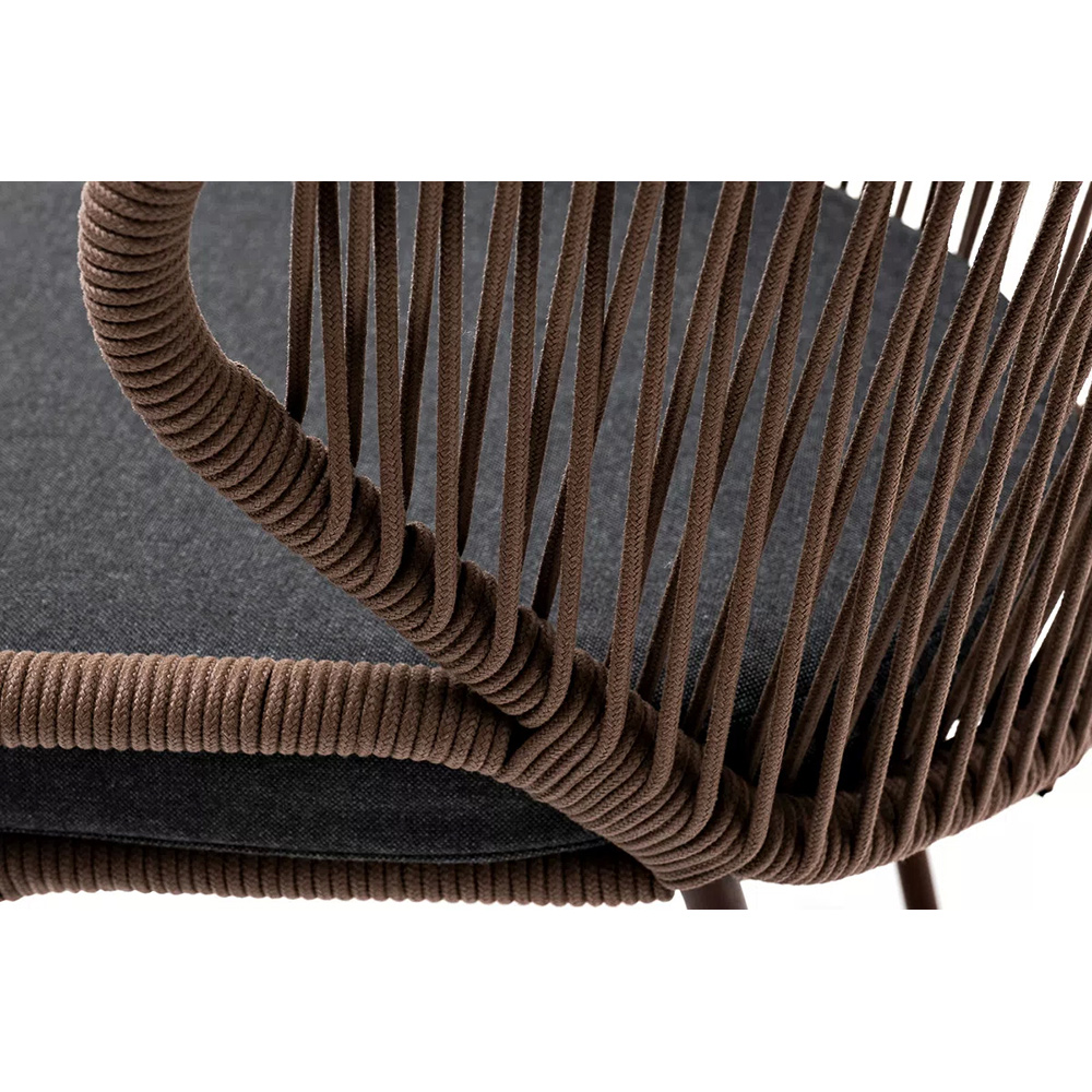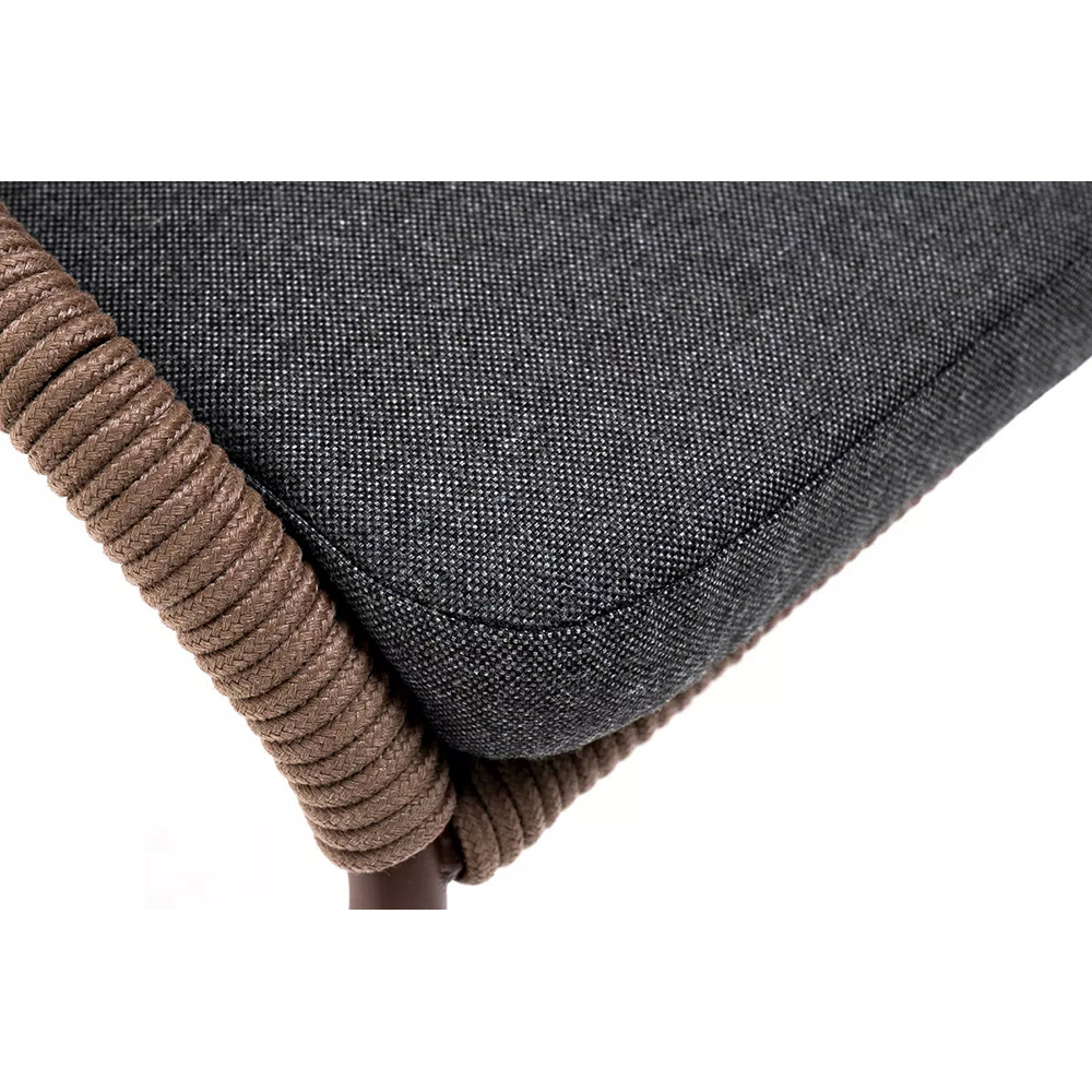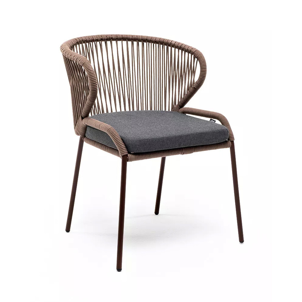 Стул «Милан» для обустройства обеденной или лаунж-зоны.Изготовлен из алюминиевого каркаса, оплетенного вручную эластичными синтетическими лентами из высокопрочных полиэфирных волокон (роуп круглый). Цвет каркаса - коричневый (RAL8016), оплетки - коричневый.В комплект входит подушка со съёмным чехлом из 100%-го полиэстера с влагоотталкивающей пропиткой темно-серого цвета.