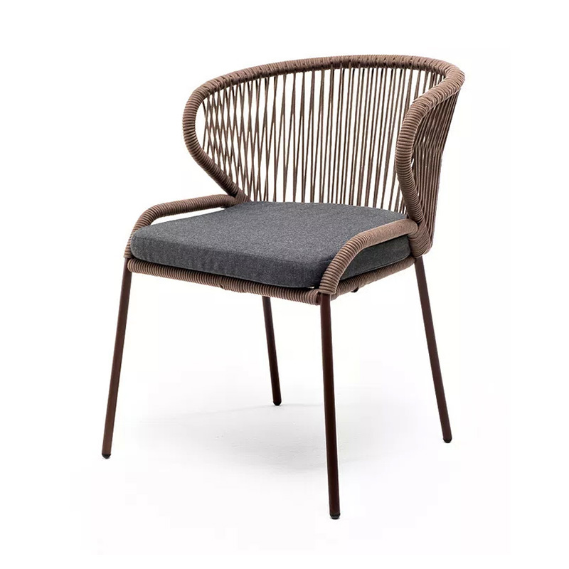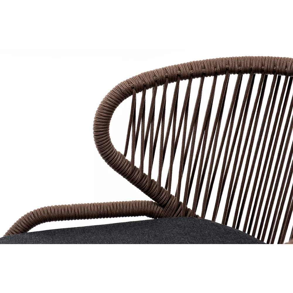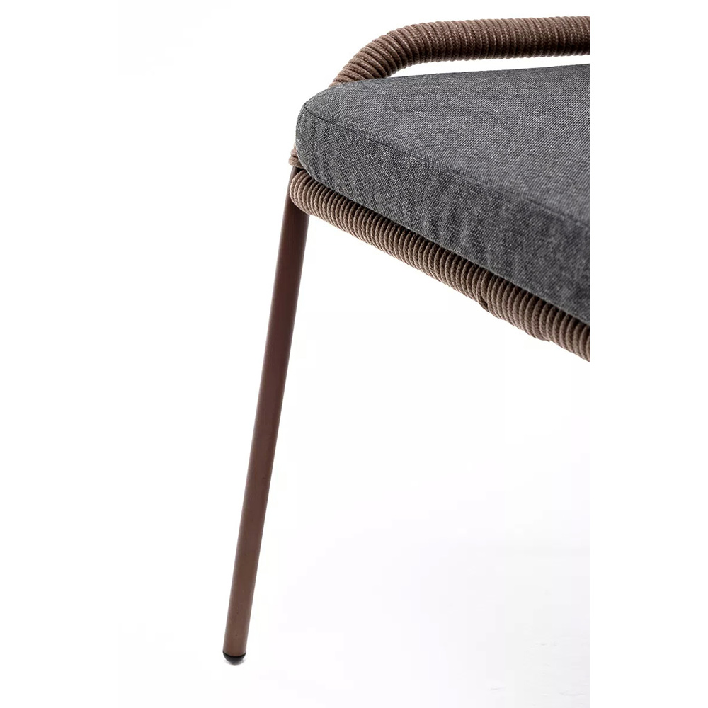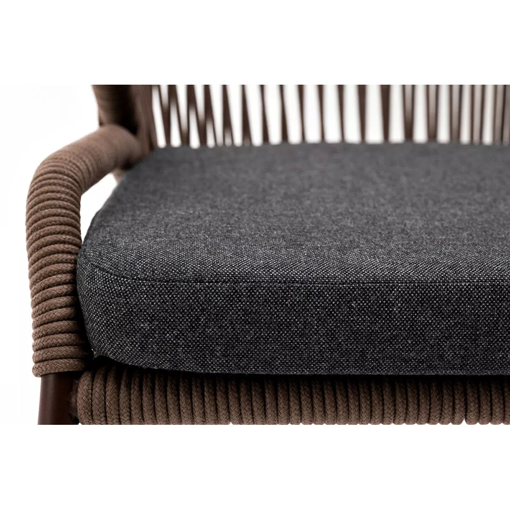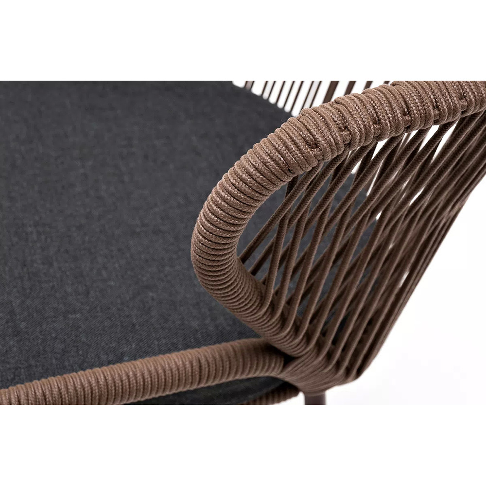 Стул «Милан» для обустройства обеденной или лаунж-зоны.Изготовлен из алюминиевого каркаса, оплетенного вручную эластичными синтетическими лентами из высокопрочных полиэфирных волокон (роуп круглый). Цвет каркаса - коричневый (RAL8016), оплетки - коричневый.В комплект входит подушка со съёмным чехлом из 100%-го полиэстера с влагоотталкивающей пропиткой темно-серого цвета.