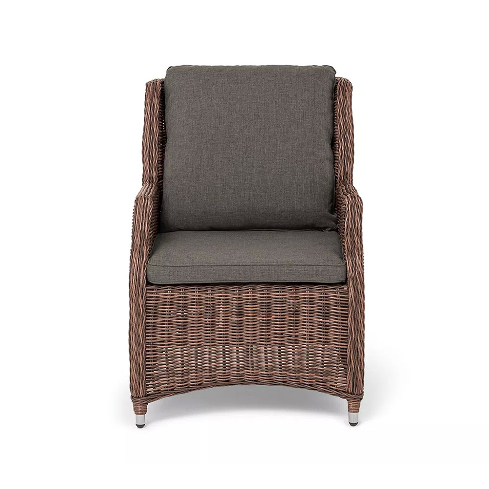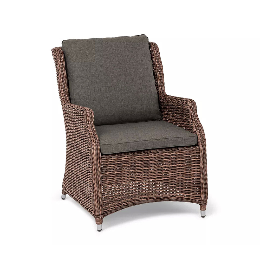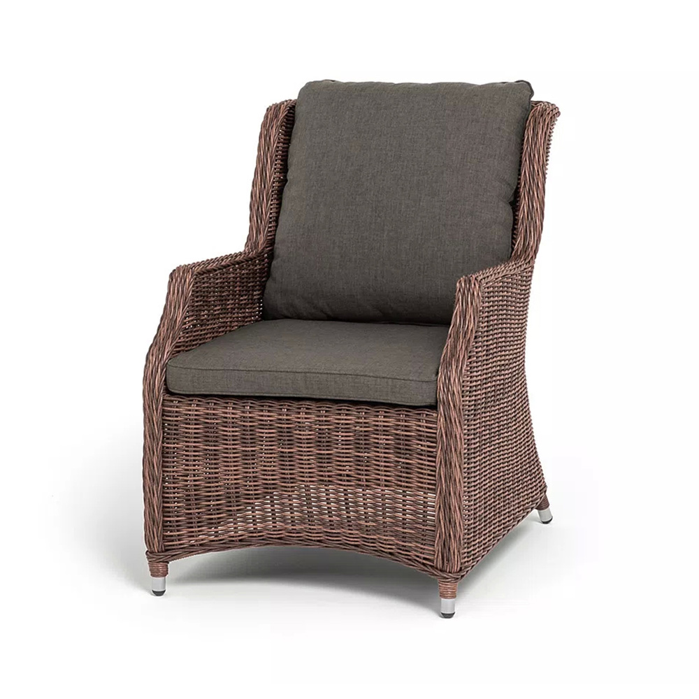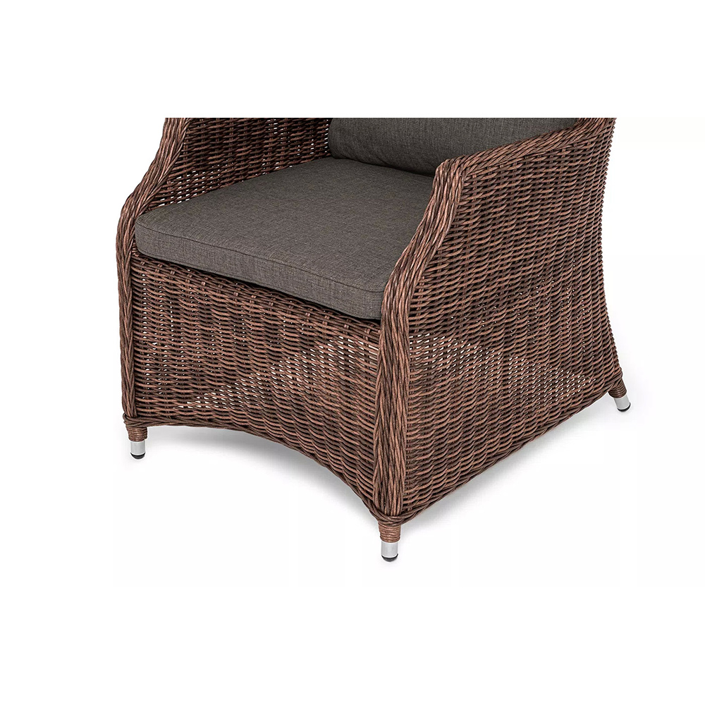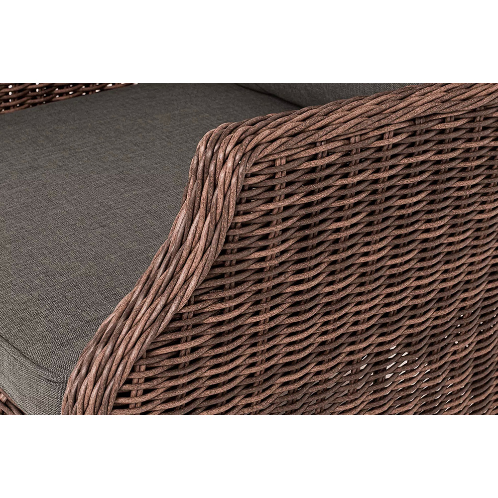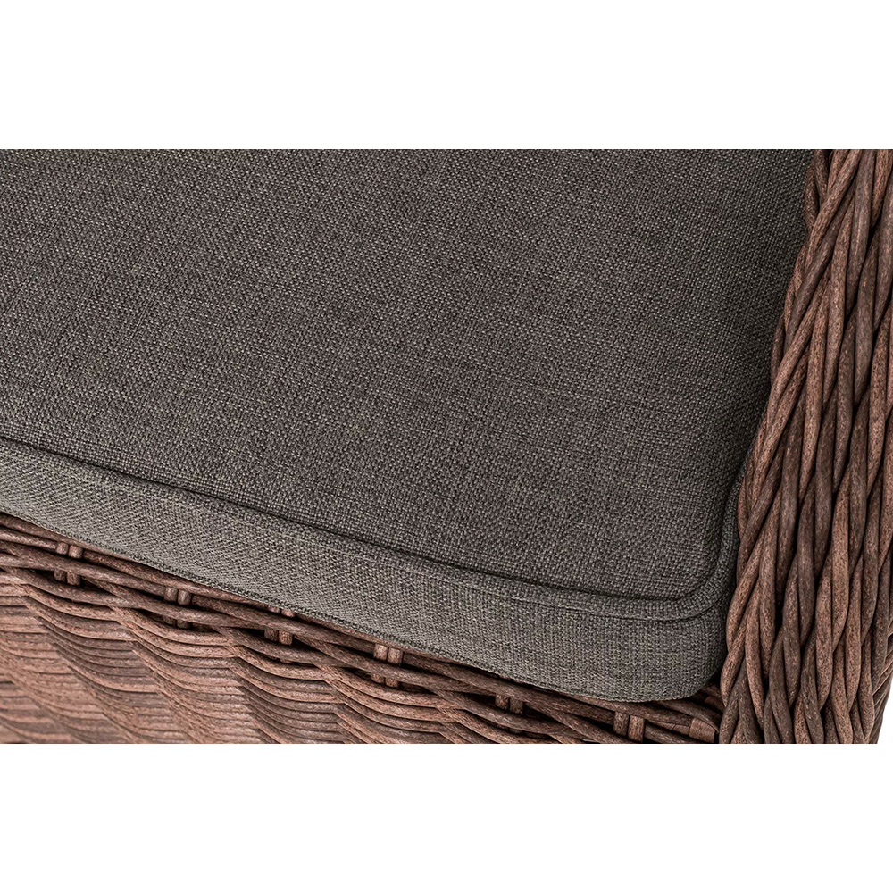 Плетенный стул дополняют мягкие подушки. Они выполнены в серо-коричневом оттенке. Пошиты изделия из плотного полиэстера 230гр/м2. Ткань предварительно обрабатывается влагоотталкивающей пропиткой.