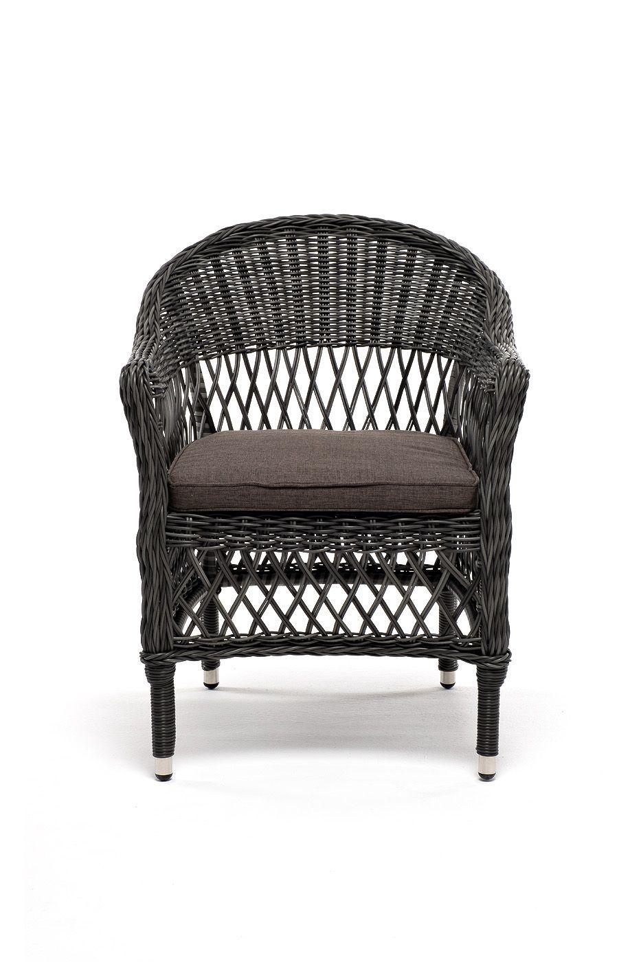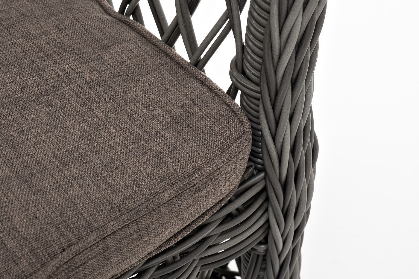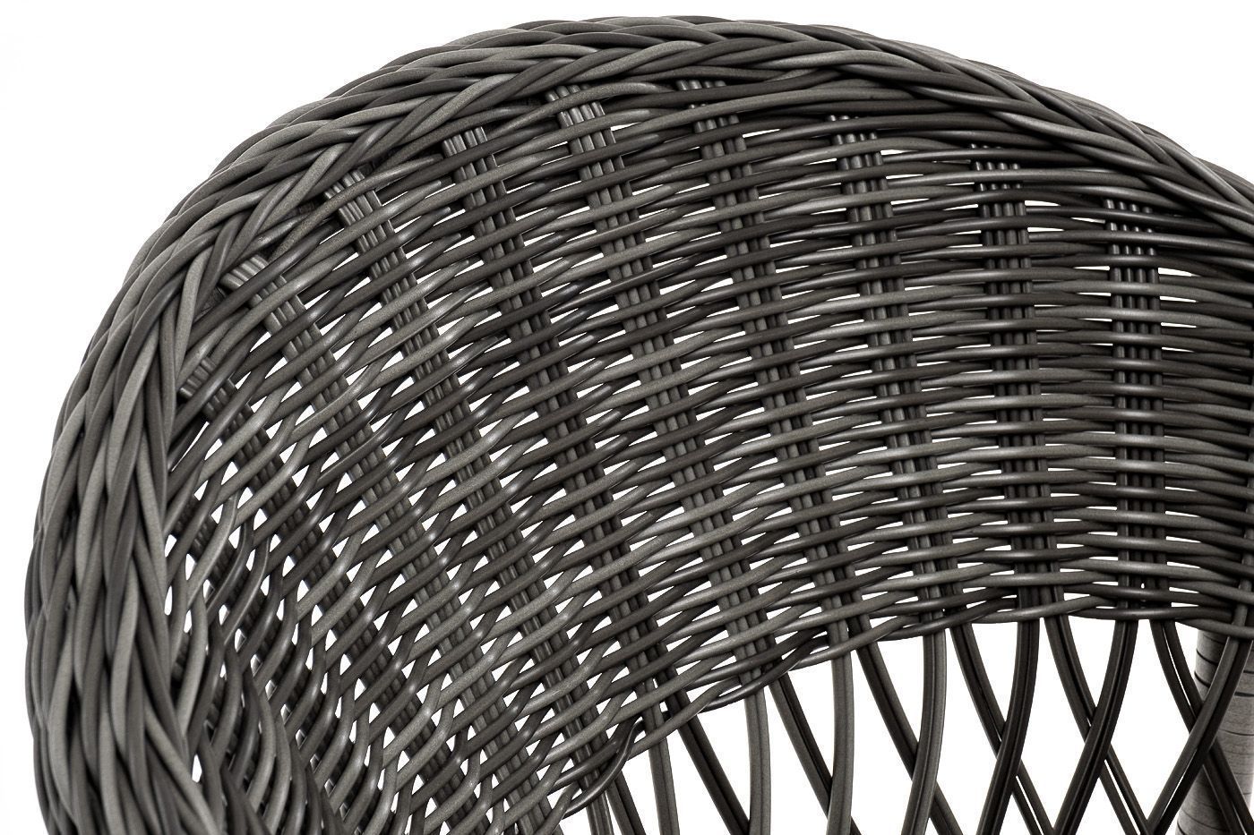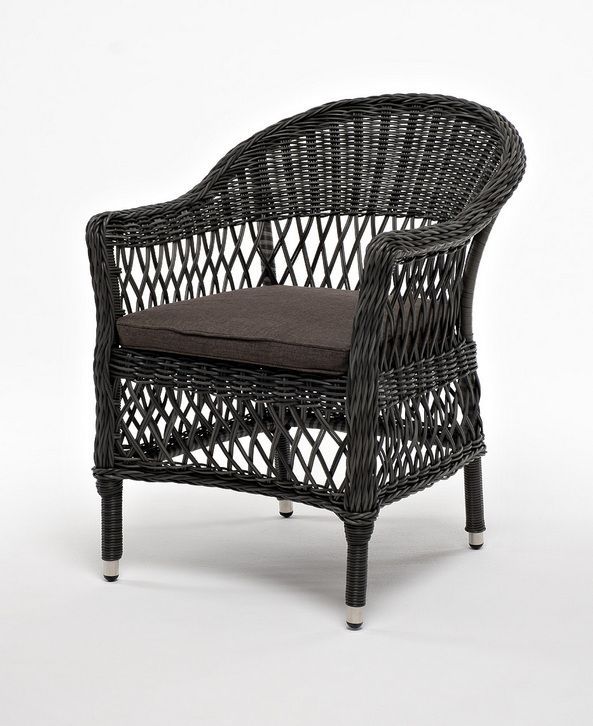 Стул оплетен вручную круглым искусственным ротангом графитового оттенка. В комплекте представлена мягкая подушка-сиденье серо-коричневого цвета. Подушка имеет съемный чехол из полиэстера (100%), плотностью 230гр/м2, с влагоотталкивающей пропиткой.