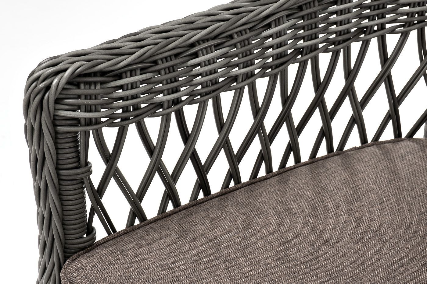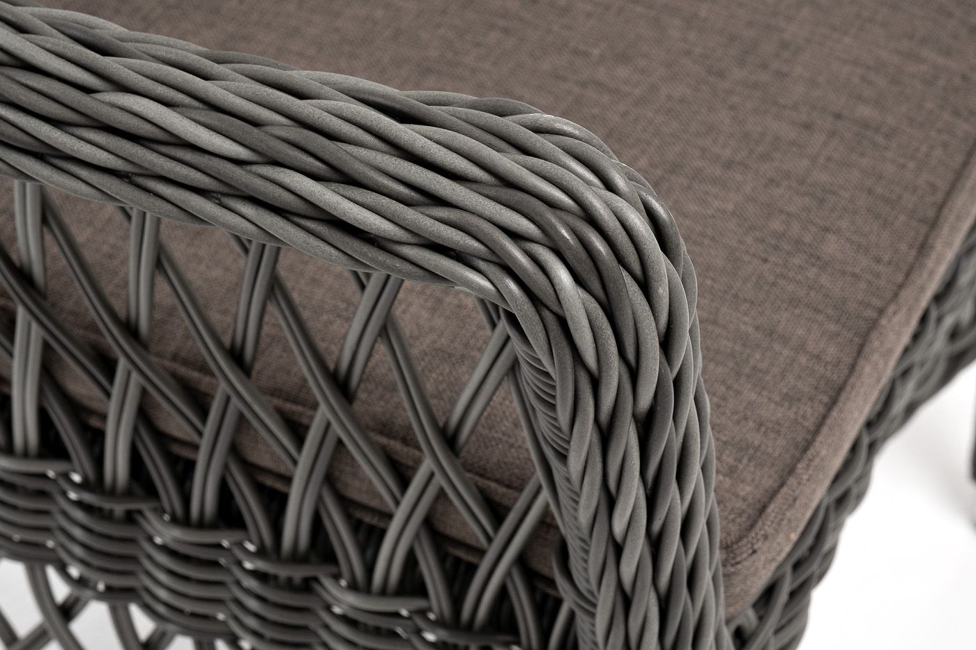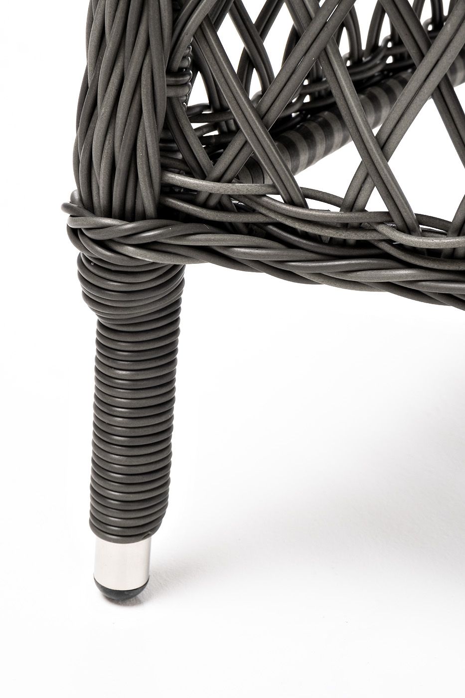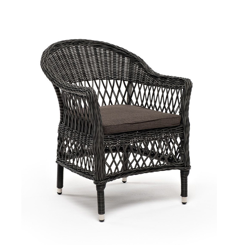 Стул оплетен вручную круглым искусственным ротангом графитового оттенка. В комплекте представлена мягкая подушка-сиденье серо-коричневого цвета. Подушка имеет съемный чехол из полиэстера (100%), плотностью 230гр/м2, с влагоотталкивающей пропиткой.