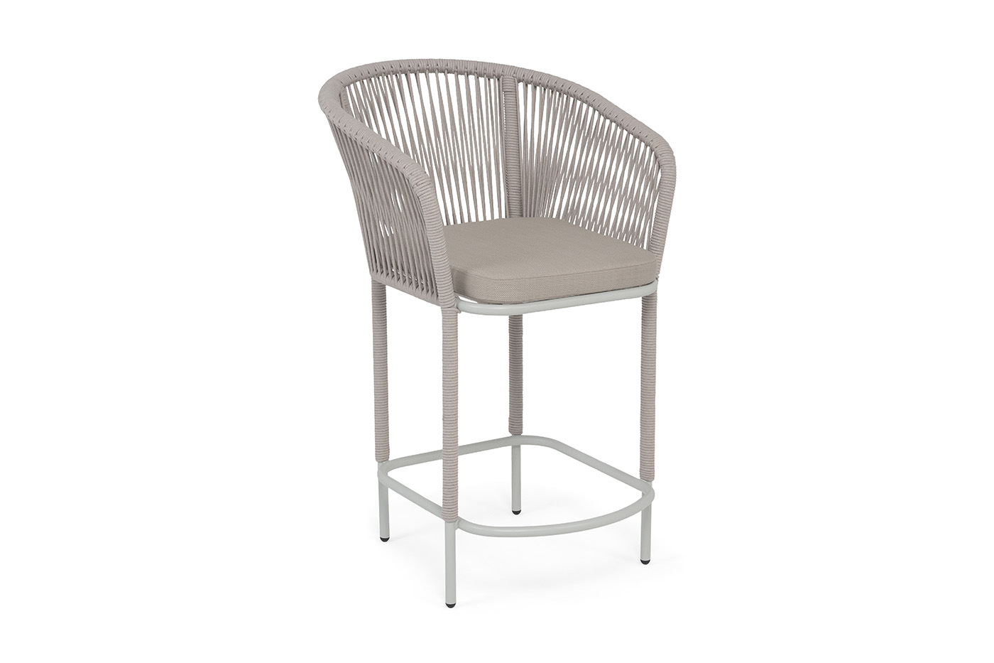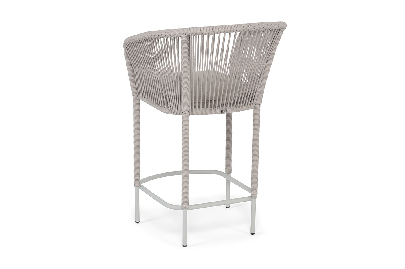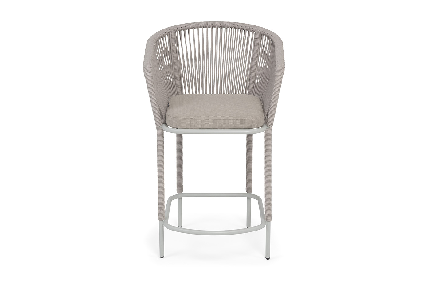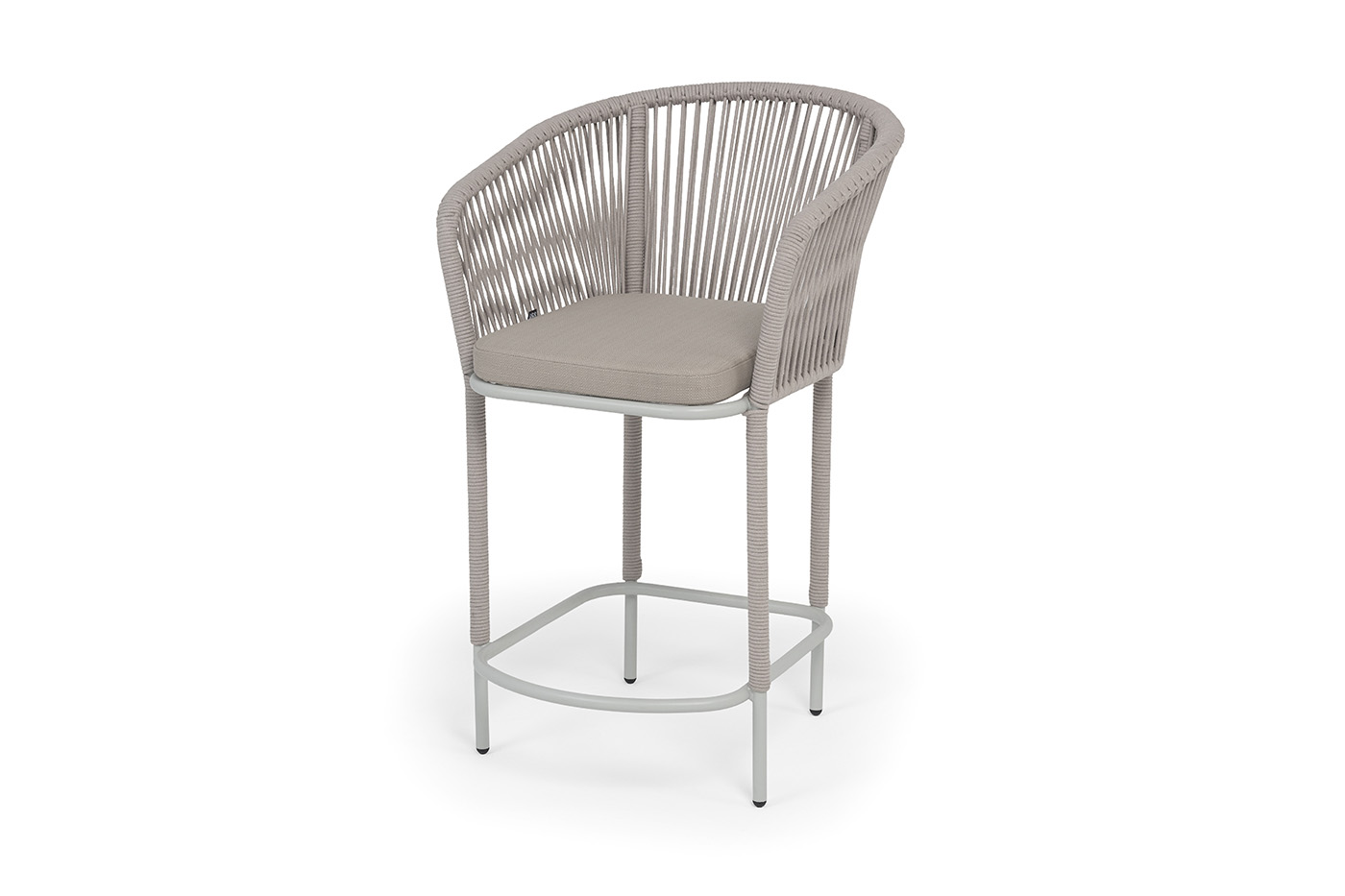 Полубарный стул «Марсель» представлен в стальном каркасе светло-серого (RAL7035) цвета, оплетен вручную эластичными синтетическими лентами из высокопрочных полиэфирных волокон, бежевого оттенка.