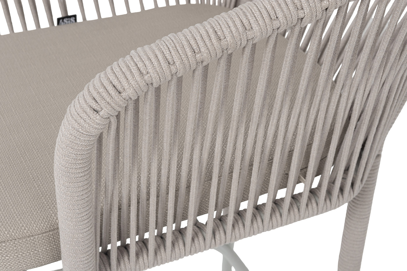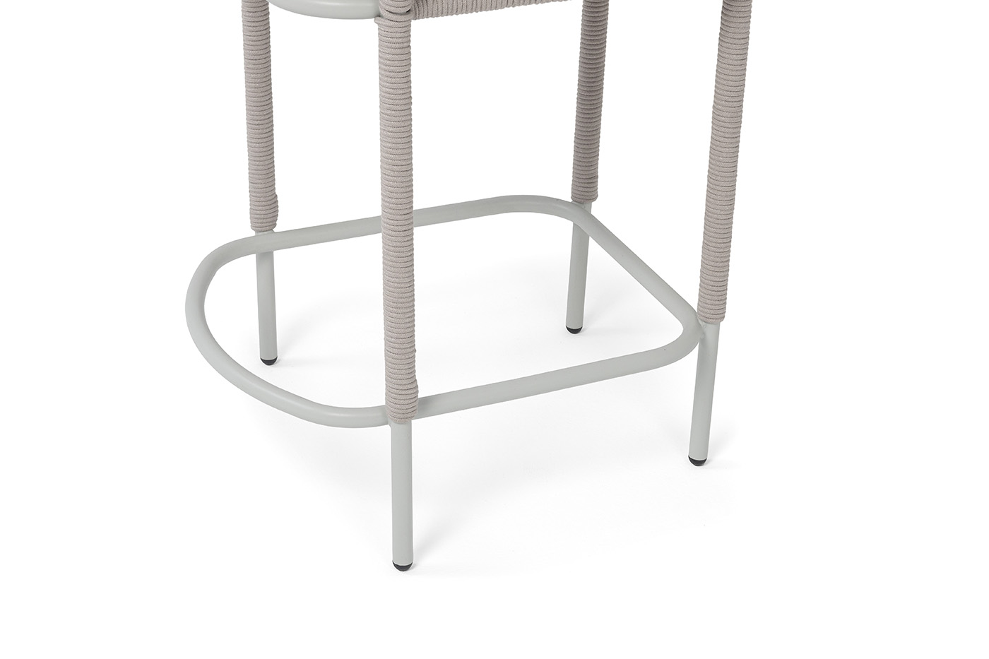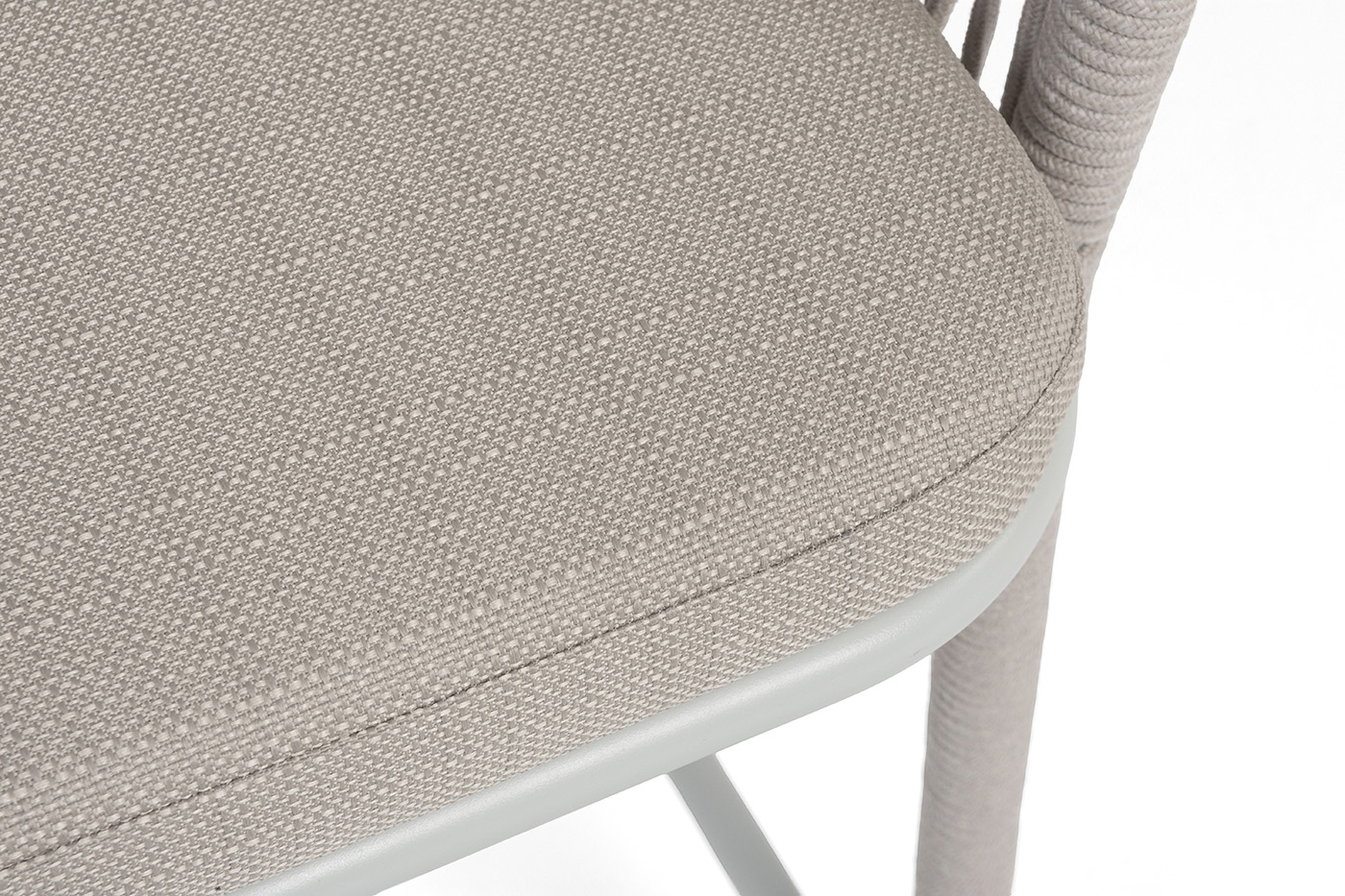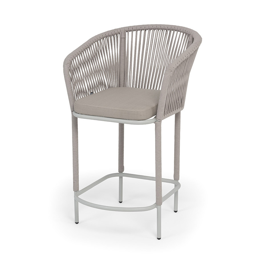 Полубарный стул «Марсель» представлен в стальном каркасе светло-серого (RAL7035) цвета, оплетен вручную эластичными синтетическими лентами из высокопрочных полиэфирных волокон, бежевого оттенка.