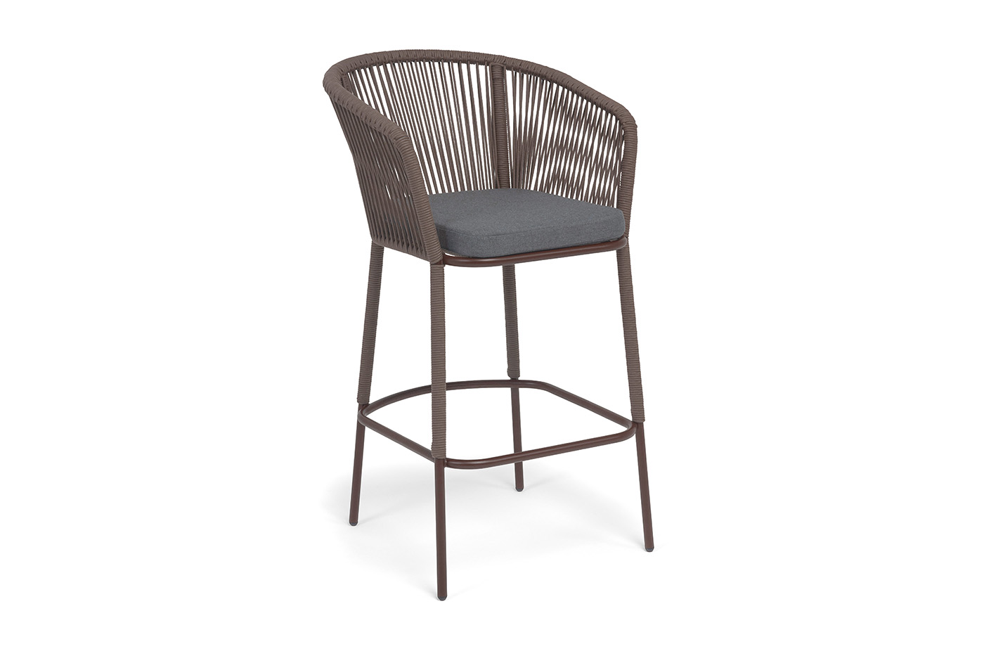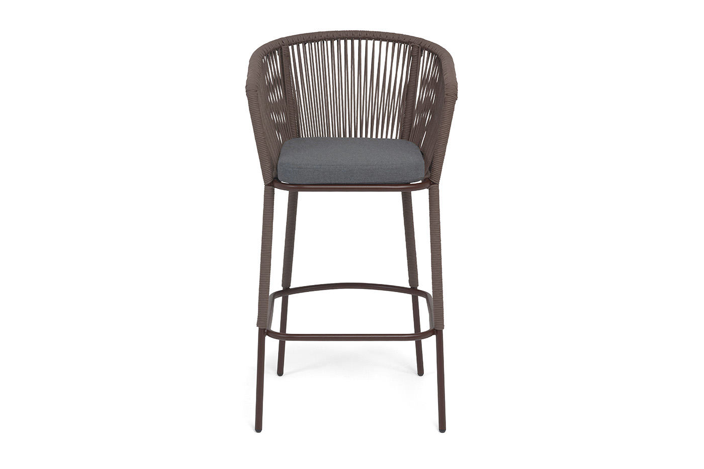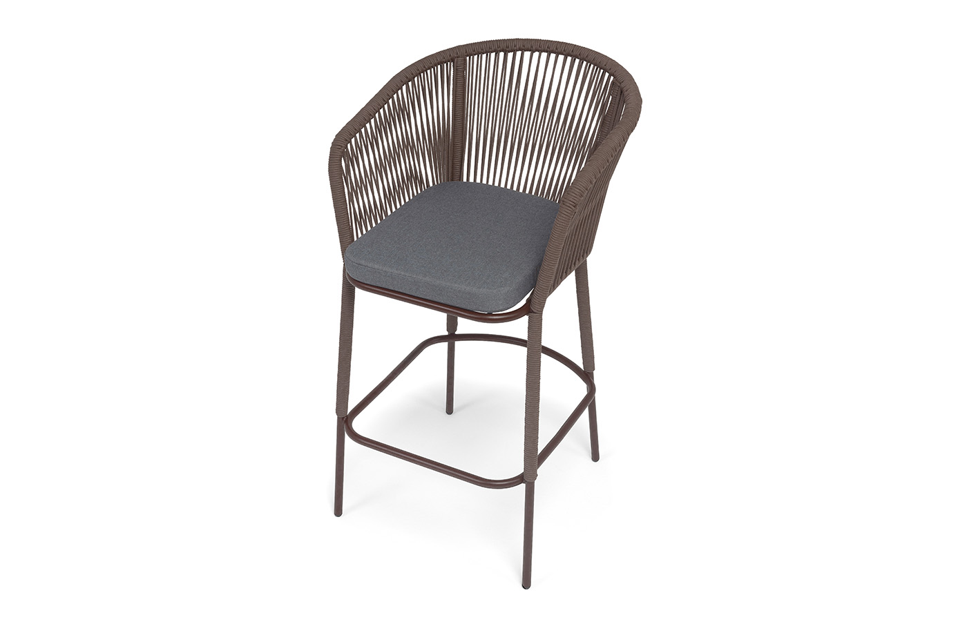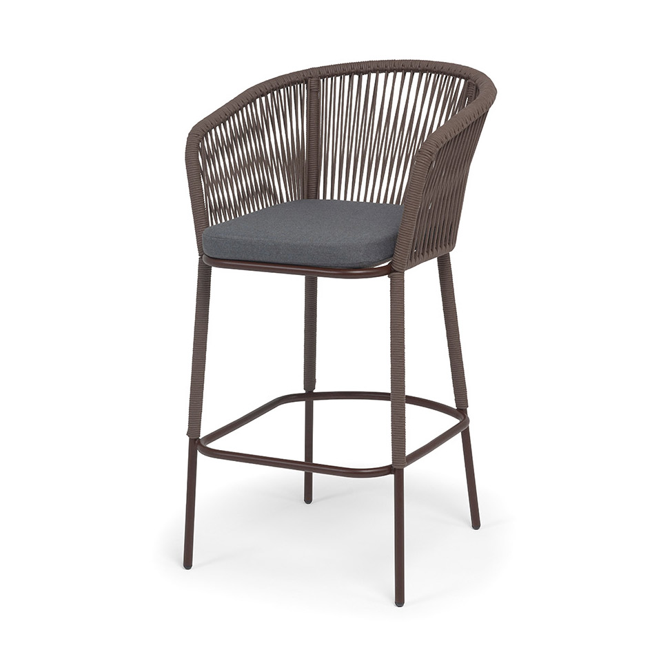 Барный стул «Марсель» представлен в стальном каркасе коричневого (RAL8016) цвета, оплетен вручную эластичными синтетическими лентами из высокопрочных полиэфирных волокон, коричневого оттенка.