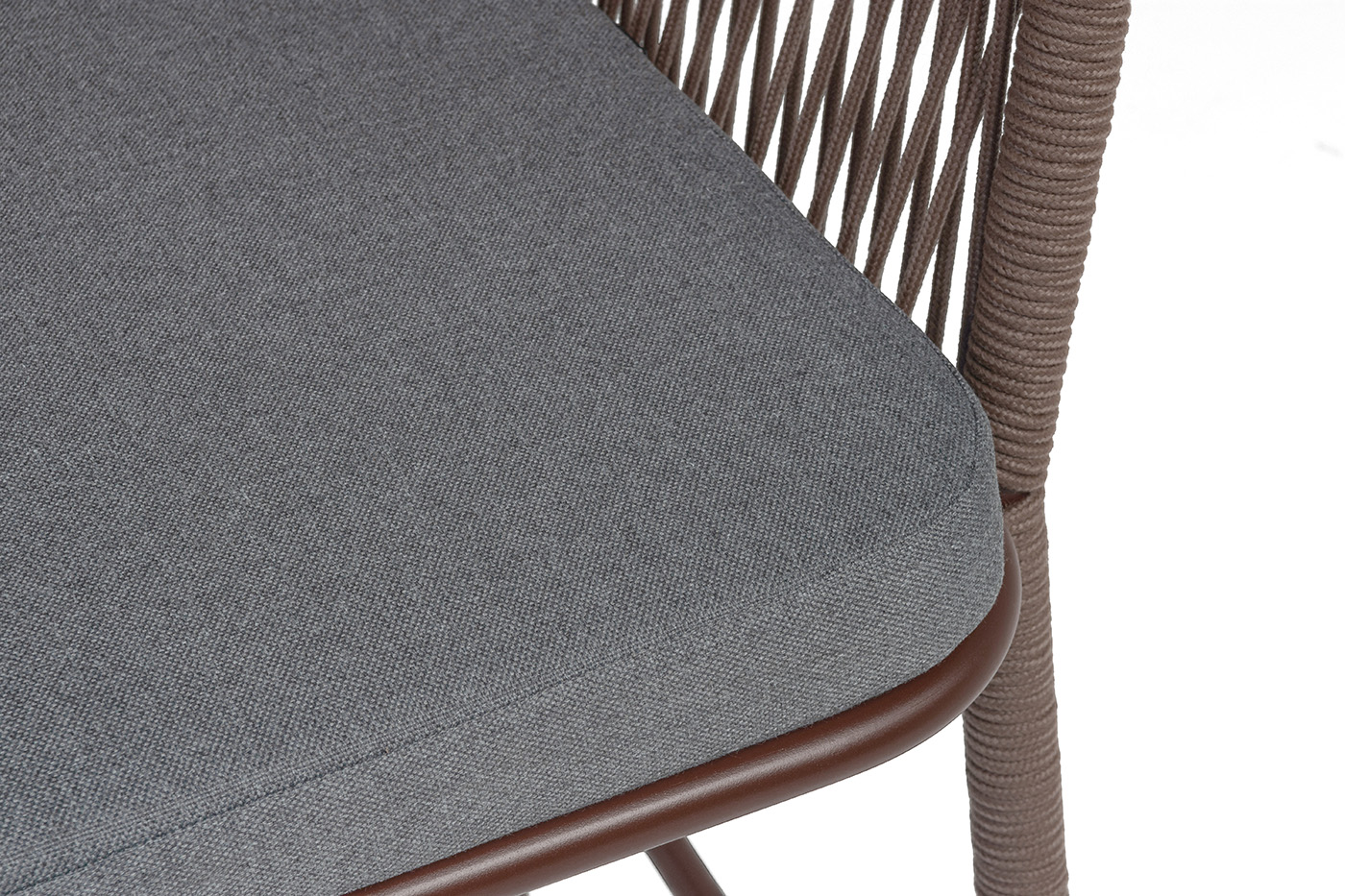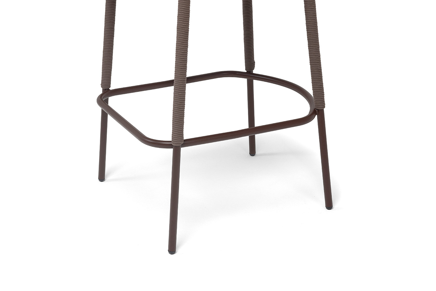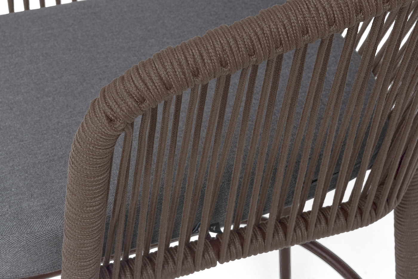 Барный стул «Марсель» представлен в стальном каркасе коричневого (RAL8016) цвета, оплетен вручную эластичными синтетическими лентами из высокопрочных полиэфирных волокон, коричневого оттенка.