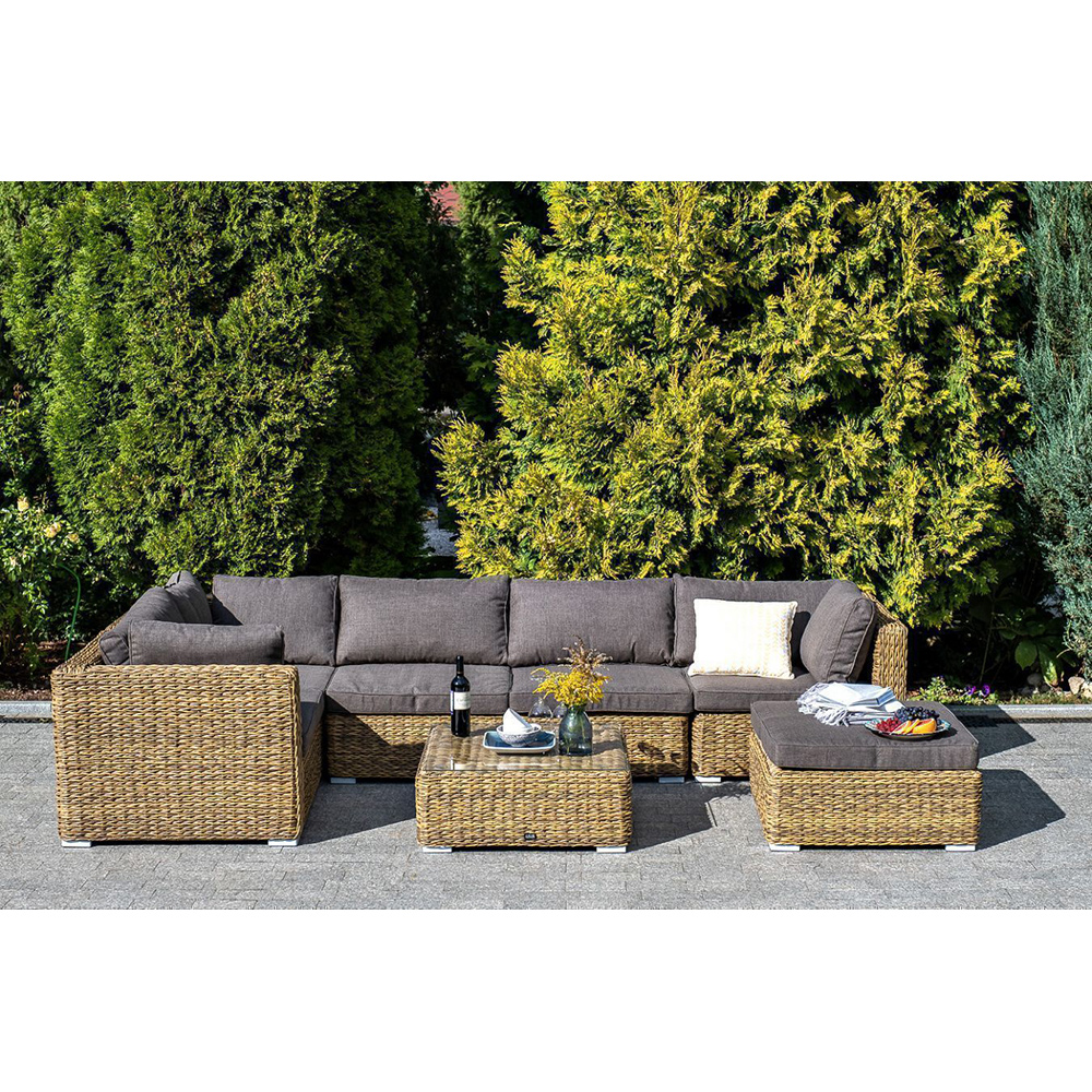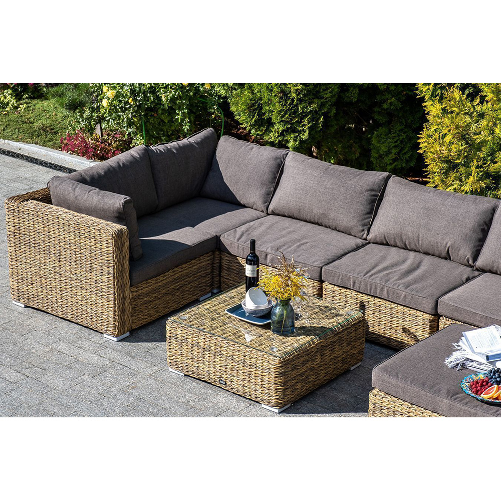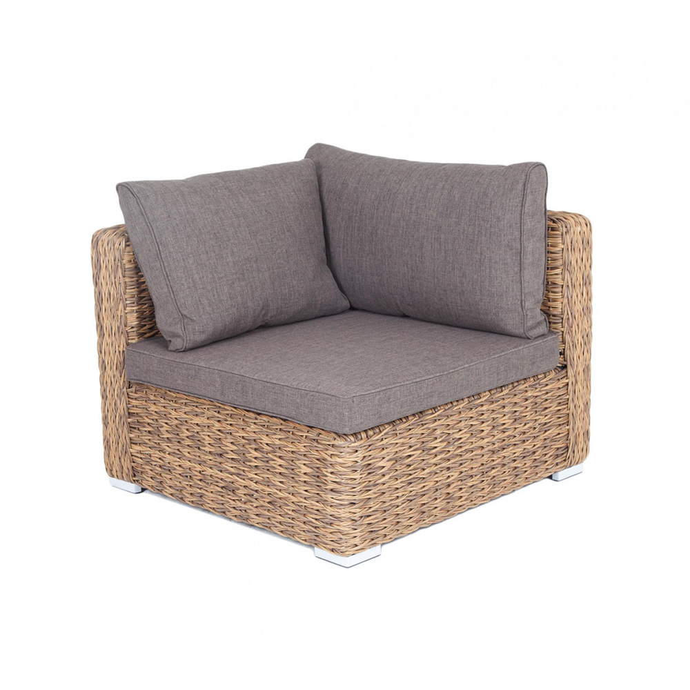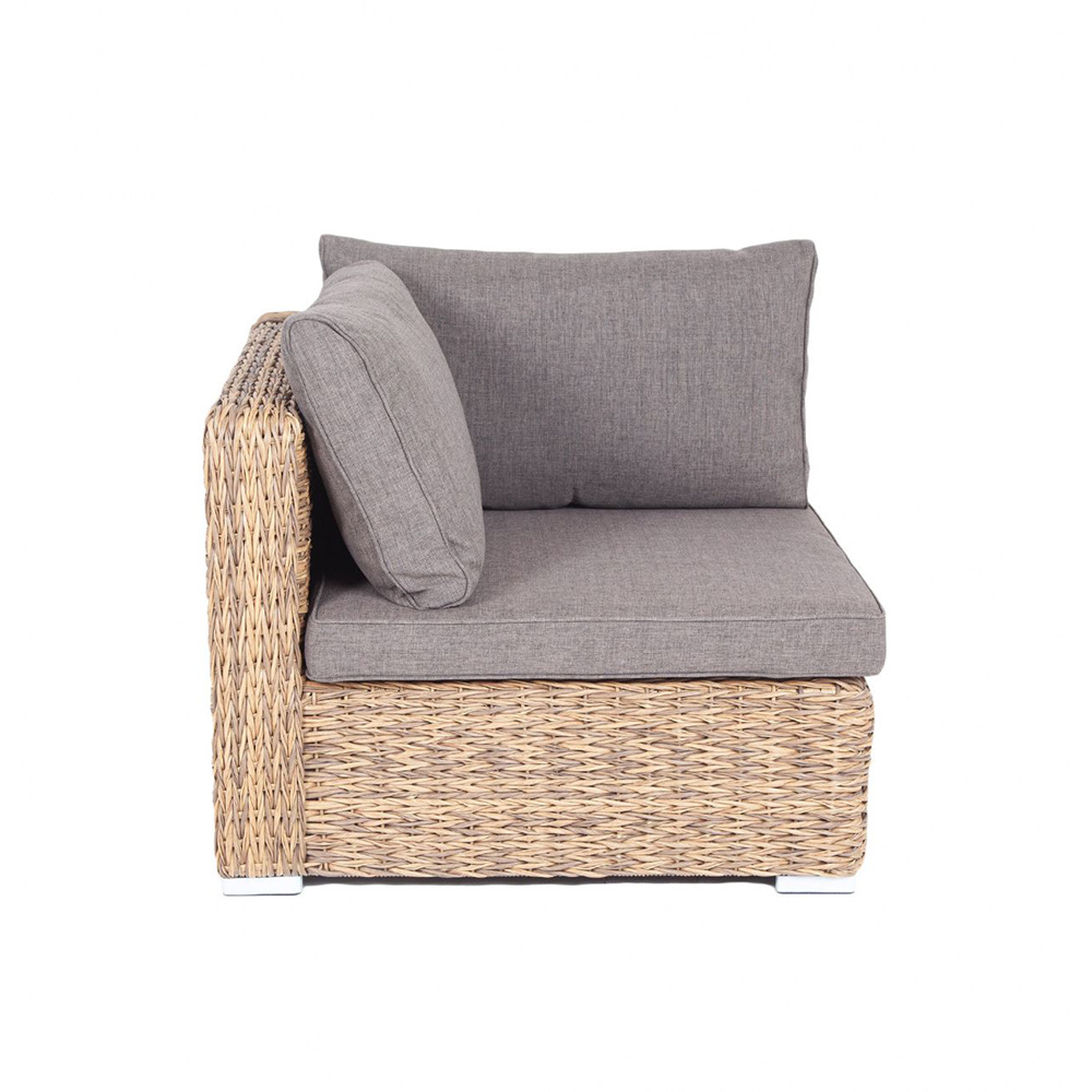"Лунго" угловой модуль из искусственного ротанга вида "гиацинт", вляется неотъемлемой частью лаунж-зоны. В своем основании имеет каркас из алюминия, который вручную оплетен ротангом соломенного цвета.В комплектации предусмотрены подушки из полиэстера, пропитанные влагоотталкивающим составом.Габариты изделия: 850х850х650 мм