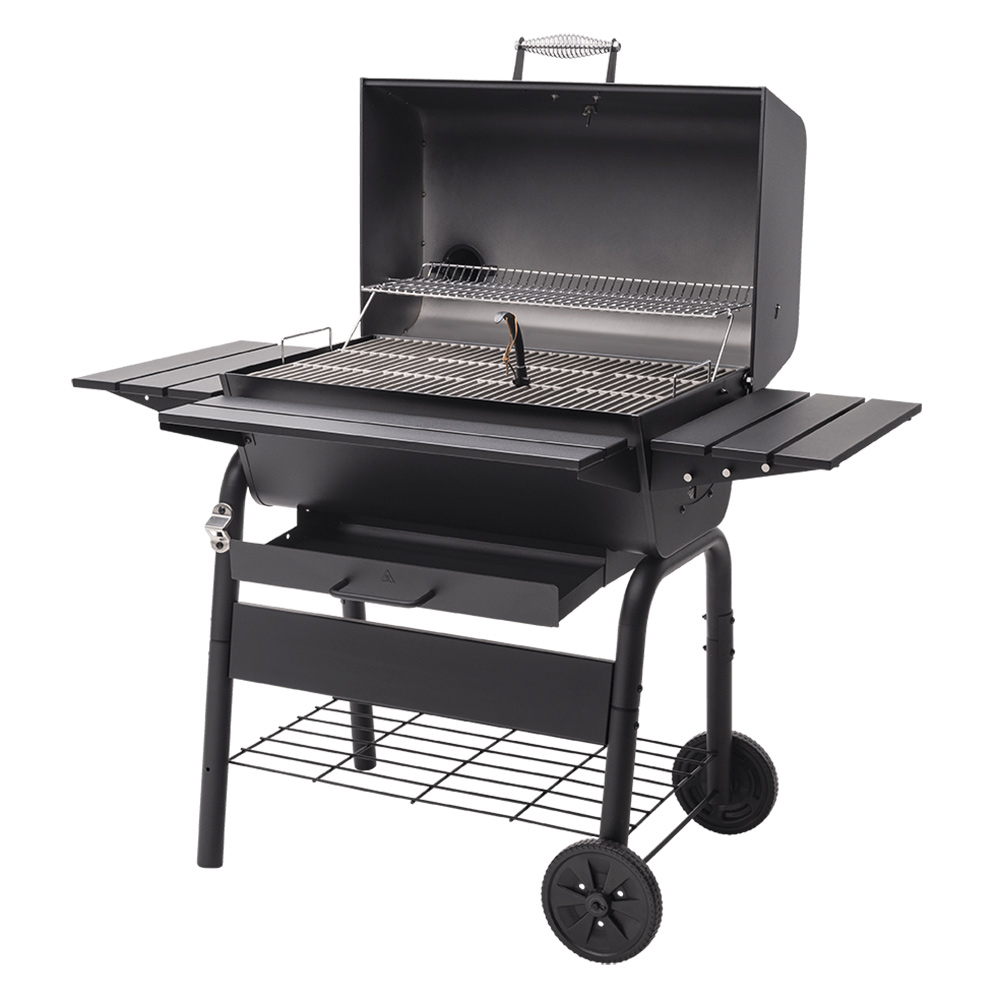 Благодаря крупным колесам гриль легко перемещается, а прочные опоры гарантируют устойчивость во время работы. Просторная нижняя полка идеально подходит для хранения угля, топлива и необходимых аксессуаров.