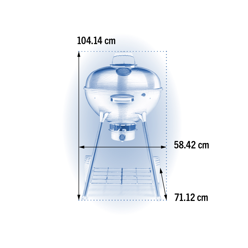 Несмотря на простоту устройства, домашний угольный гриль имеет чугунную решетку диаметром 57 см – на ней можно без труда приготовить любое блюдо, накормив семью или небольшую компанию. Температура в рабочей зоне контролируется поднятием или опусканием решетки на нужную от углей высоту, а проконтролировать жар можно не поднимая крышку – при помощи встроенного датчика.