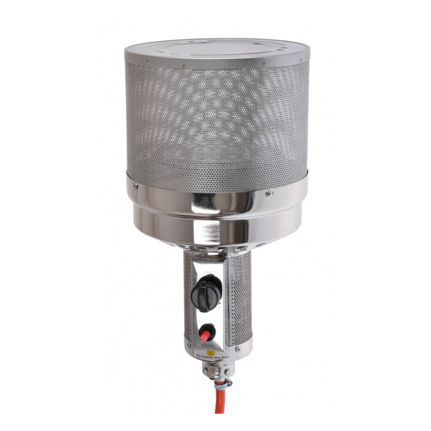 Модель относится к типу «Гриб» и работает на смеси пропана и бутана. Вертикальная конструкция занимает минимум пространства. Для устойчивости в основании предусмотрена емкость для песка. В комплекте — крепёжные лапки для фиксации к полу или грунту, а также съемные колесики для удобного перемещения.