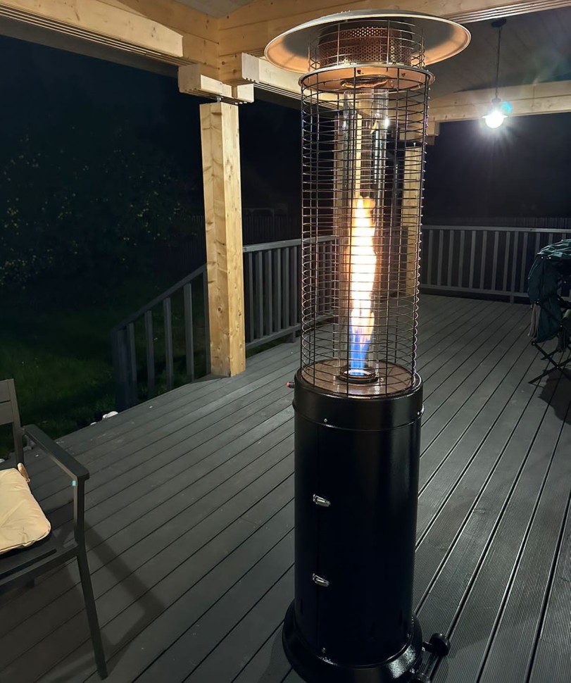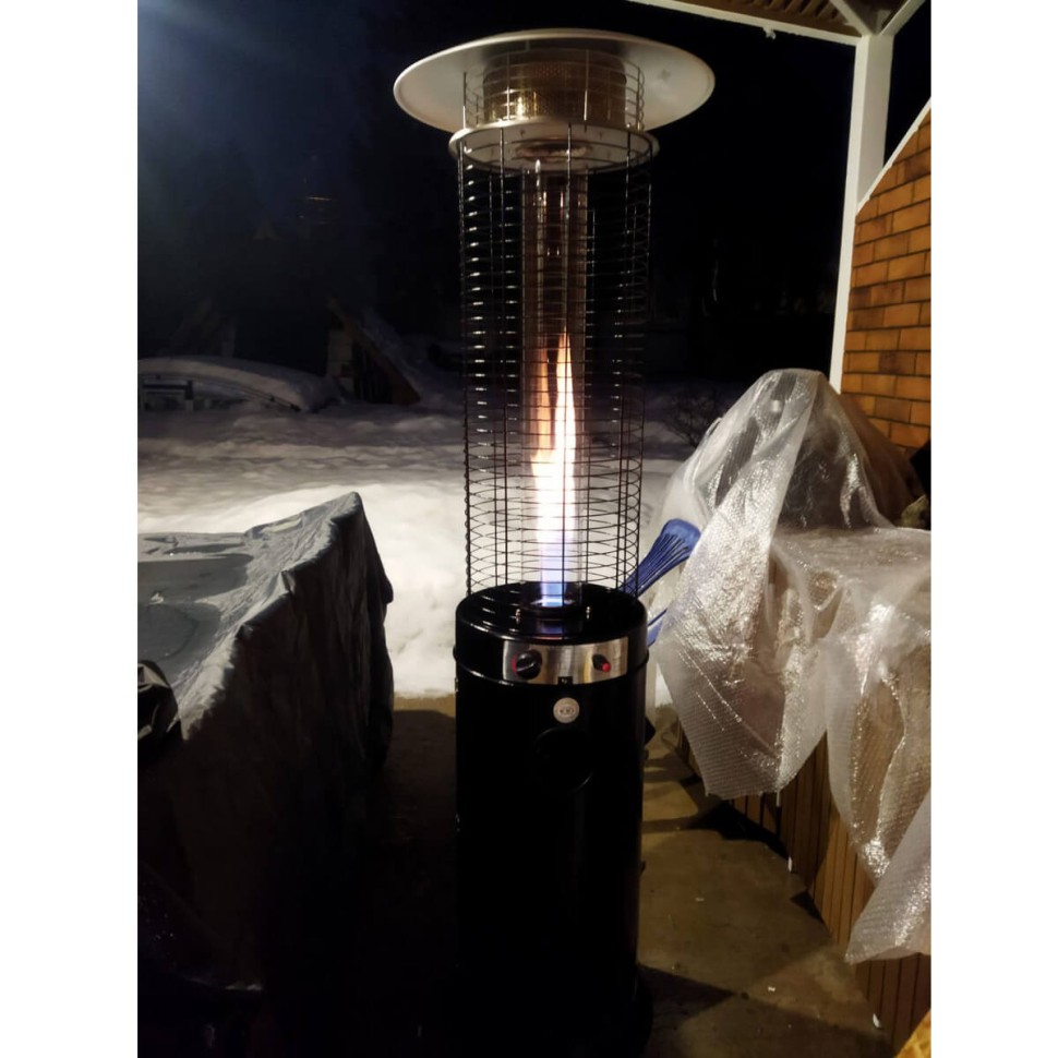 Уличный газовый обогреватель для террасы WWT 13D PRO Black mini выполнен в форме колбы, оканчивающейся алюминиевым отражателем. Нижняя его половина закрытая, а верхняя представляет из себя прозрачную трубку из огнеупорного стекла, внутри которой горит пламя. Такой дизайн выглядит привлекательно сам по себе, а в сумерках он еще и создает особую, романтическую атмосферу.